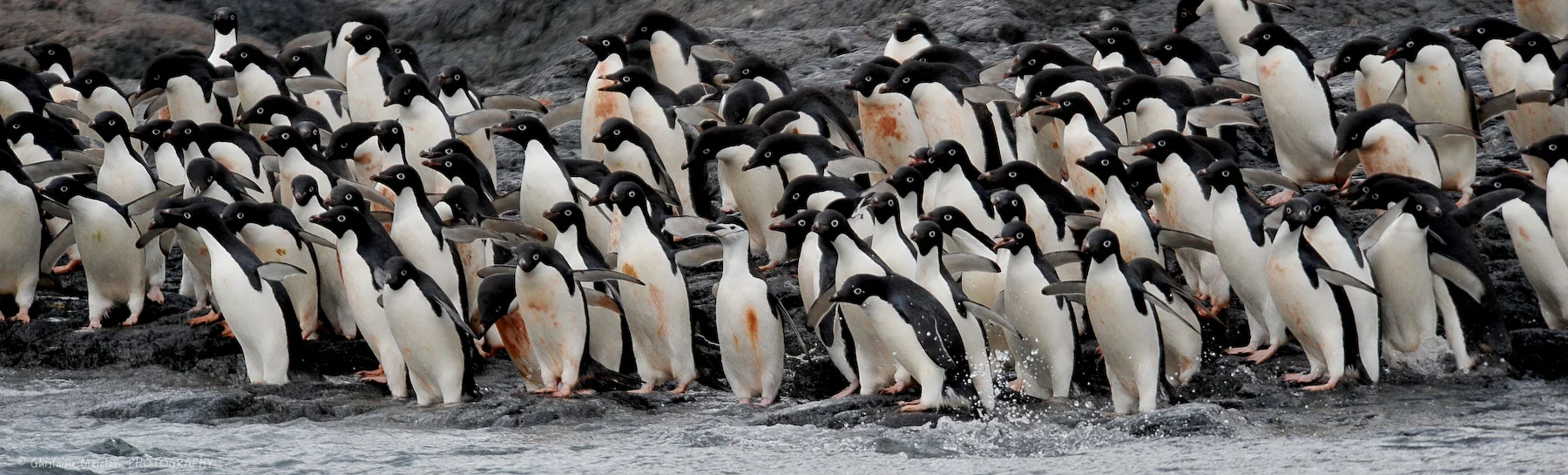 Depuis le zodiac, nous apercevons des milliers de points noirs et blancs sur des parois rocheuses partiellement recouvertes de neige et colorées par endroit en rose. Ce sont les colonies de manchots, il y a plus de 10000 couples de manchots Adélie avec leurs bébés. Le manchot Adélie se reconnait par sa tête toute noire (alors que le manchot jugulaire a la tête blanche et il porte un collier noir autour du cou).