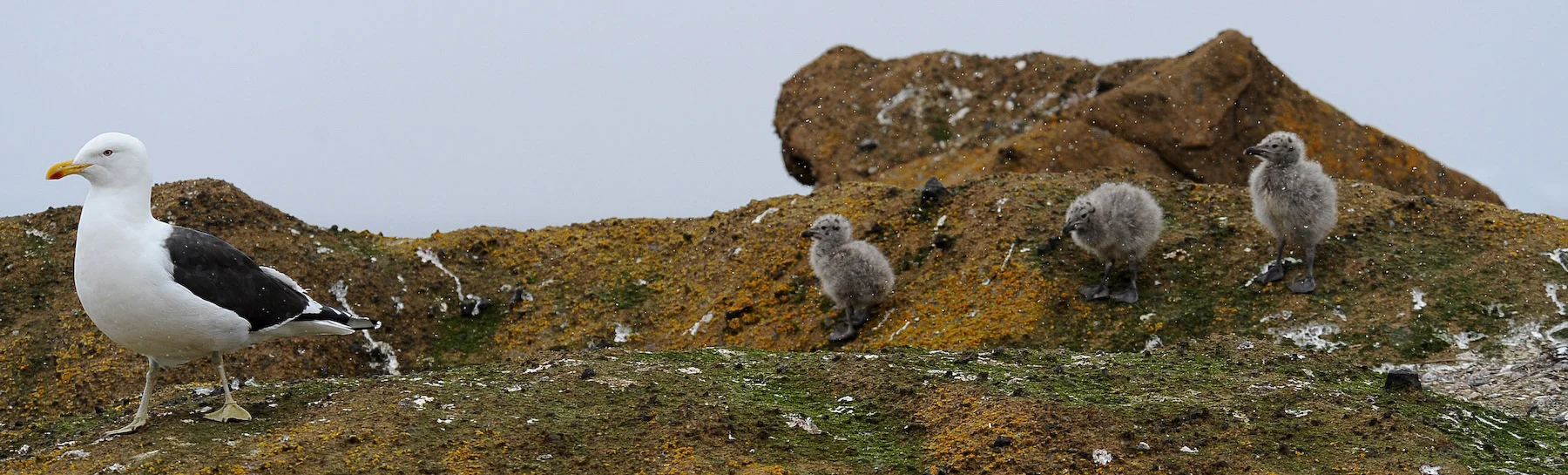 Il y a également des colonies de goélands avec leurs petits fraichement sortis de la coquille, proies d'excellence pour les prédateurs et maman doit veiller