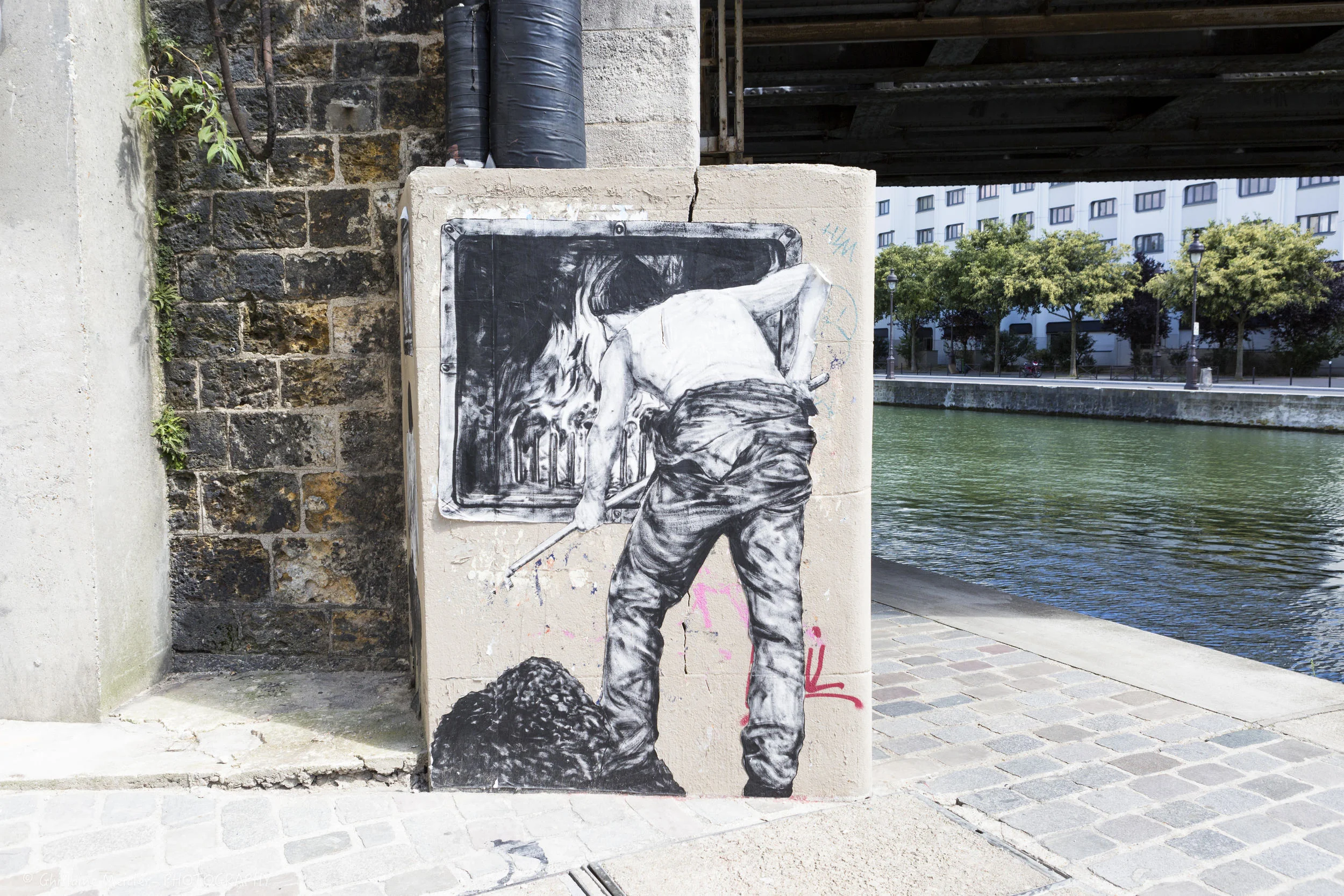 Artiste graffiti travaillant sur Paris, il a développé un travail abstrait par le biais de formes en volume, dans des lieux incongrus. Dès lors, il s'efforce de sortir le graffiti de ses conventions en le faisant évoluer sur des murs, des plafonds et ici sur le canal, dans une cabine téléphonique. Il dynamise et donne du volume à son graffiti en jouant sur les différents plans, les murs, le sol et l'environnement