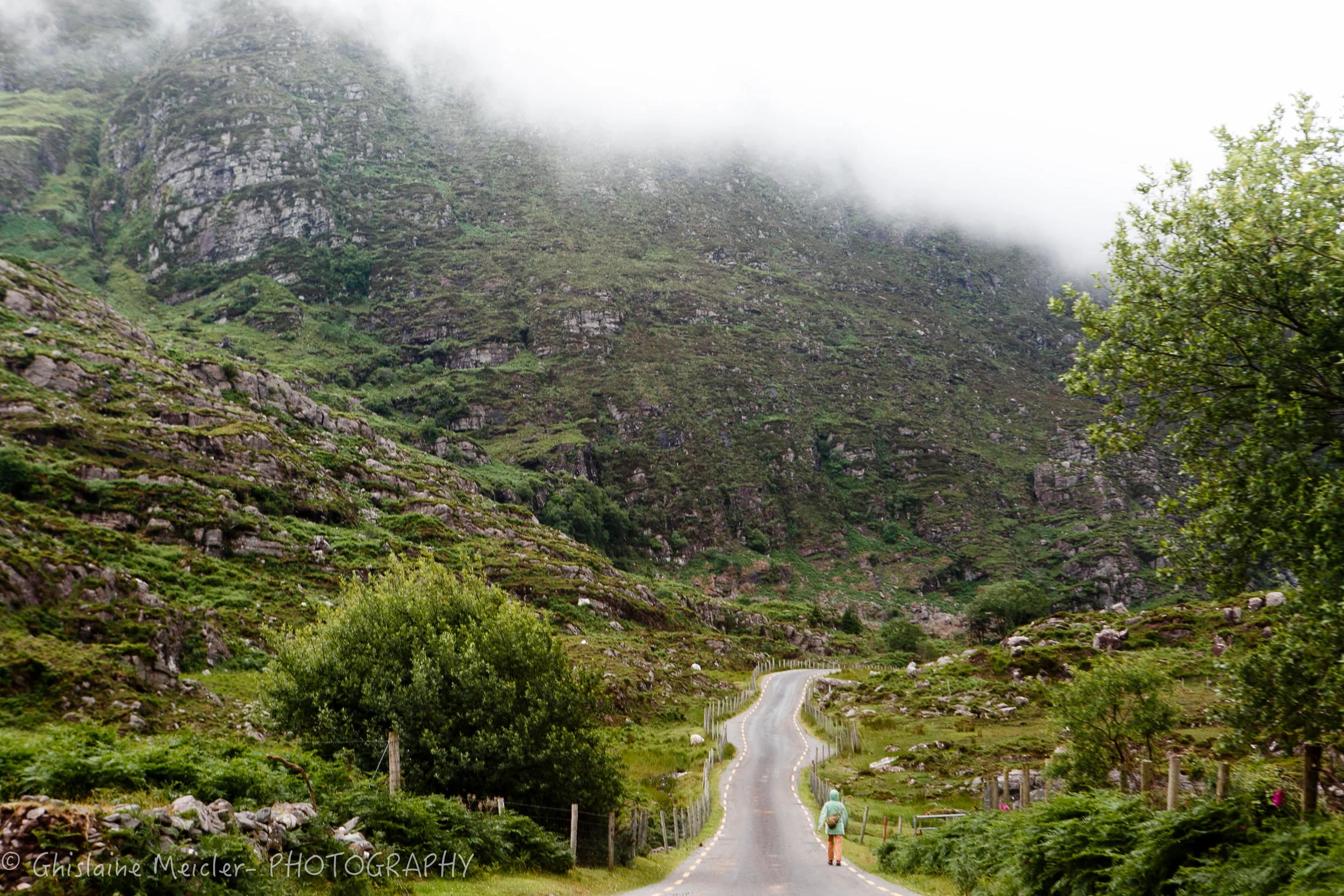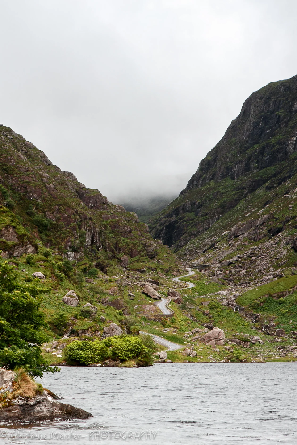 Au départ de Kate Kearne's cottage, équipés de nos manteaux coupe-vent, tenues imperméables, bonnets, protection pour appareil photo... nous empruntons cette route, interdite aux voitures sauf pour les habitants du coin. Elle commence par une petite montée qui nous amène à une 1ère vallée abritant un lac aux eaux sombres et soufflées par le vent qui s'engouffre dans ce col. Après avoir longé le lac sur toute sa longueur, la route grimpe de manière abrupte le long d'un défilé étroit entre les montagnes sombres et menaçantes jusqu'à une 2ème vallée évasée, dans laquelle s'étalent prairies et tourbières, occupées par de nombreux moutons et chevaux irlandais.