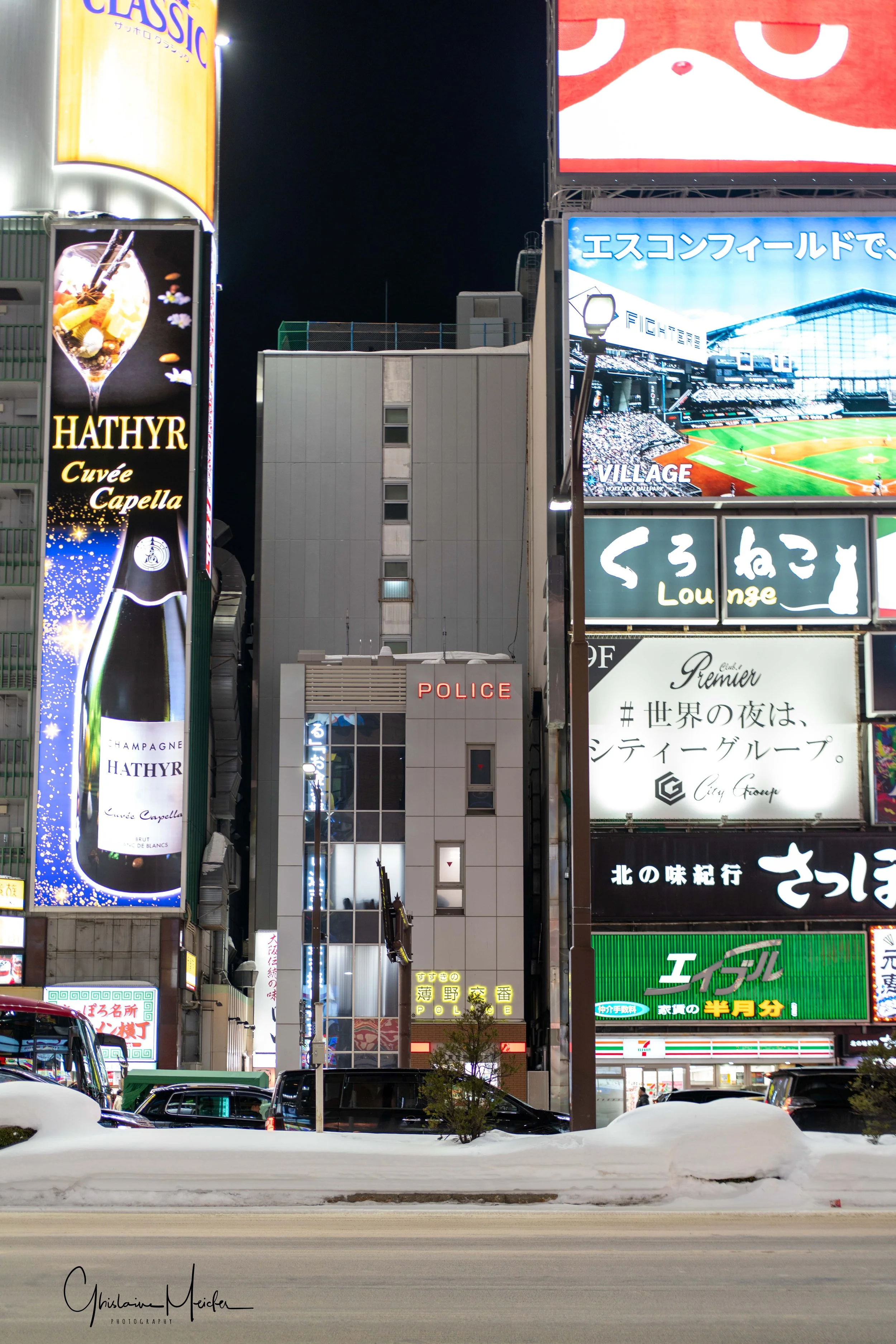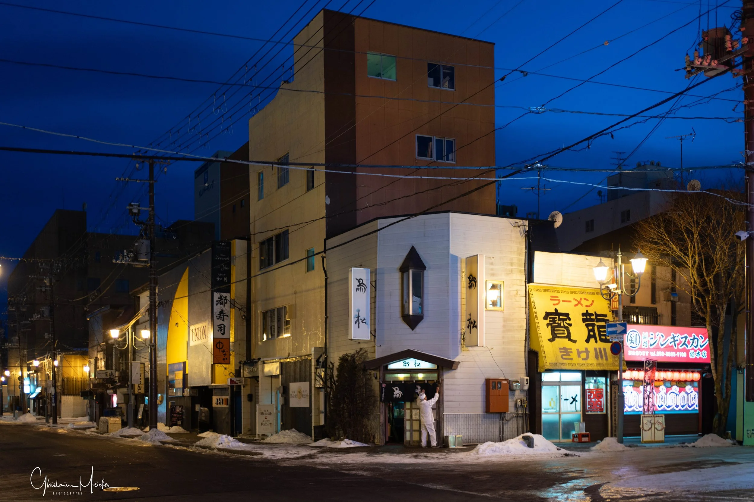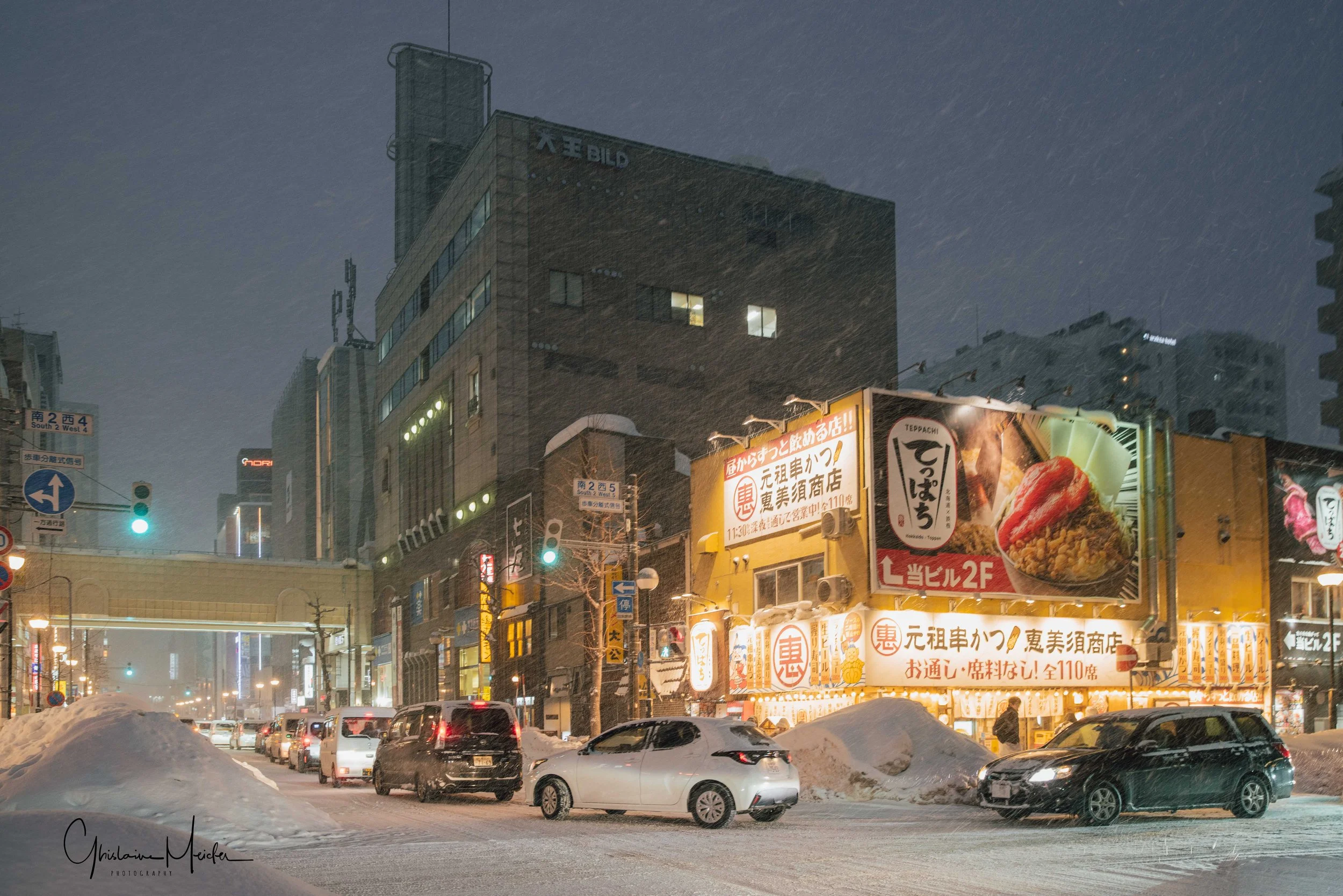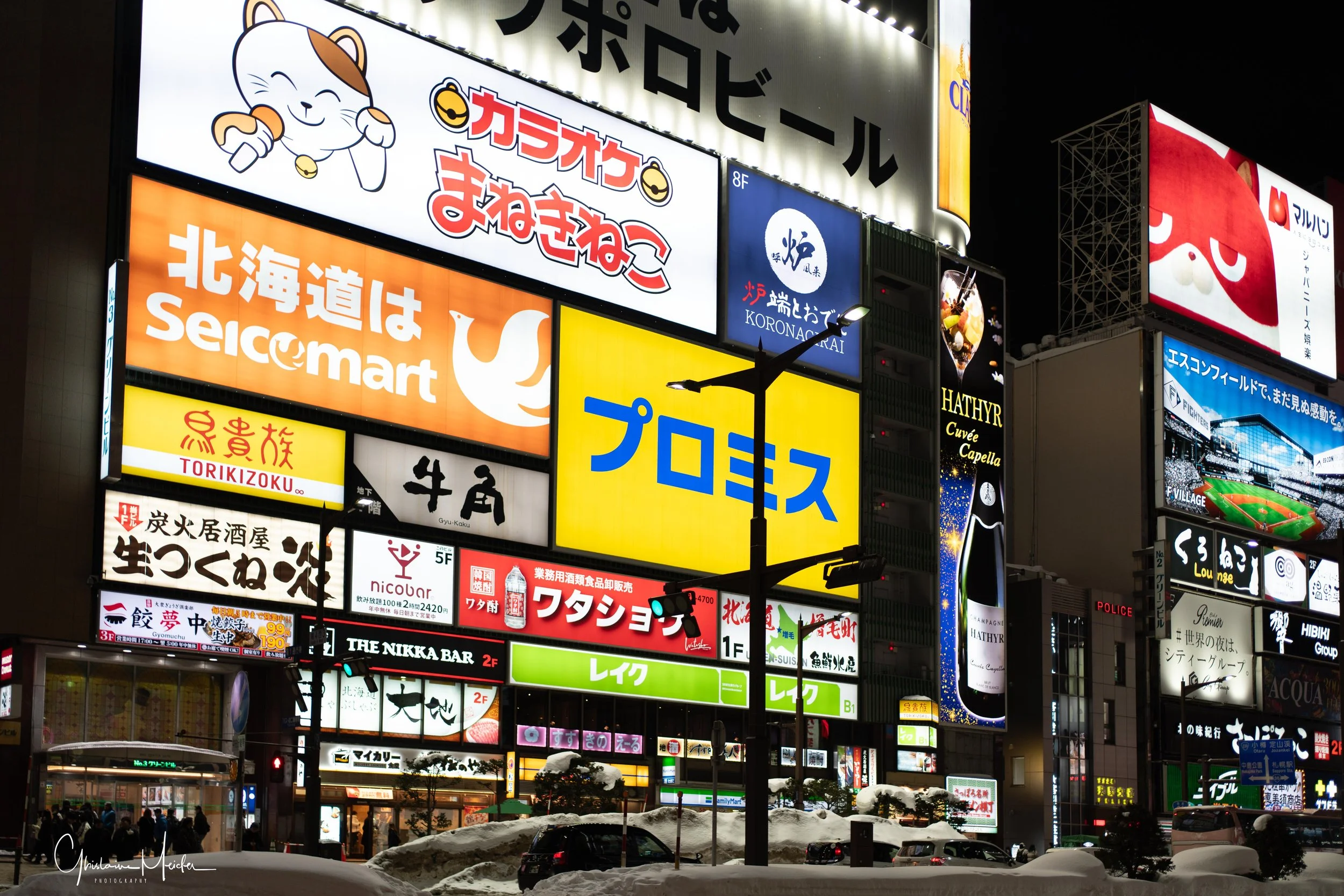 Retour sur Sapporo avec la neige qui recommence à tomber et redonne à la ville cette ambiance si sympathique. Nous écourtons notre rituel bain dans le onsen pour sillonner les rues de la ville, armés de notre appareil photo. Il est 17h30 et la nuit test déjà tombée sur Sapporo, les japonais s’empressent de rentrer chez eux et de fuir le vent glacial qui s’abat sur la ville, alors que d’autres préfèrent retrouver la chaleur réconfortante d’un restaurant
