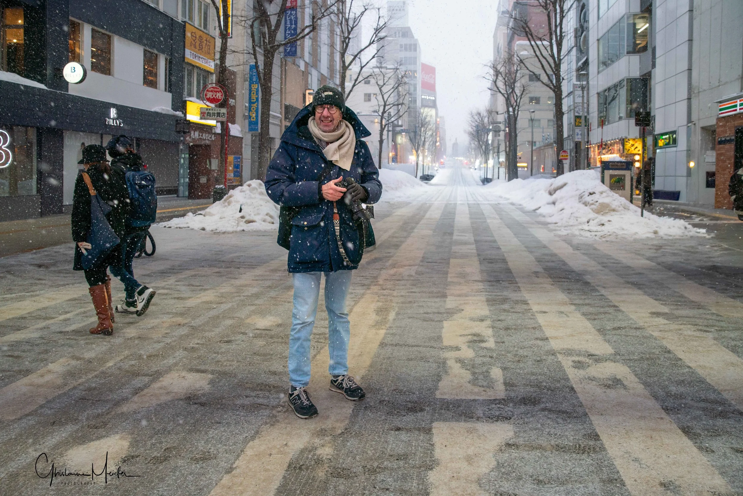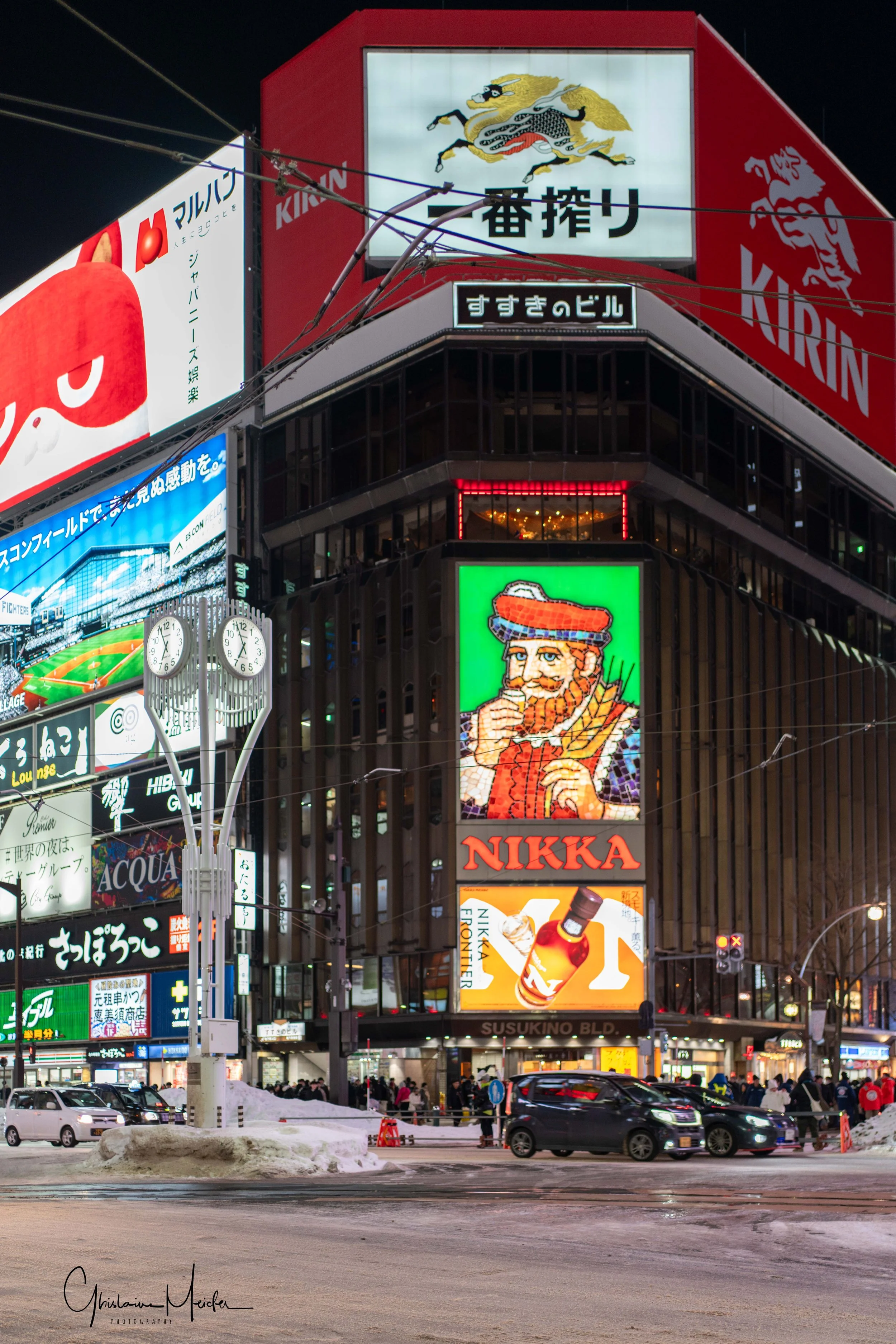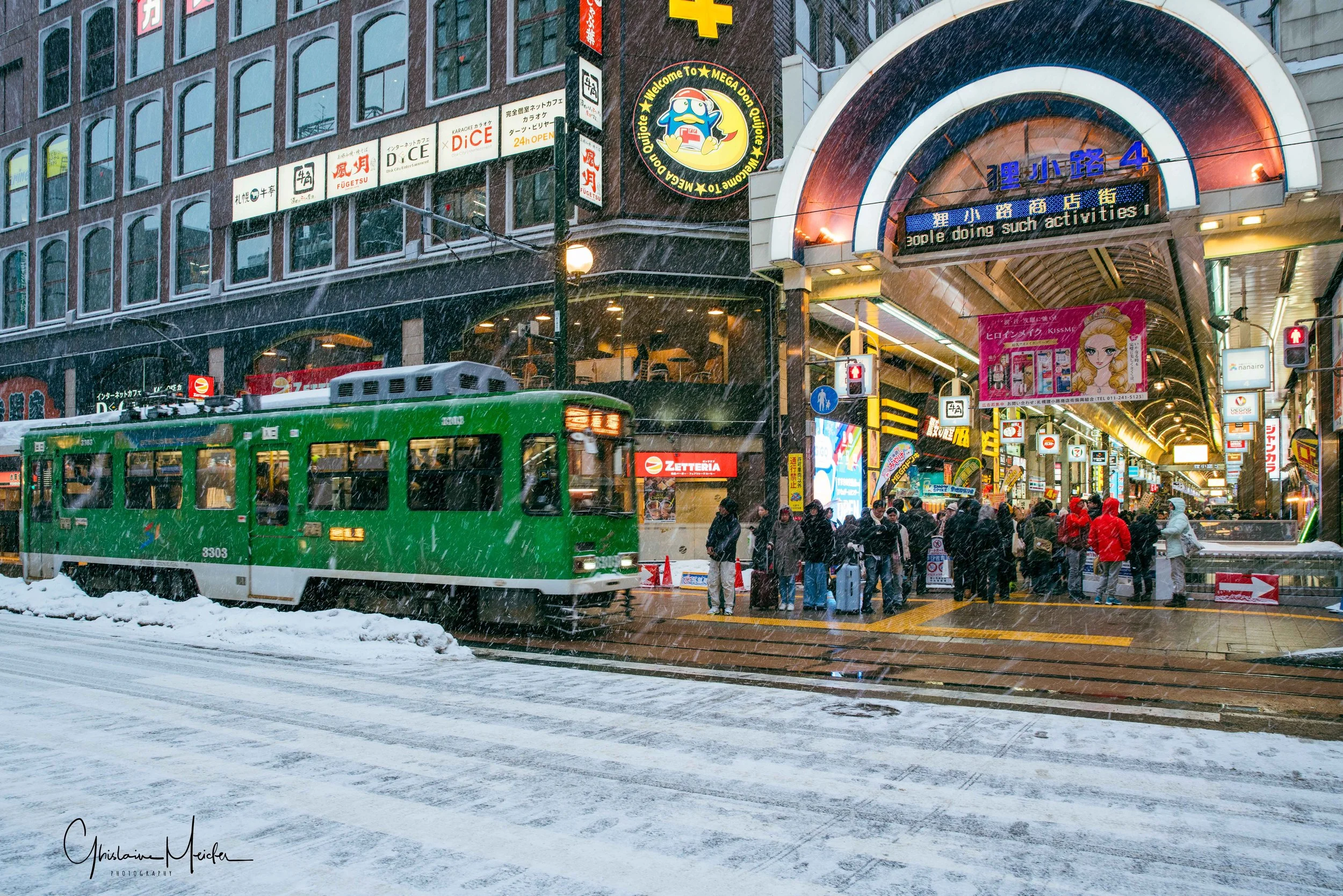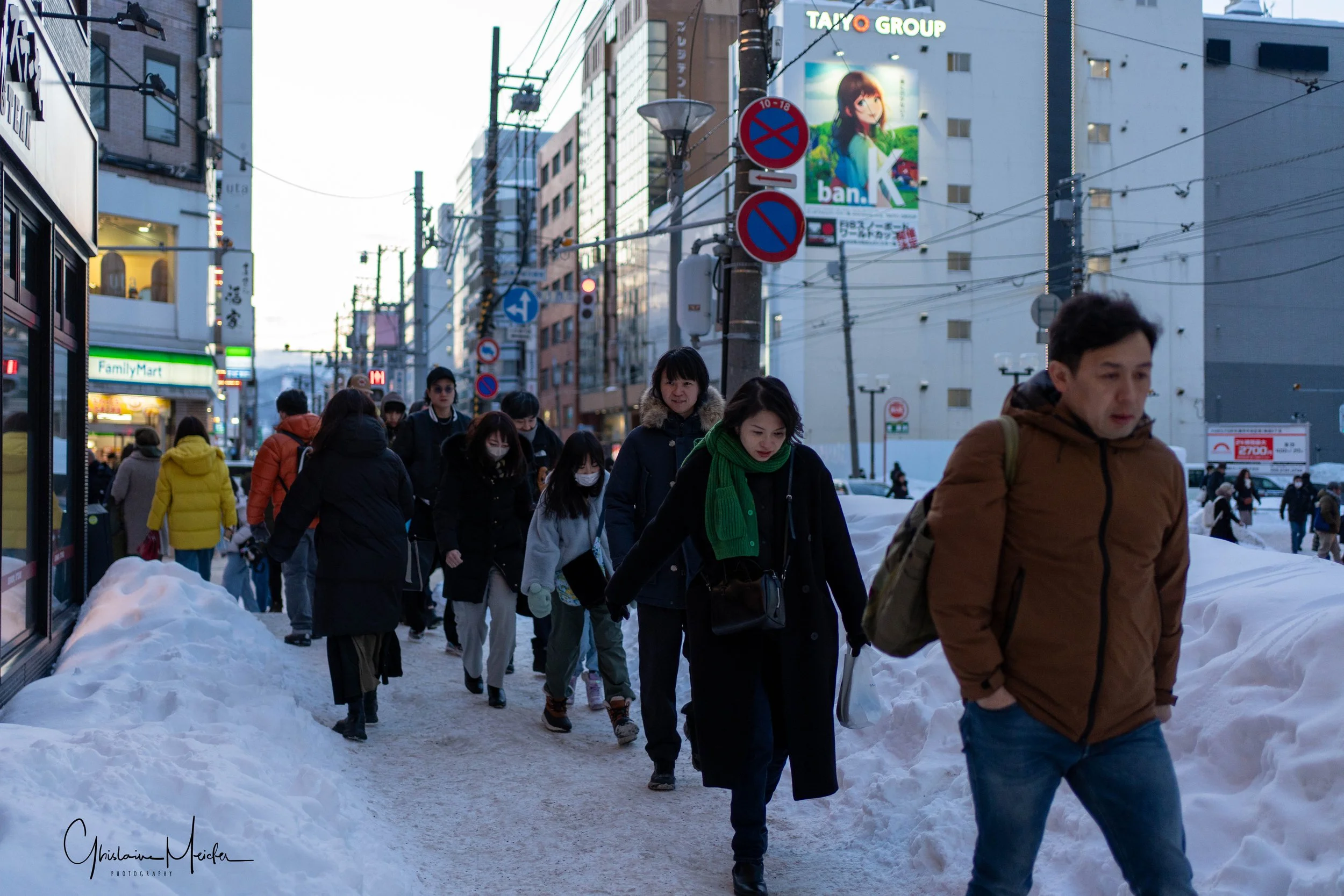 Retour sur Sapporo avec la neige qui recommence à tomber et redonne à la ville cette ambiance si sympathique. Nous écourtons notre rituel bain dans le onsen pour sillonner les rues de la ville, armés de notre appareil photo. Il est 17h30 et la nuit test déjà tombée sur Sapporo, les japonais s’empressent de rentrer chez eux et de fuir le vent glacial qui s’abat sur la ville, alors que d’autres préfèrent retrouver la chaleur réconfortante d’un restaurant