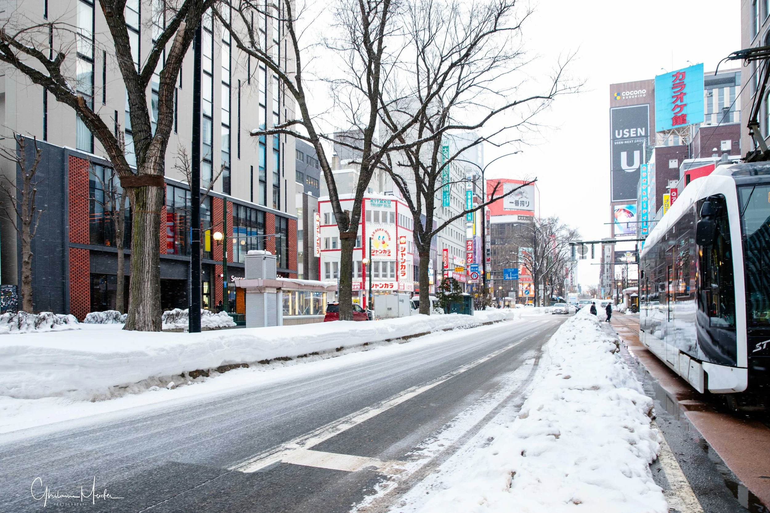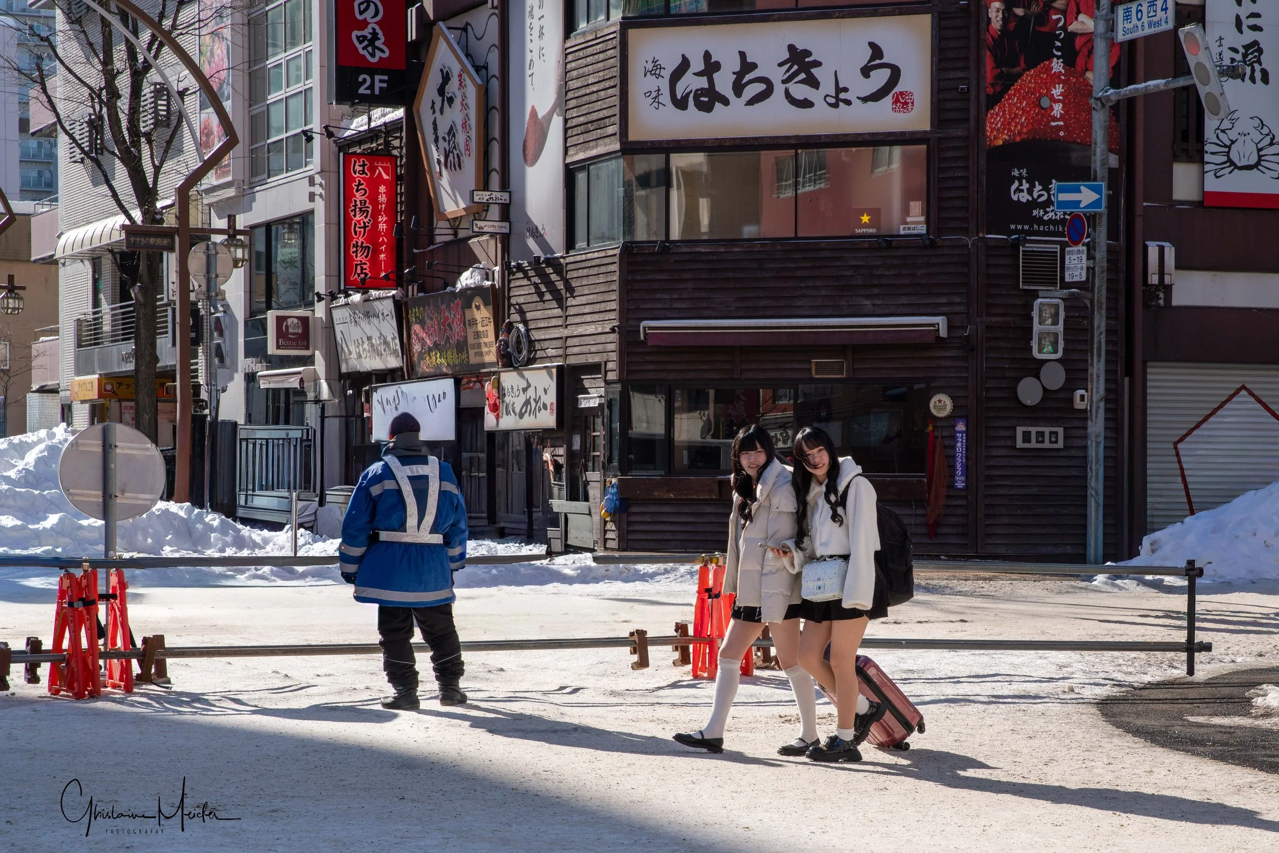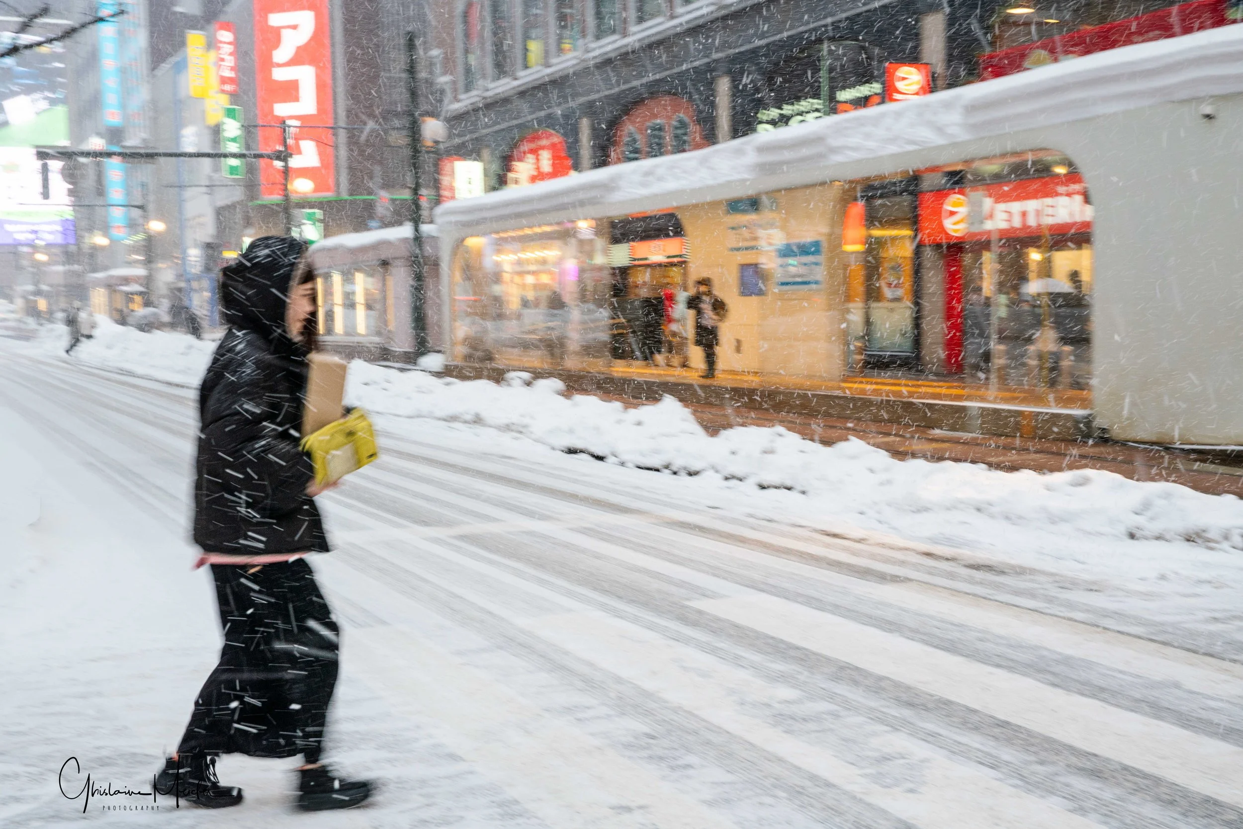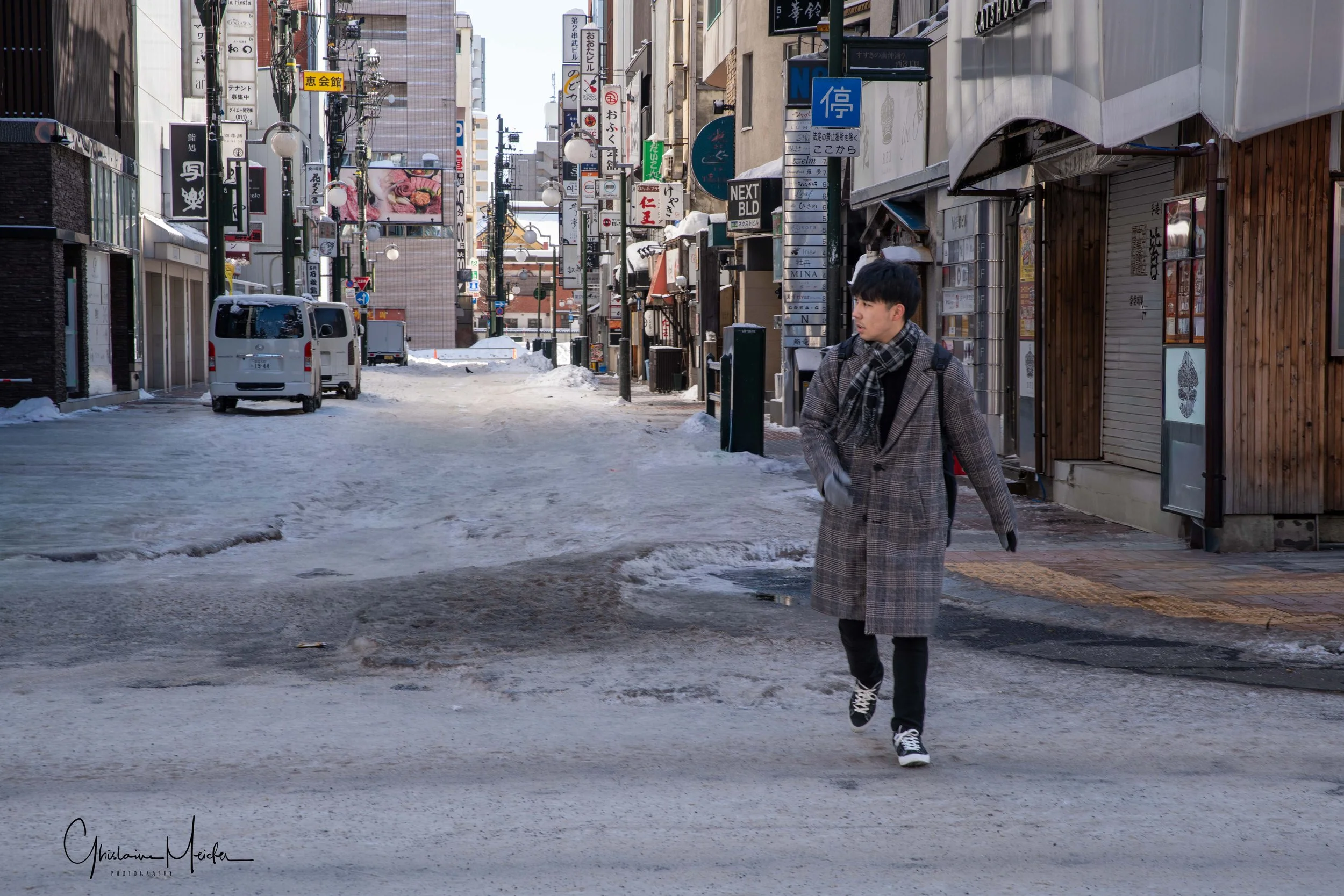 Retour sur Sapporo avec la neige qui recommence à tomber et redonne à la ville cette ambiance si sympathique. Nous écourtons notre rituel bain dans le onsen pour sillonner les rues de la ville, armés de notre appareil photo. Il est 17h30 et la nuit test déjà tombée sur Sapporo, les japonais s’empressent de rentrer chez eux et de fuir le vent glacial qui s’abat sur la ville, alors que d’autres préfèrent retrouver la chaleur réconfortante d’un restaurant
