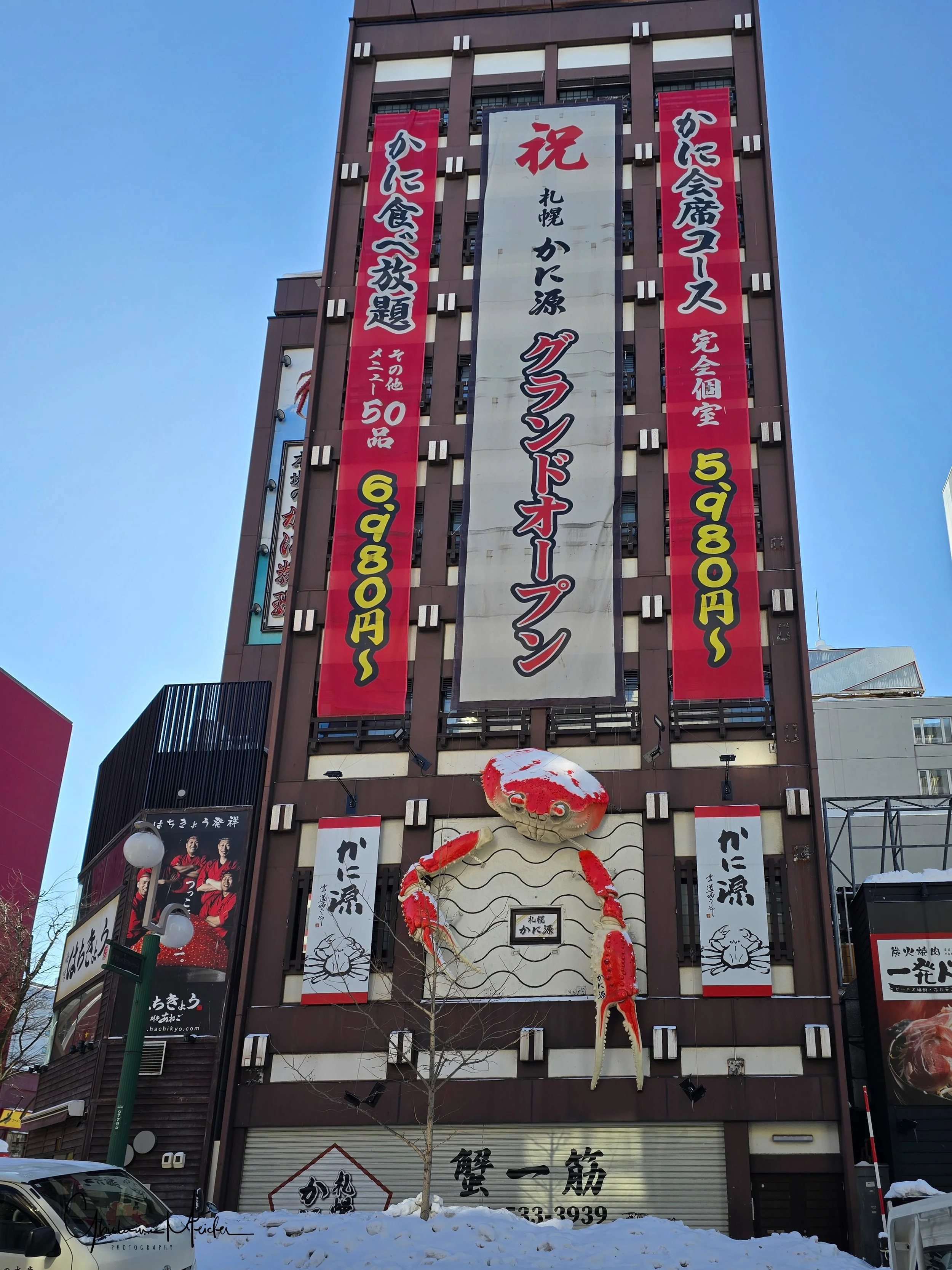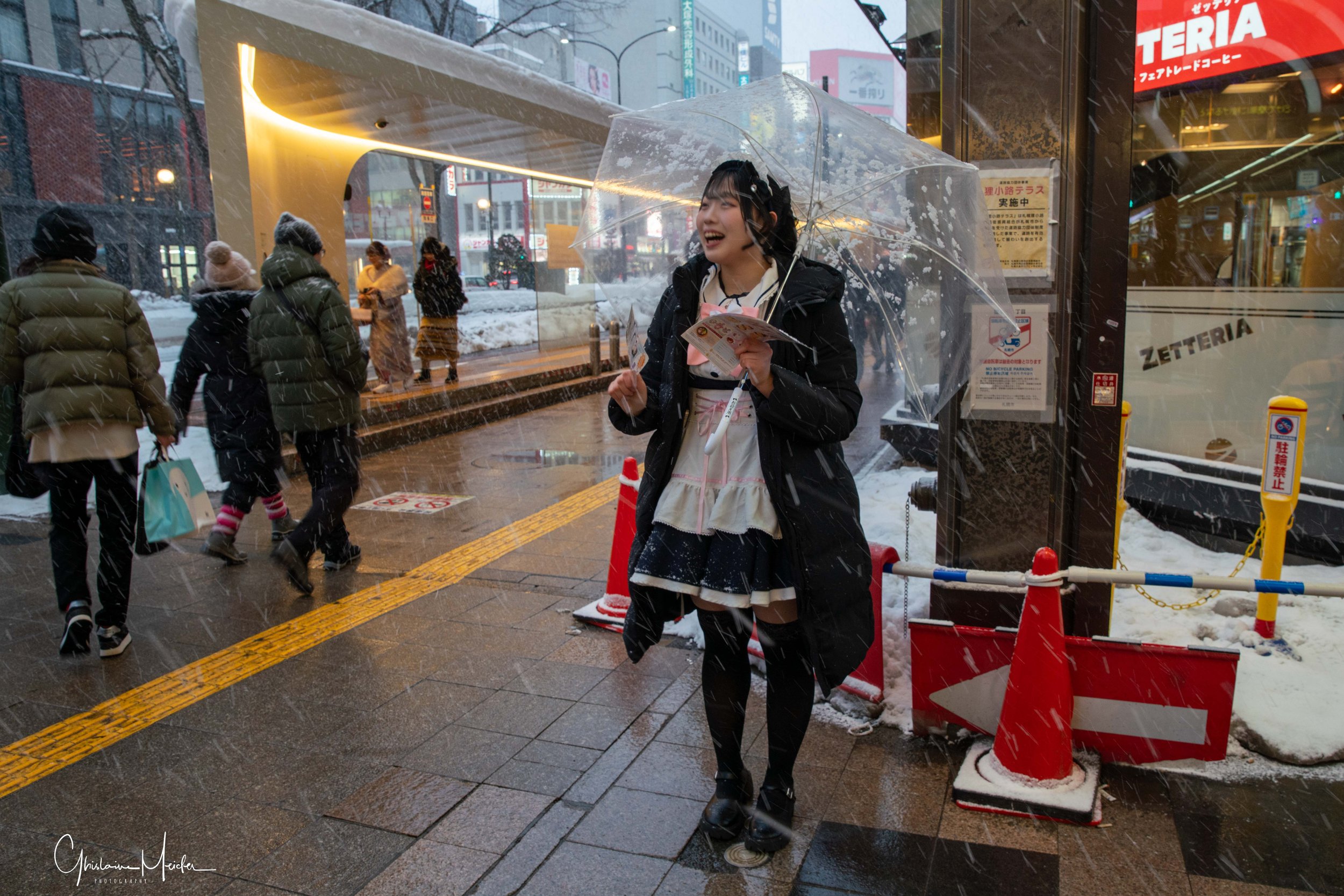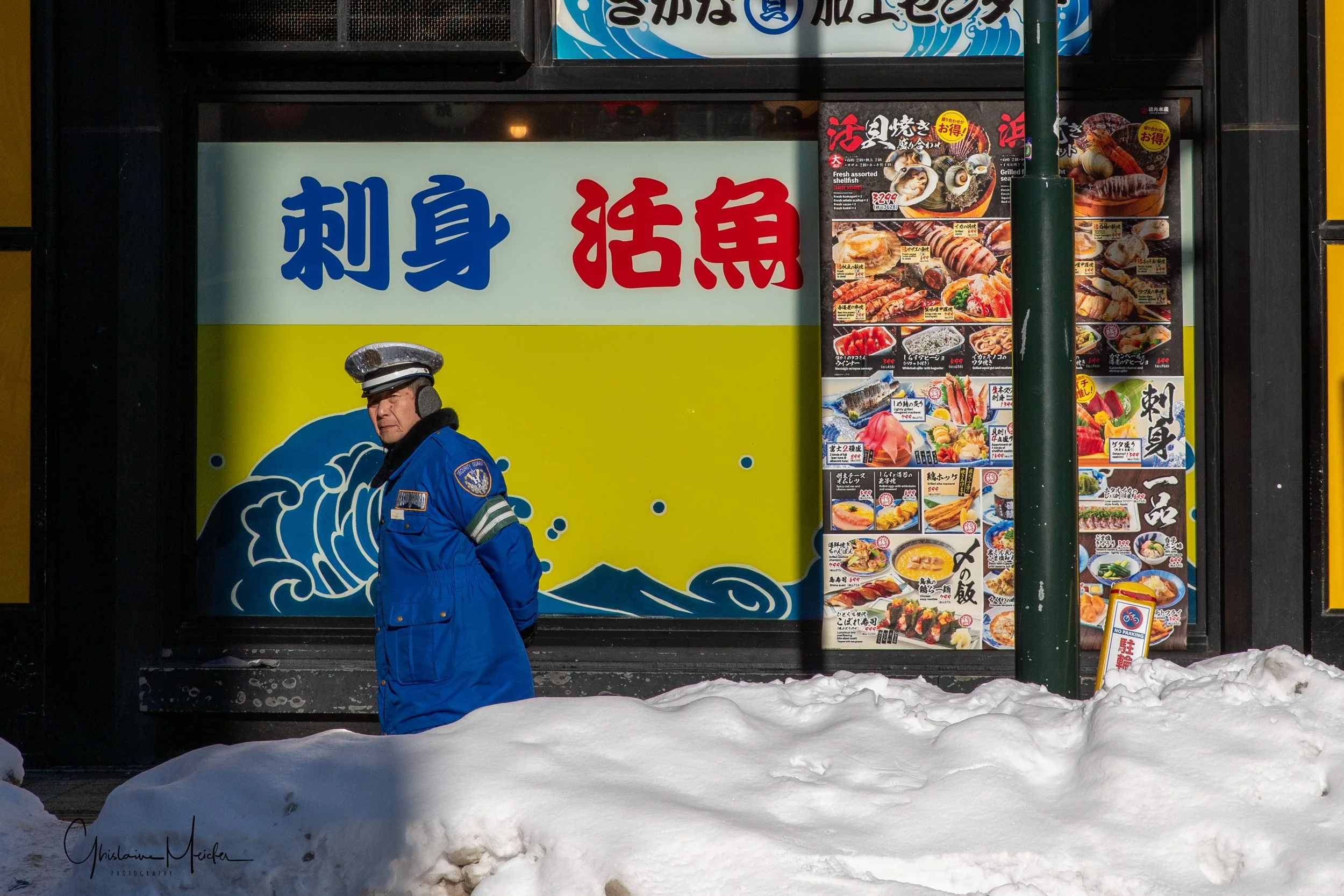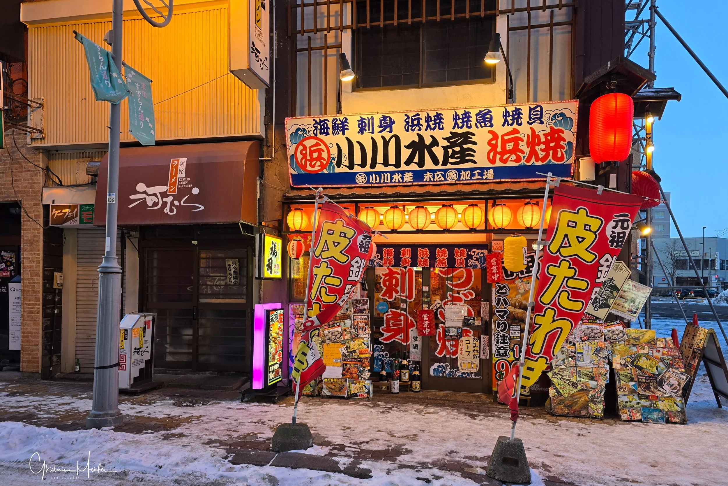 Retour sur Sapporo avec la neige qui recommence à tomber et redonne à la ville cette ambiance si sympathique. Nous écourtons notre rituel bain dans le onsen pour sillonner les rues de la ville, armés de notre appareil photo. Il est 17h30 et la nuit test déjà tombée sur Sapporo, les japonais s’empressent de rentrer chez eux et de fuir le vent glacial qui s’abat sur la ville, alors que d’autres préfèrent retrouver la chaleur réconfortante d’un restaurant