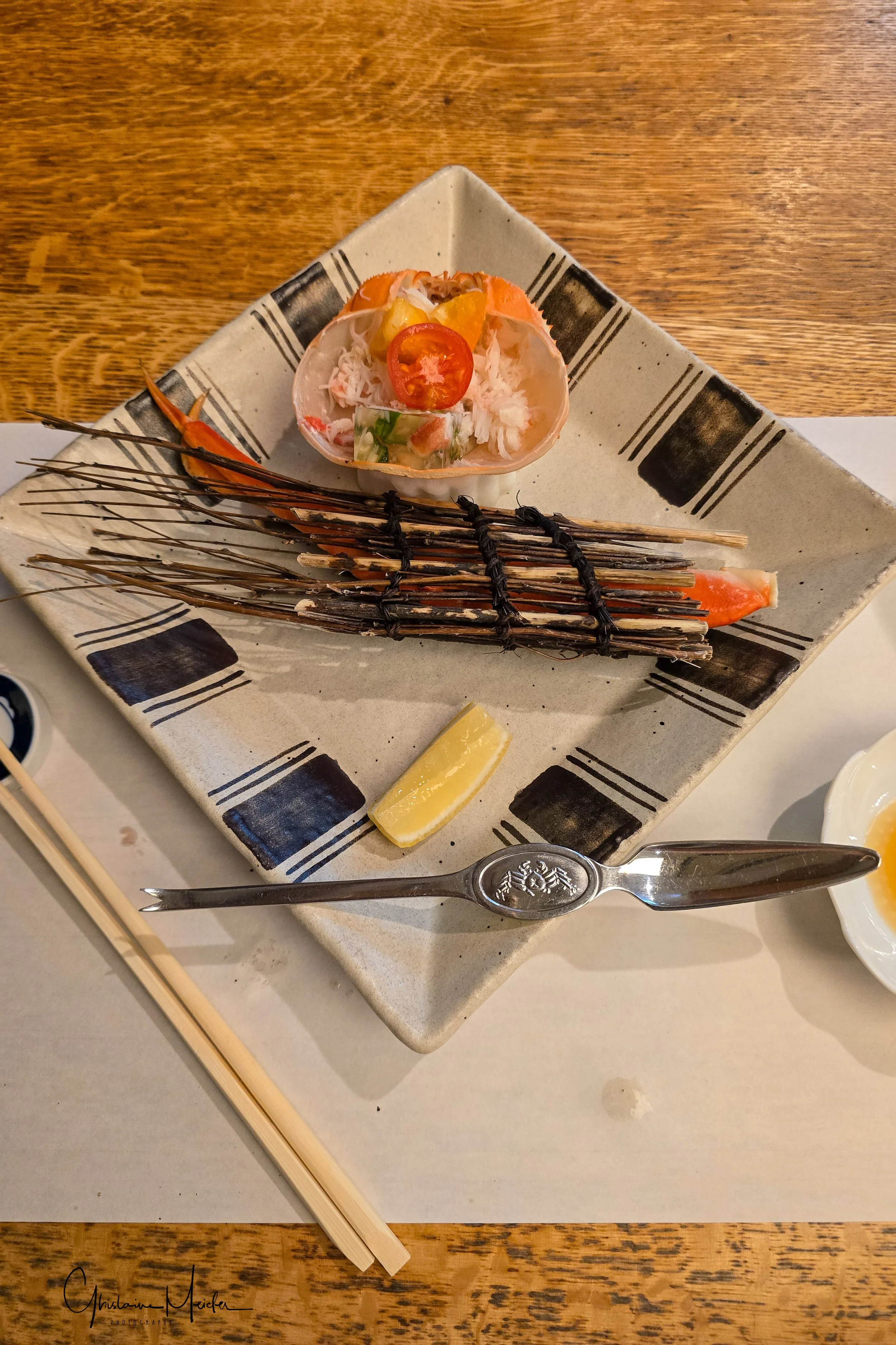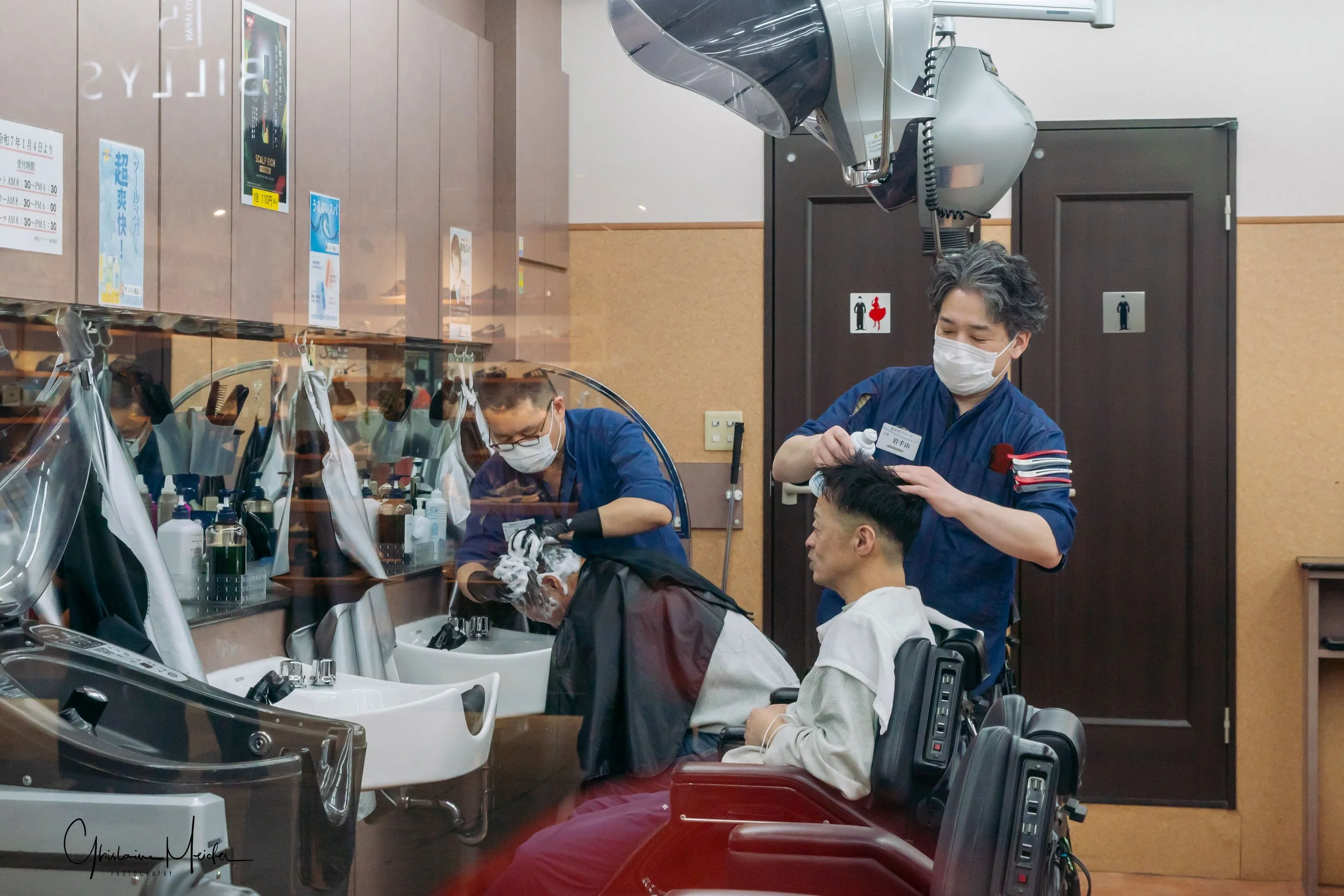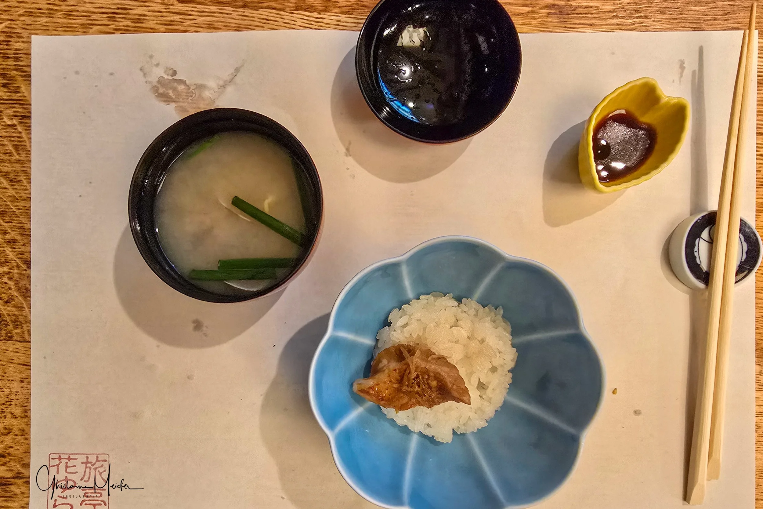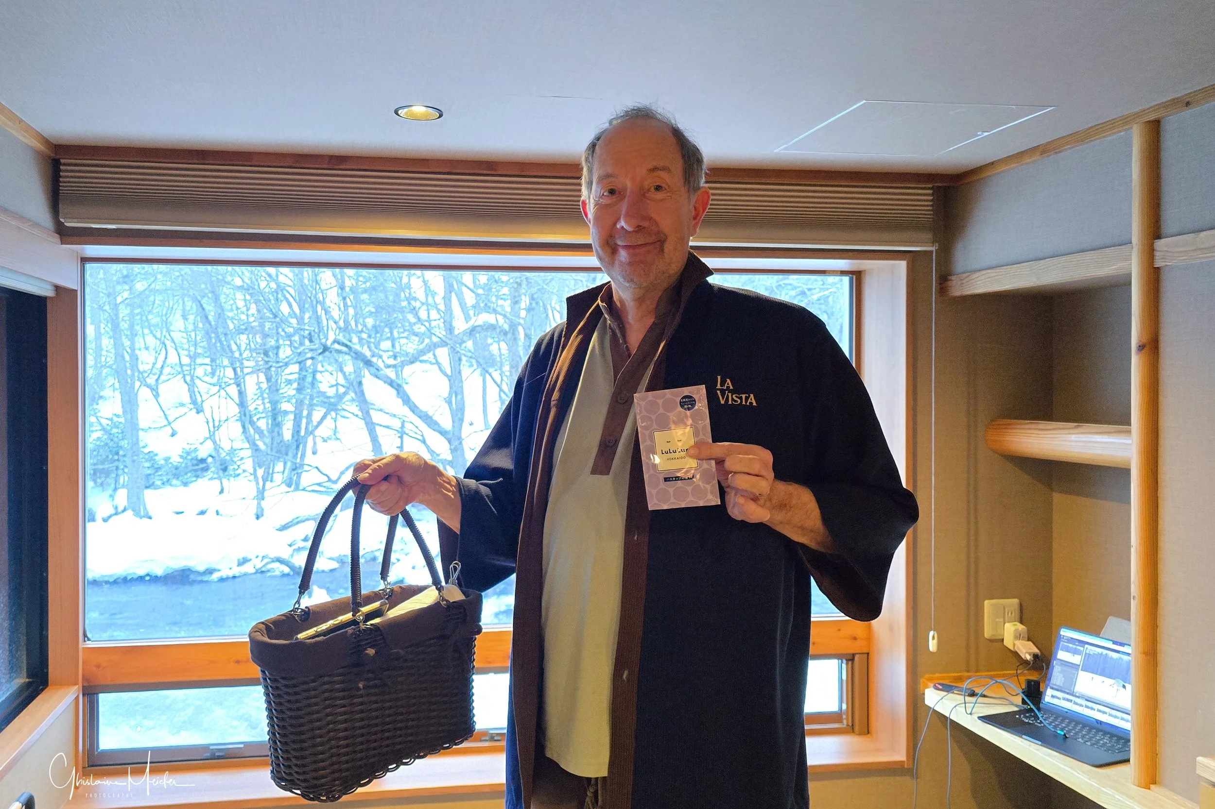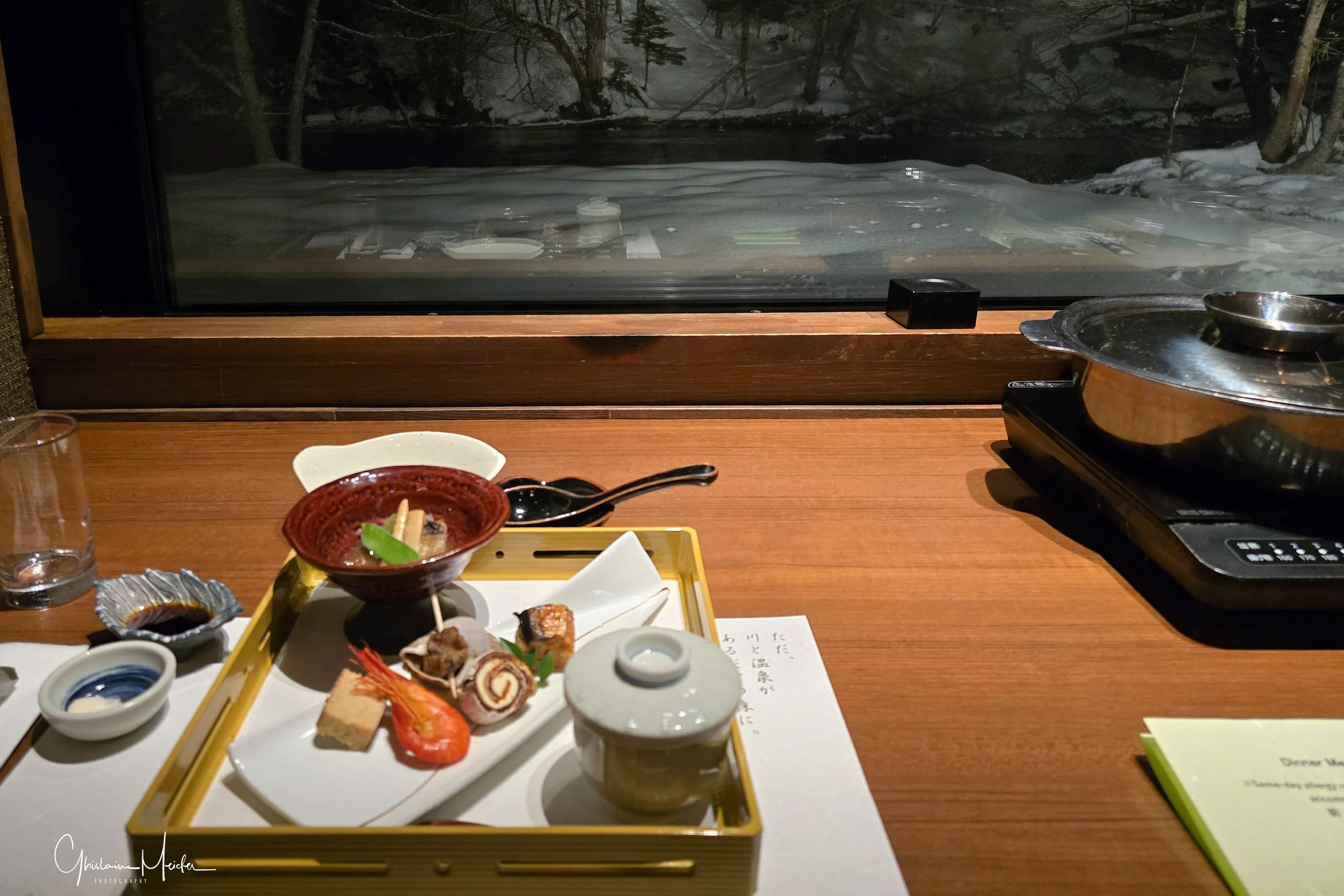 Après cette longue journée, voici venu le temps du réconfort: nous rejoignons notre magnifique chambre donnant sur la rivière, encore quelques photos de pose lente puis Philippe se prépare pour le traditionnel bain, équipé de son petit panier fourni par l’hôtel, le masque pour le visage, les chaussettes blanches (tabi), les sandales , le yukata et la sur-veste. Mais attention, le Yukata se portant comme une robe de chambre,il faut veiller à ce que le côté gauche s’enroule sur le côté droit. Cette étape est cruciale, car le croisement inverse est réservé aux funérailles. Ensuite, direction restaurant , libérant ainsi, la chambre et permettant au personnel d’installer les futons.