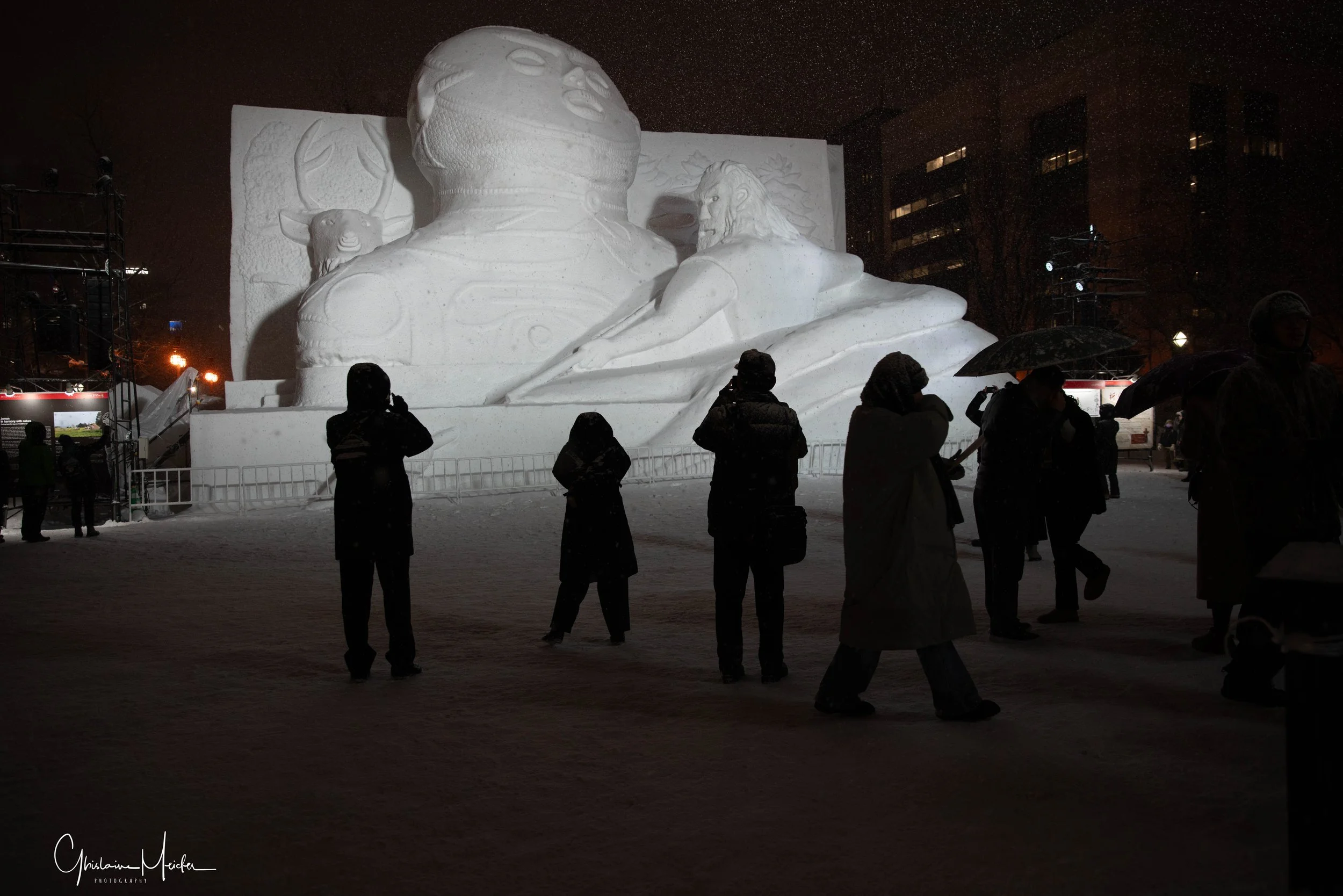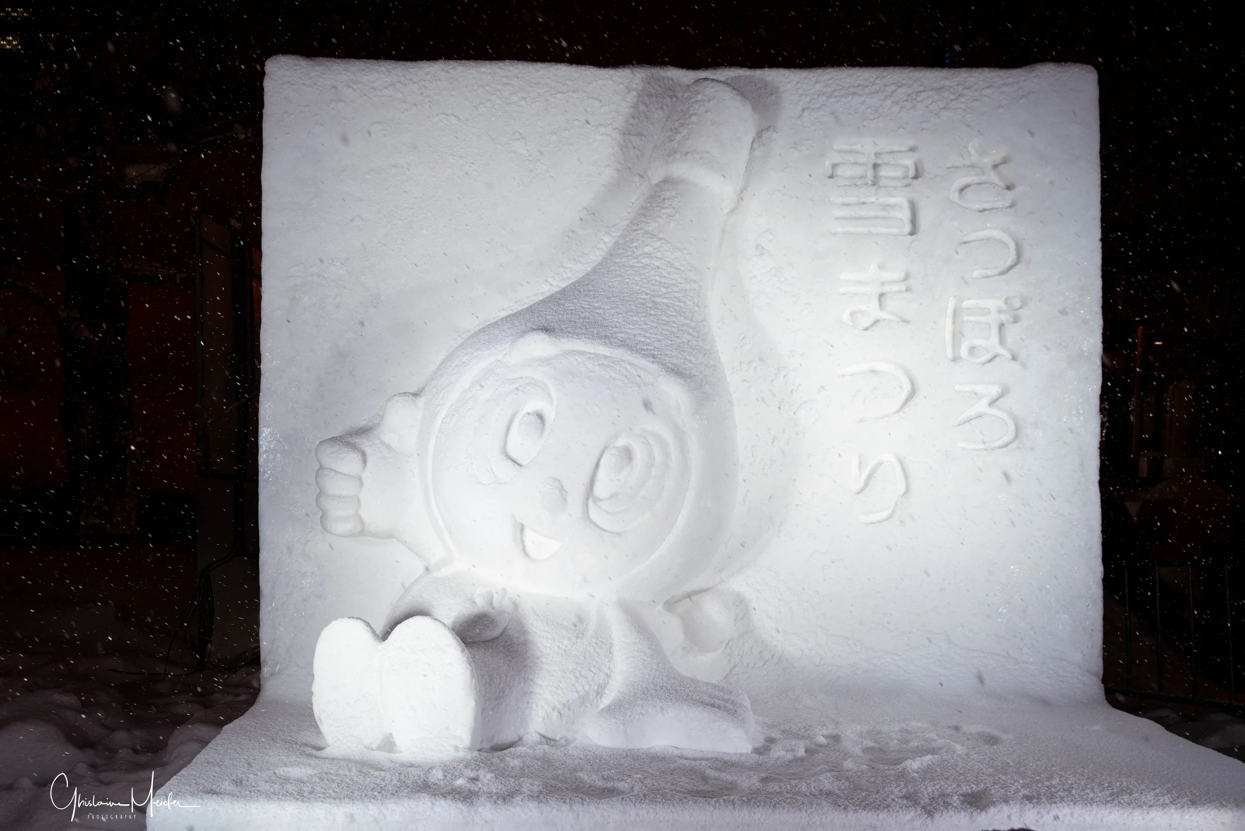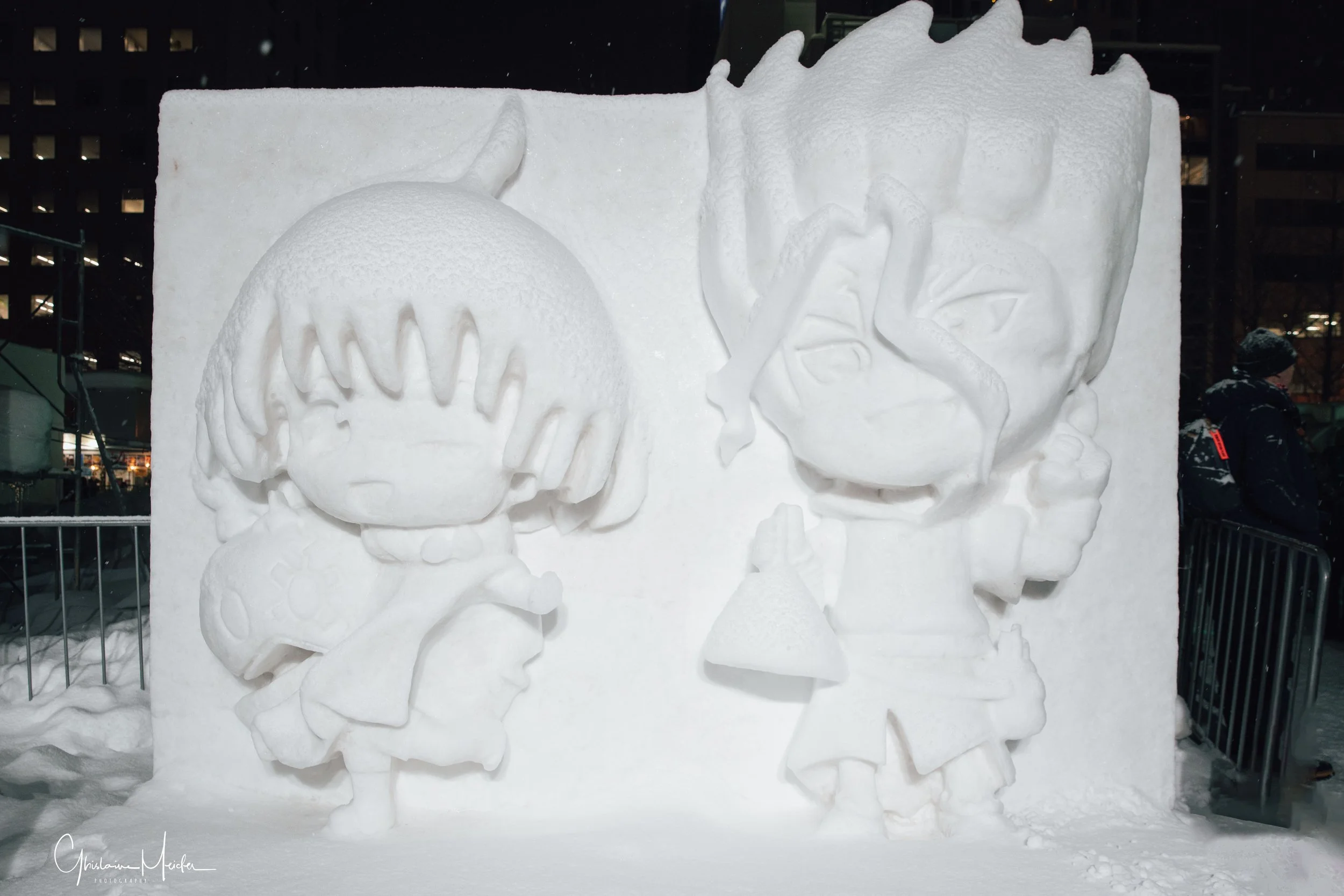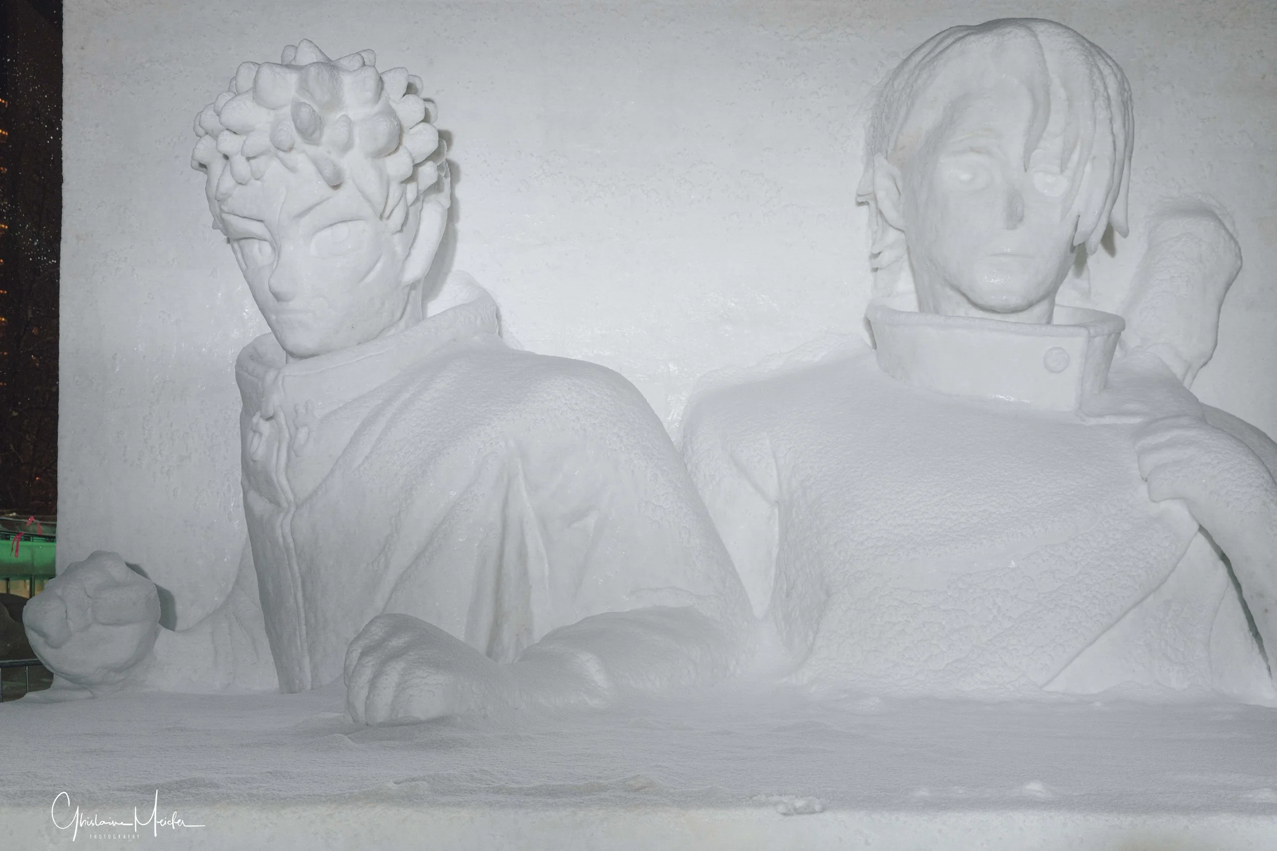 Des sculptures de neige de plus de 10 m de haut s’alignent le long du Parc Odori. Représentant des héros de manga, des bâtiments célèbres. Ces sculptures sont impressionnantes par leurs précisions et leur apparences semi réelles. Le soir, elles s’illuminent et se couvrent de mapping.