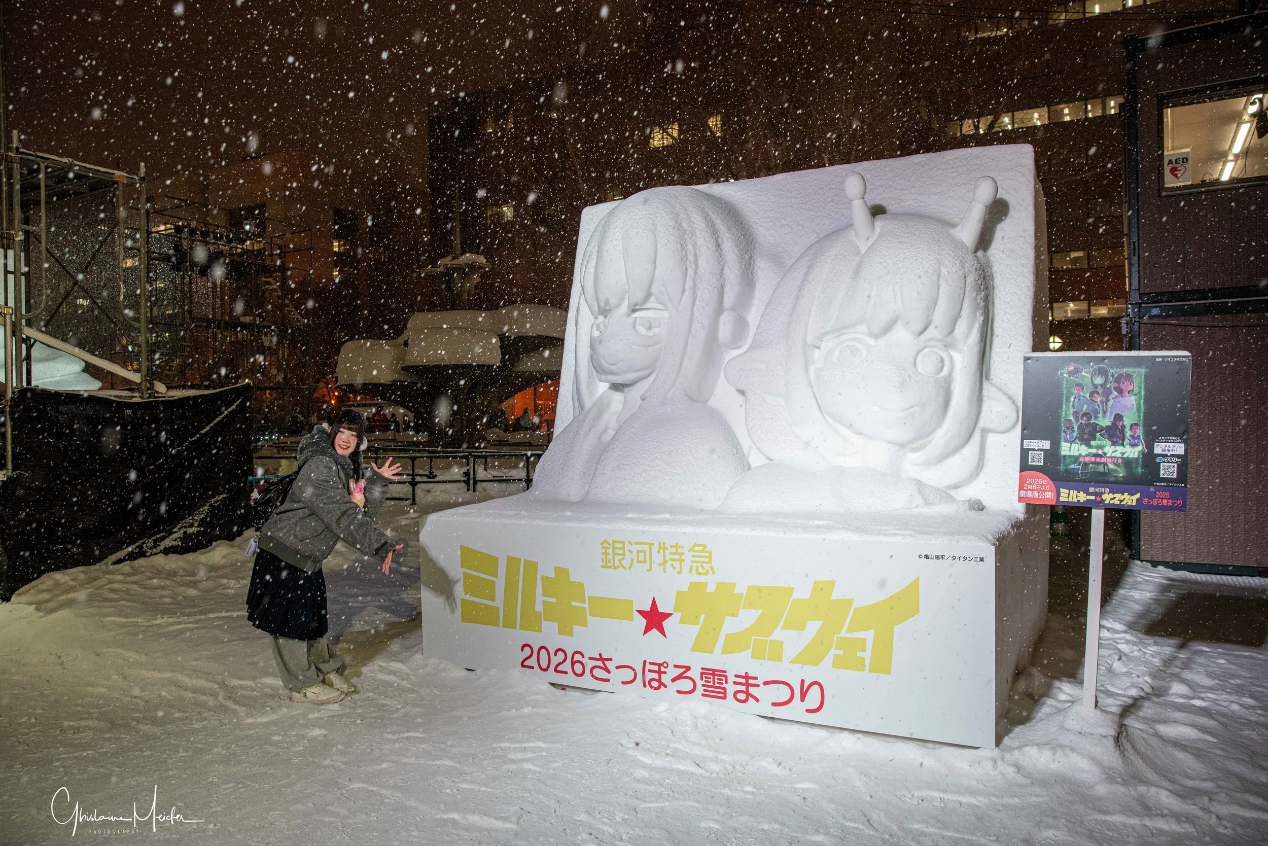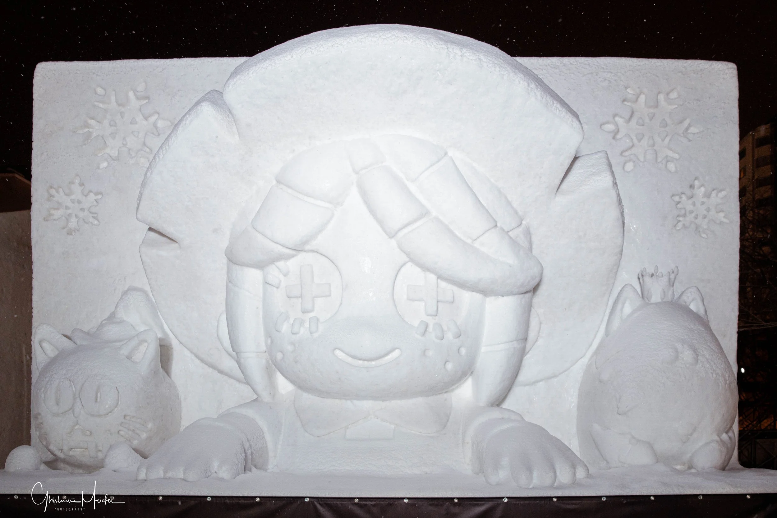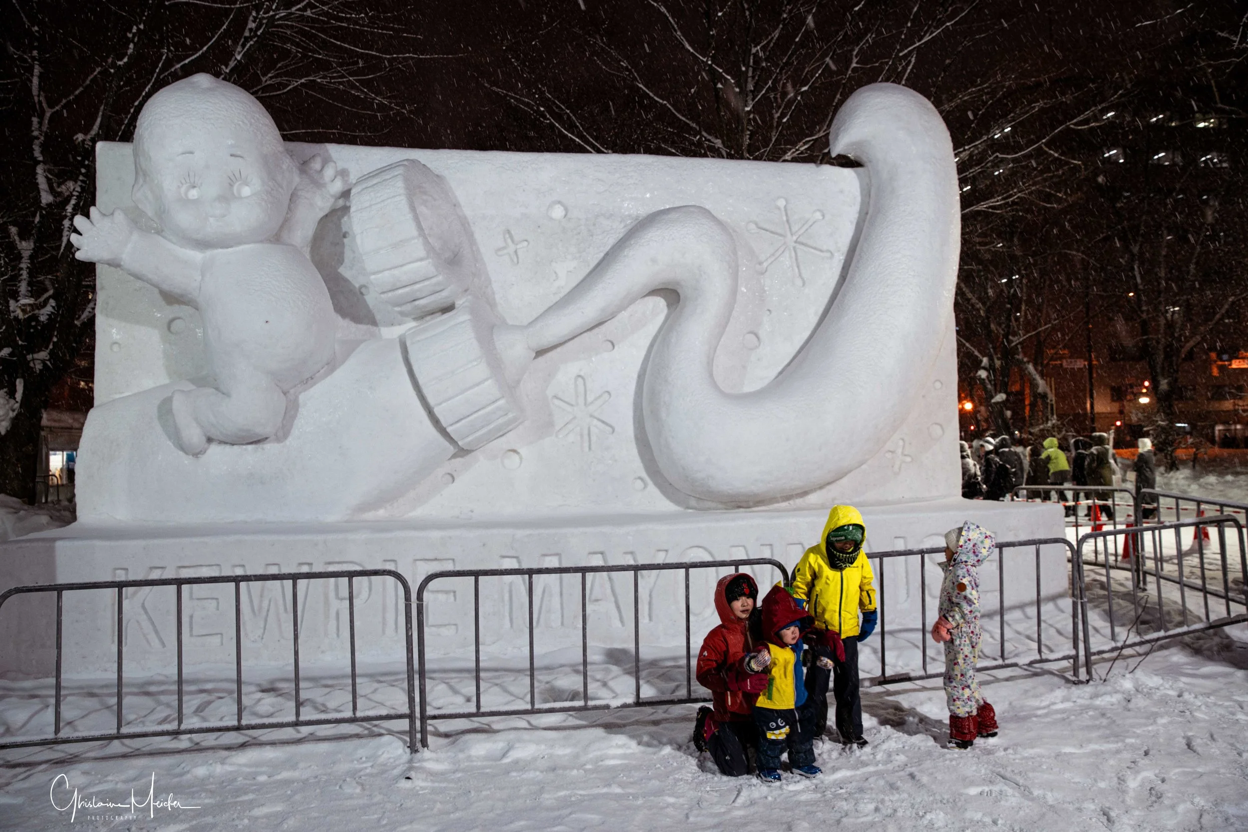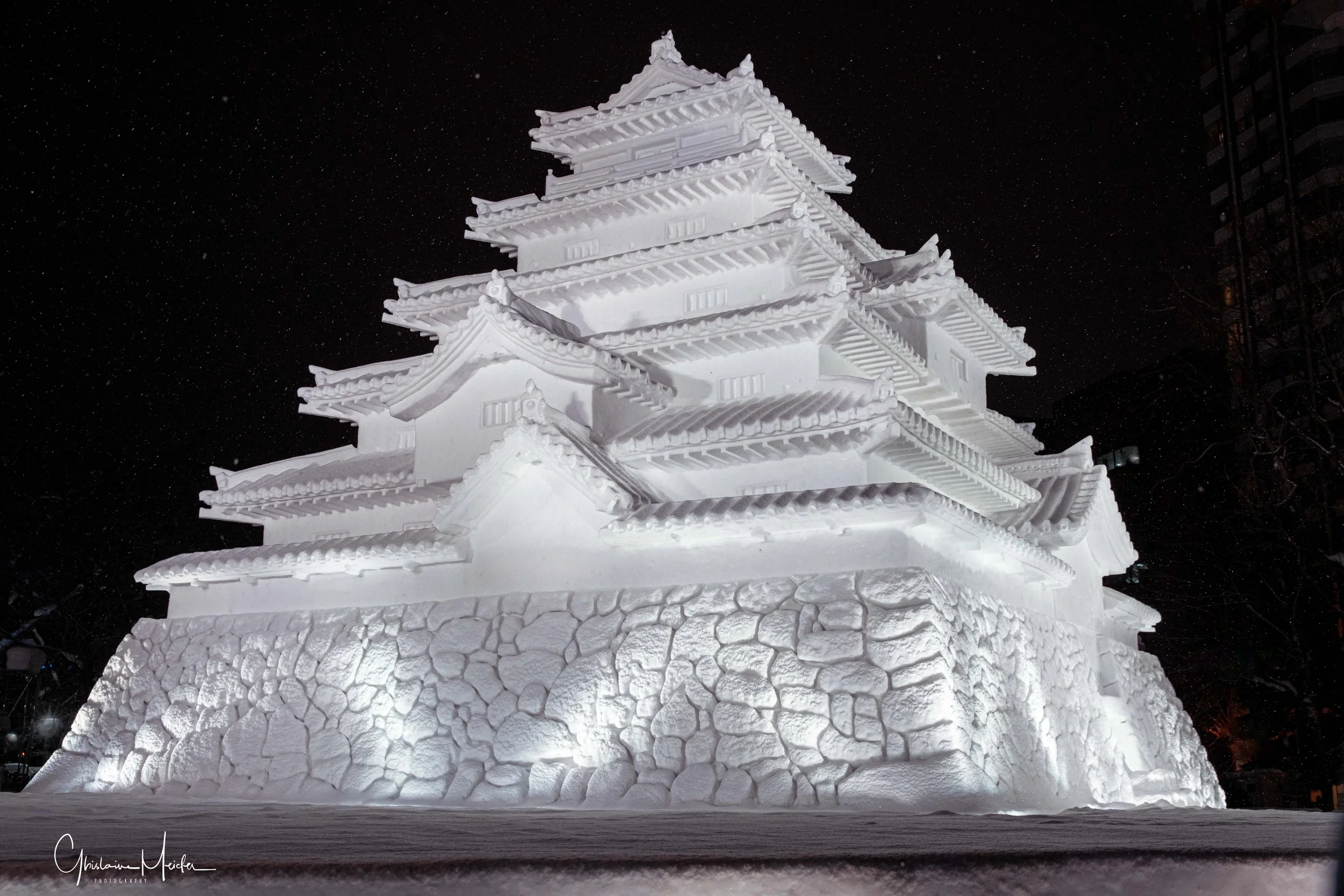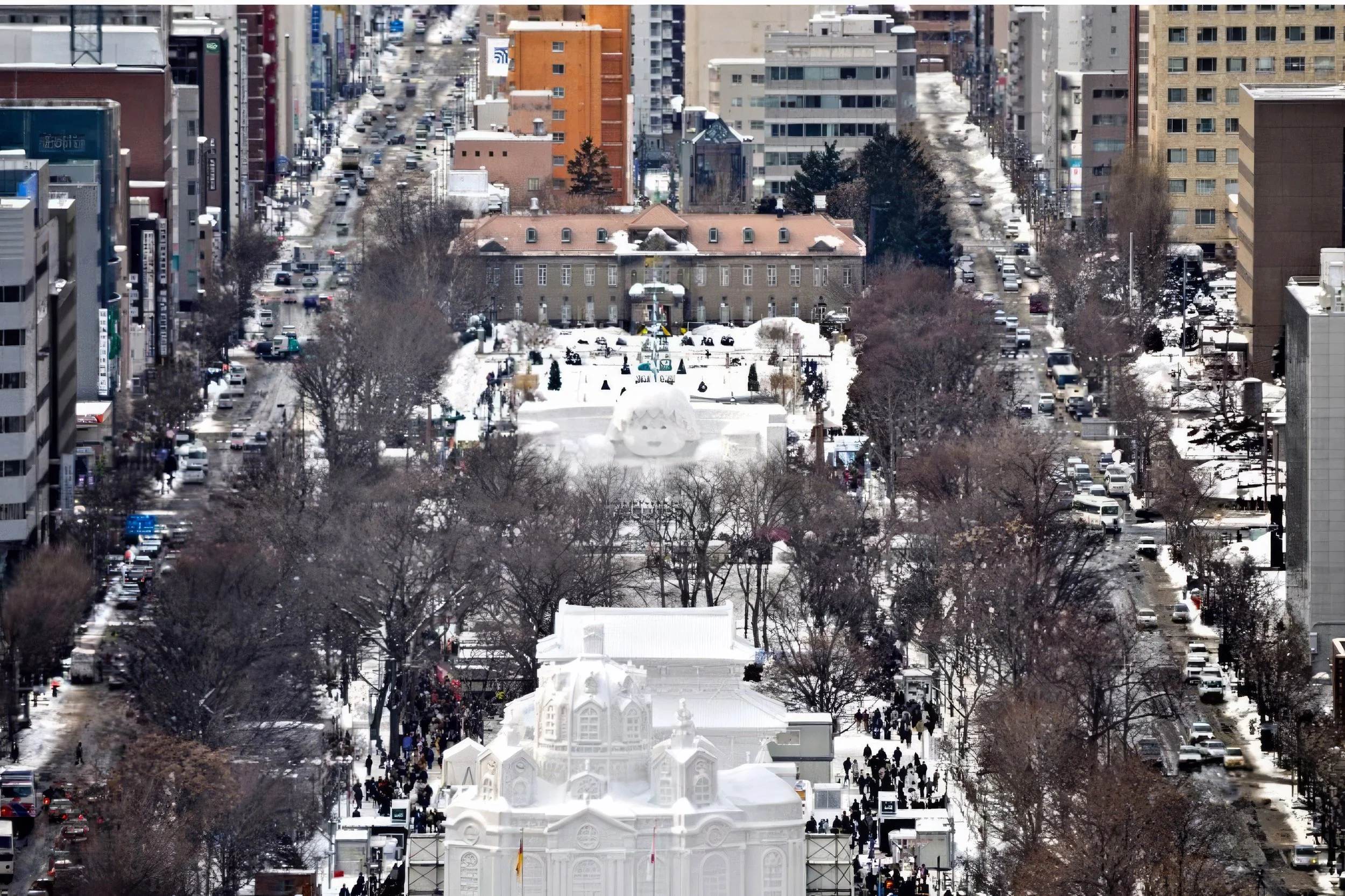 Des sculptures de neige de plus de 10 m de haut s’alignent le long du Parc Odori. Représentant des héros de manga, des bâtiments célèbres. Ces sculptures sont impressionnantes par leurs précisions et leur apparences semi réelles. Le soir, elles s’illuminent et se couvrent de mapping.