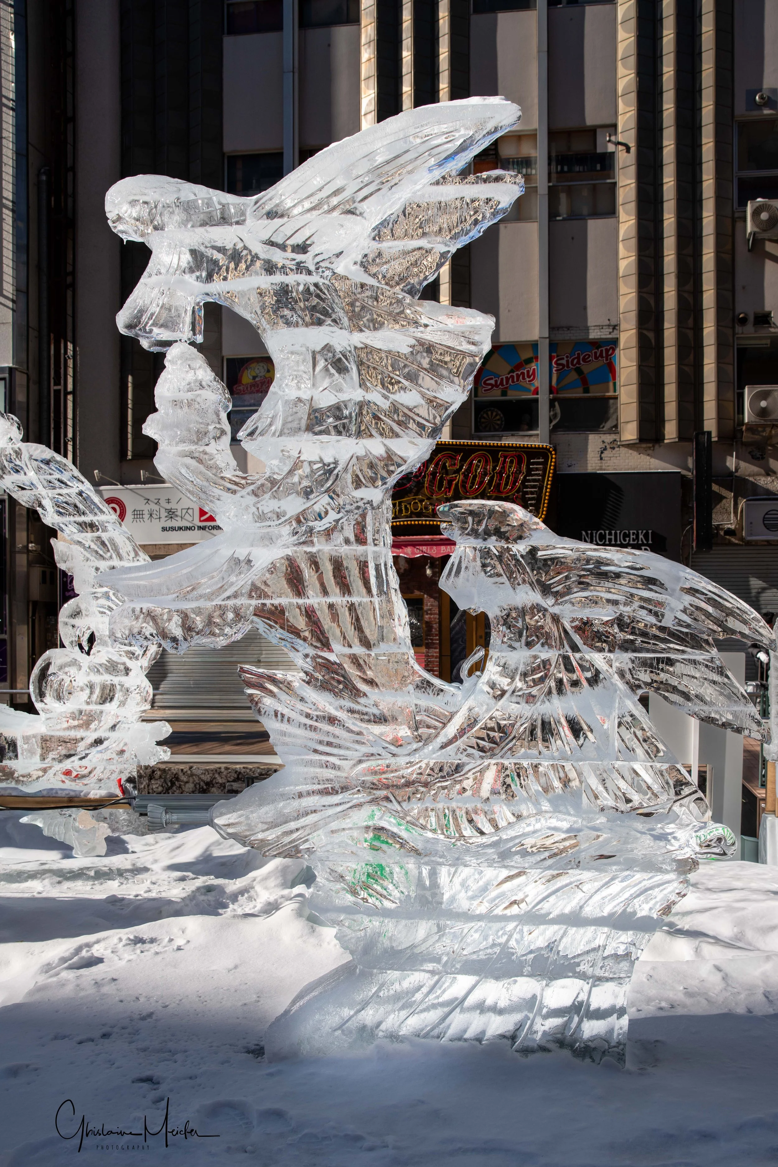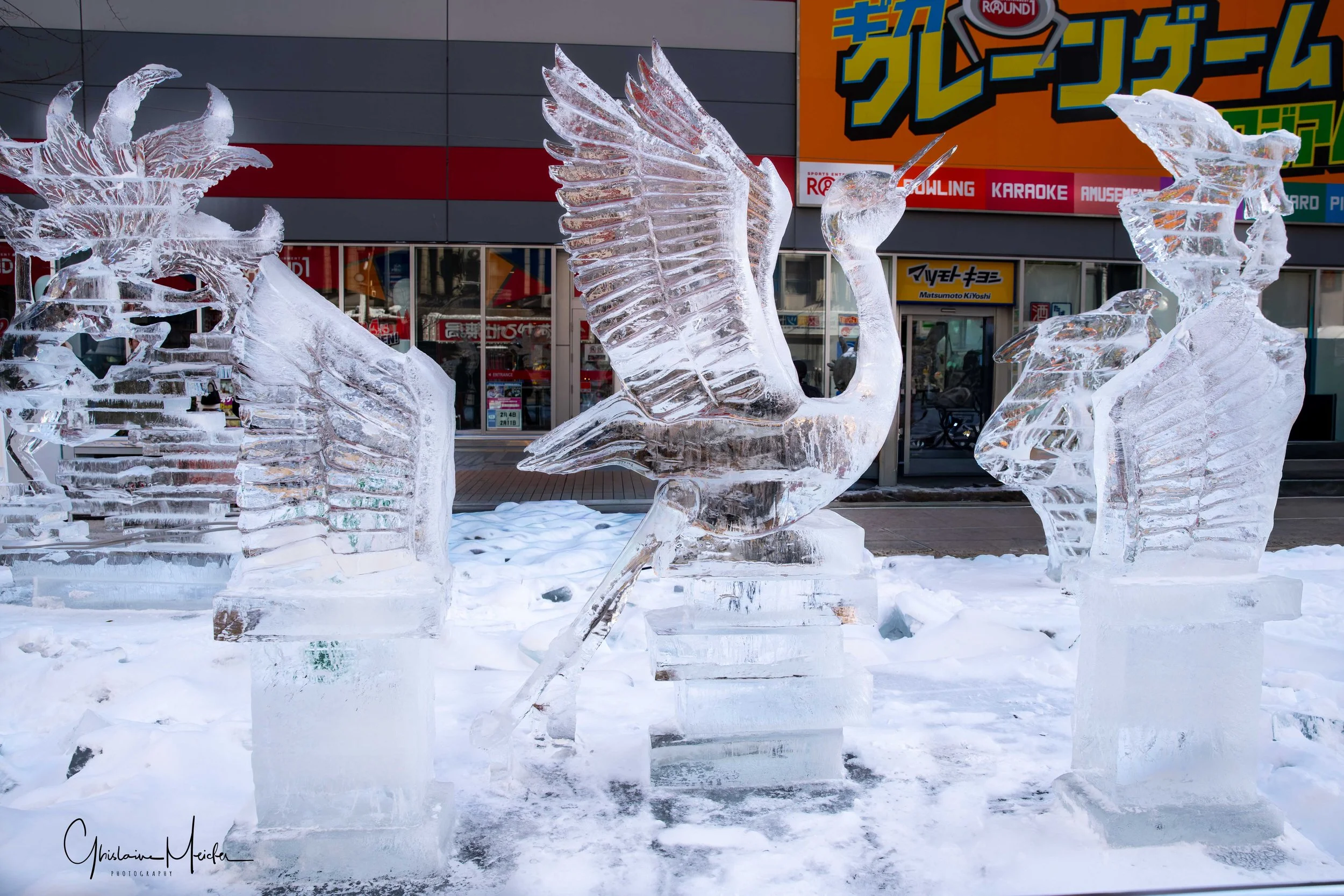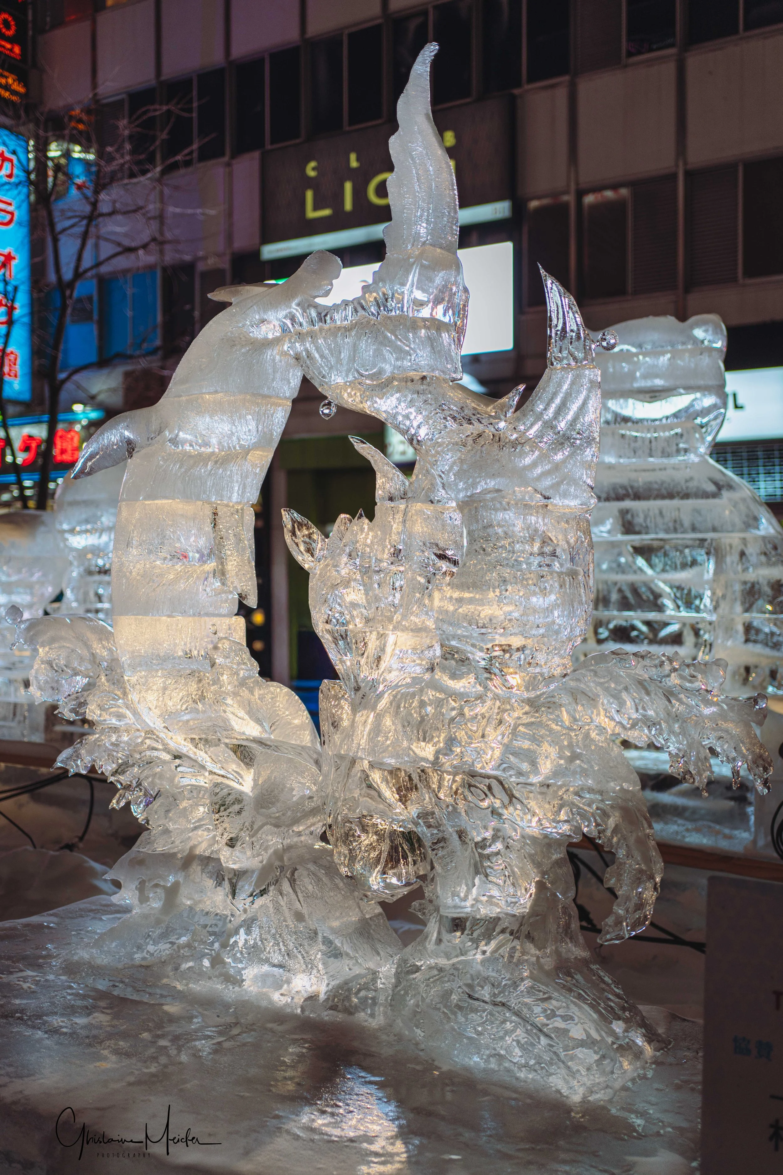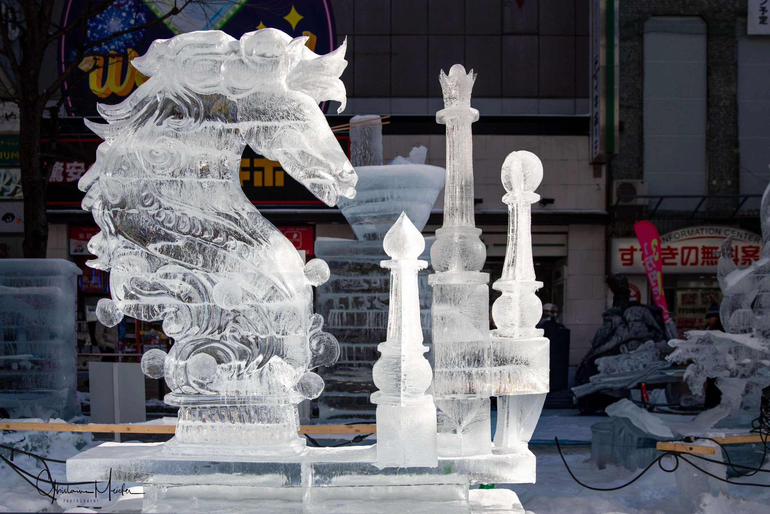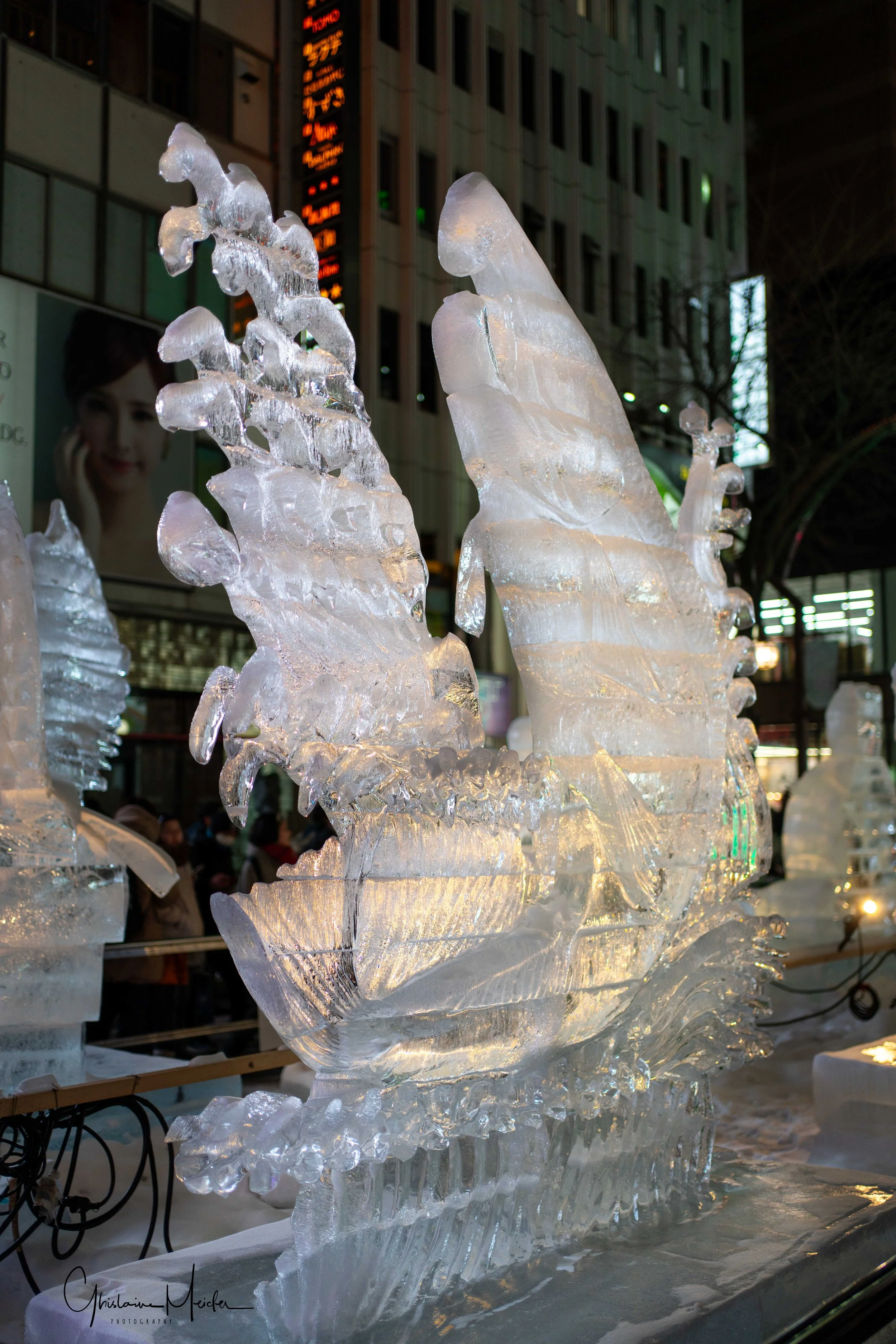 Sur le site de Susukino, des sculptures de glace sont réalisées avec la plus grande minutie. Elles jalonnent la rue commerçante et offre aux visiteurs un véritable musée en plein air sous la lumière des néons des boutiques et l’effervescence de la rue.