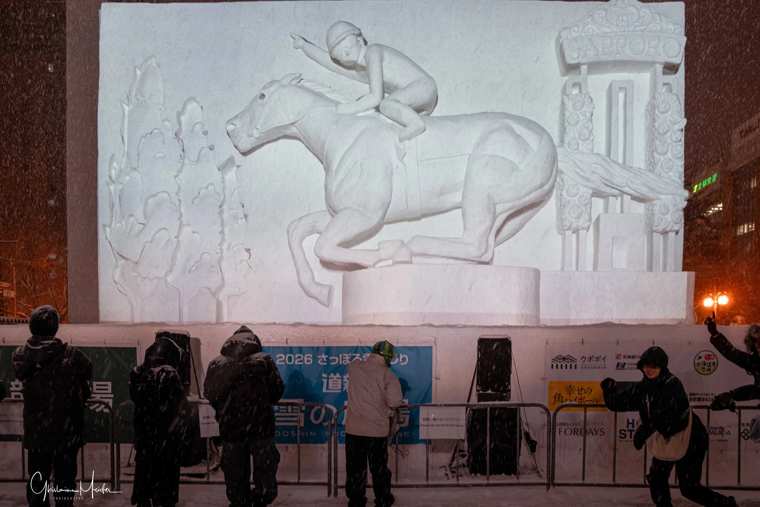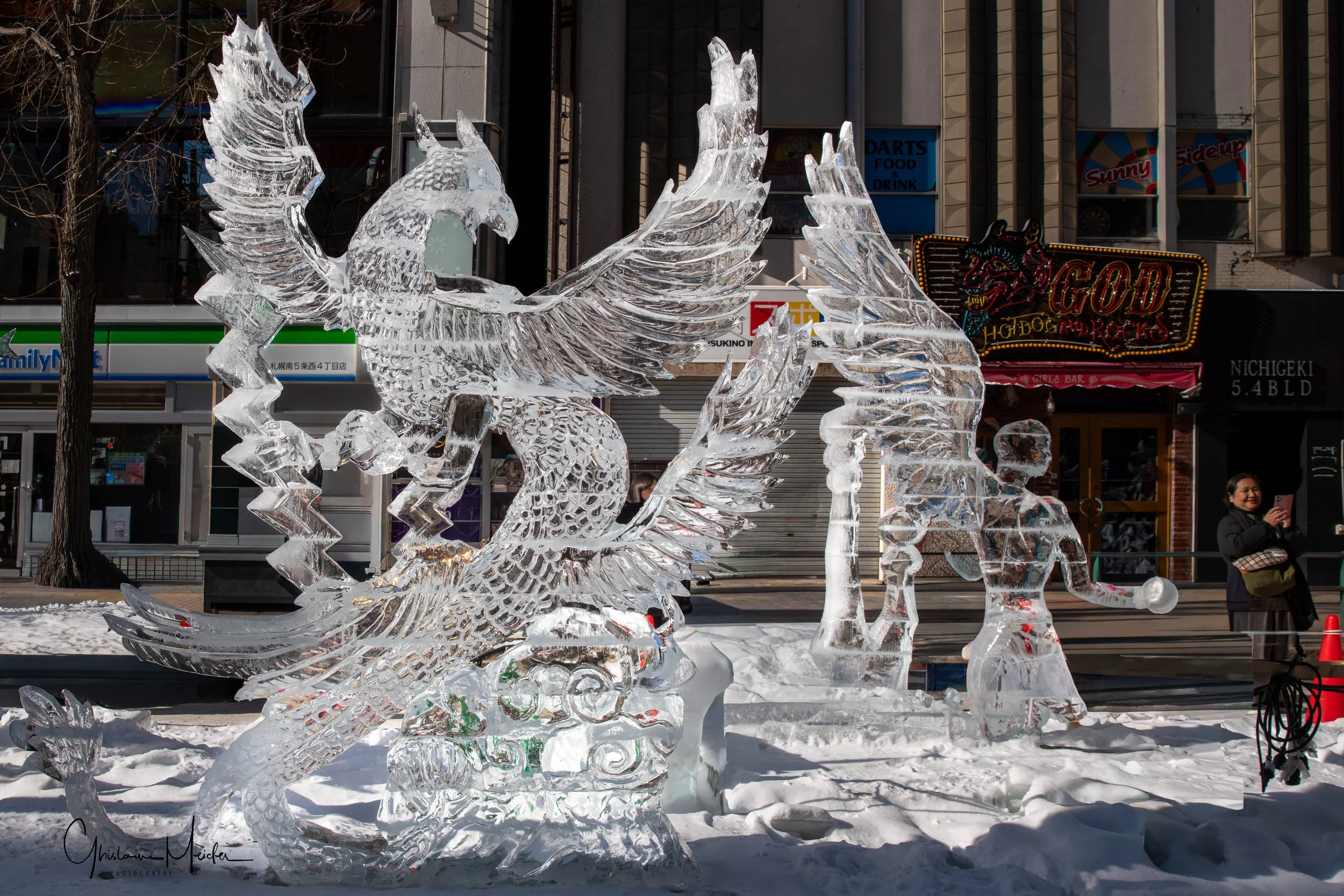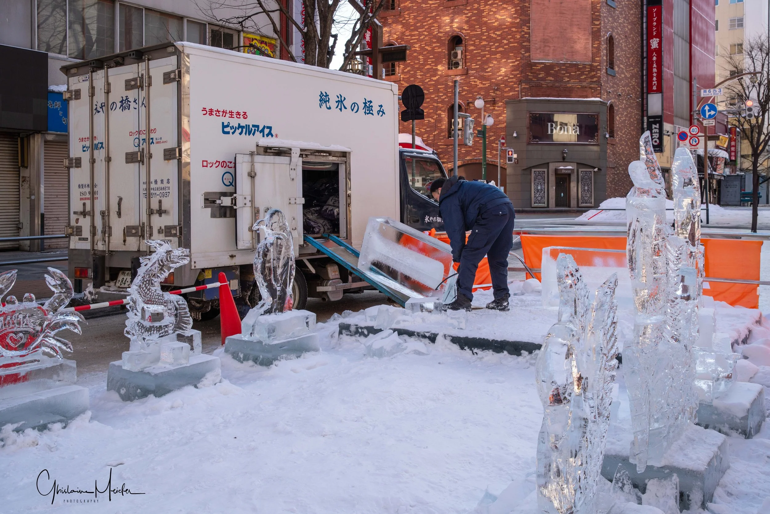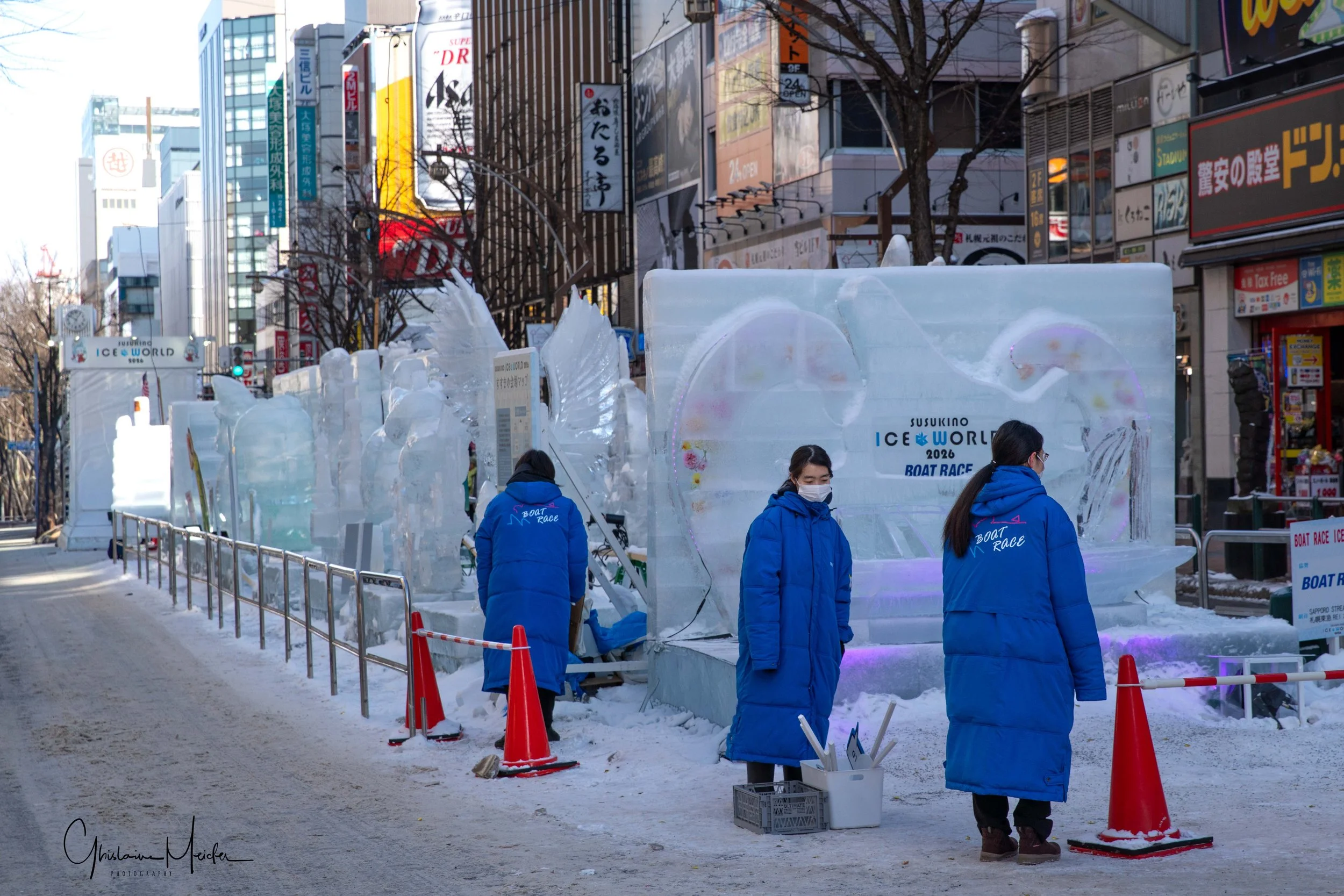 Sur le site de Susukino, des sculptures de glace sont réalisées avec la plus grande minutie. Elles jalonnent la rue commerçante et offre aux visiteurs un véritable musée en plein air sous la lumière des néons des boutiques et l’effervescence de la rue.