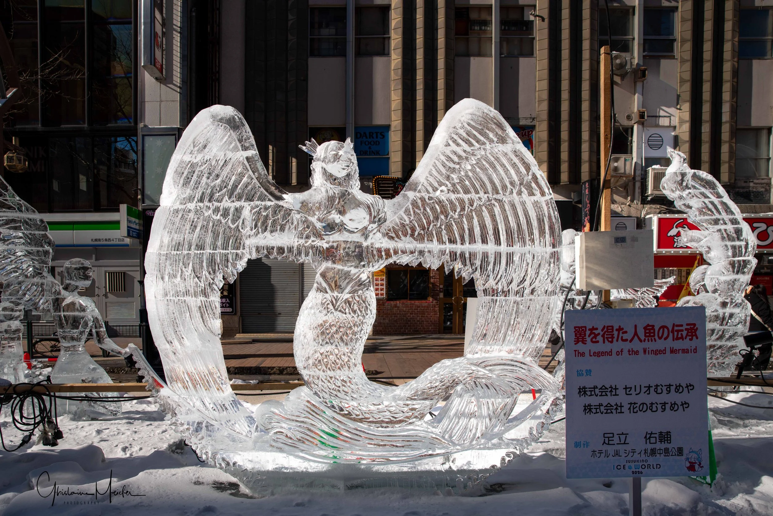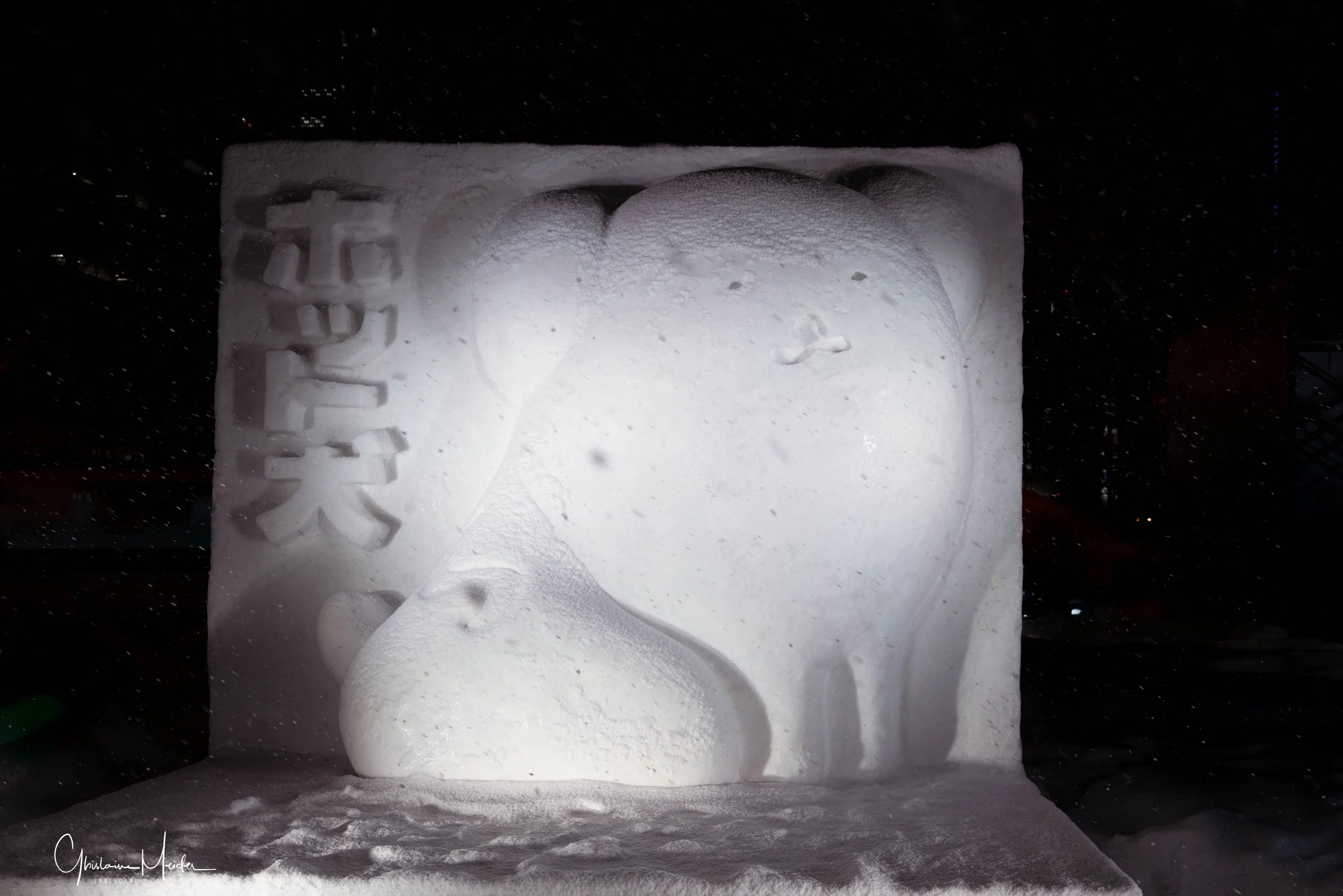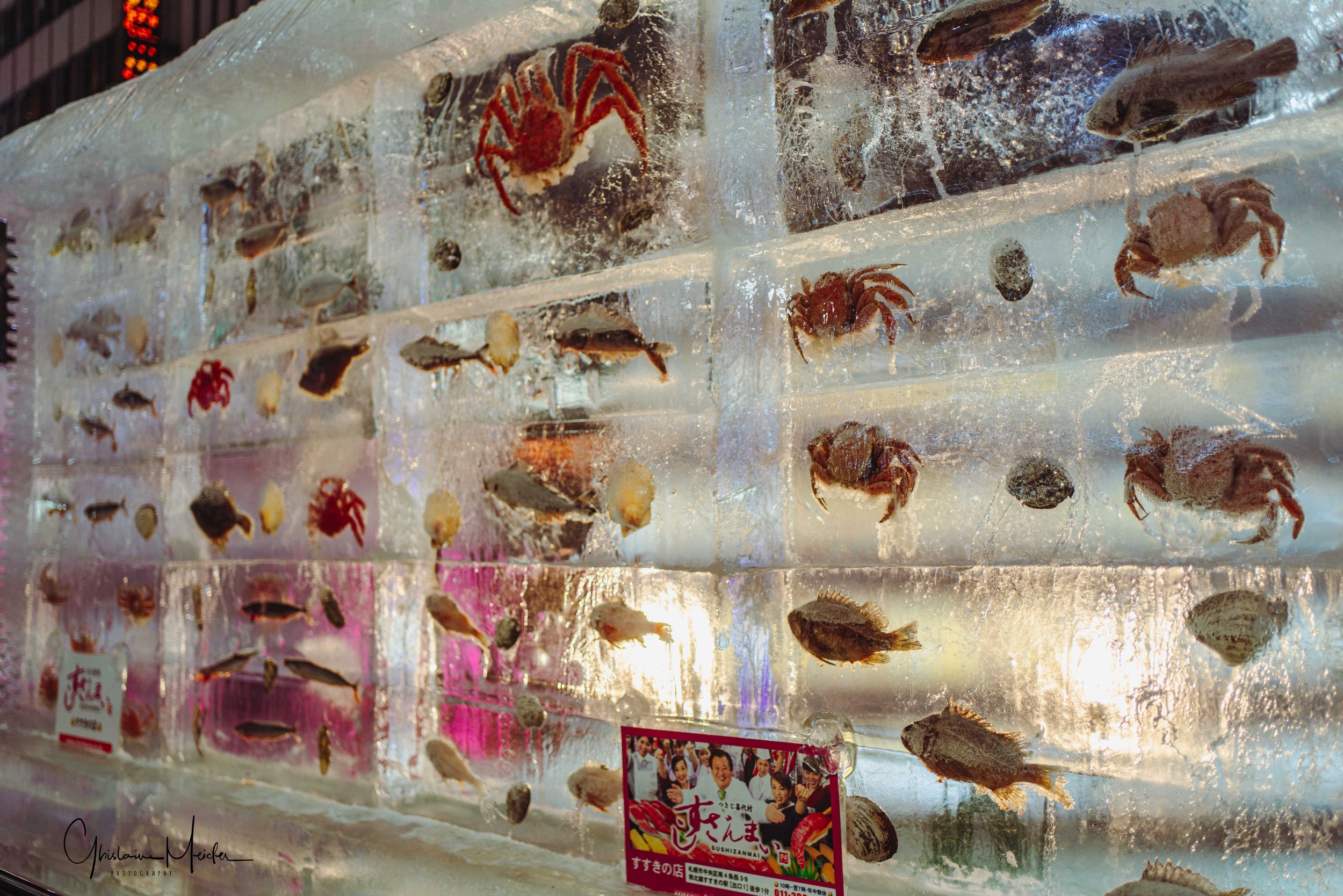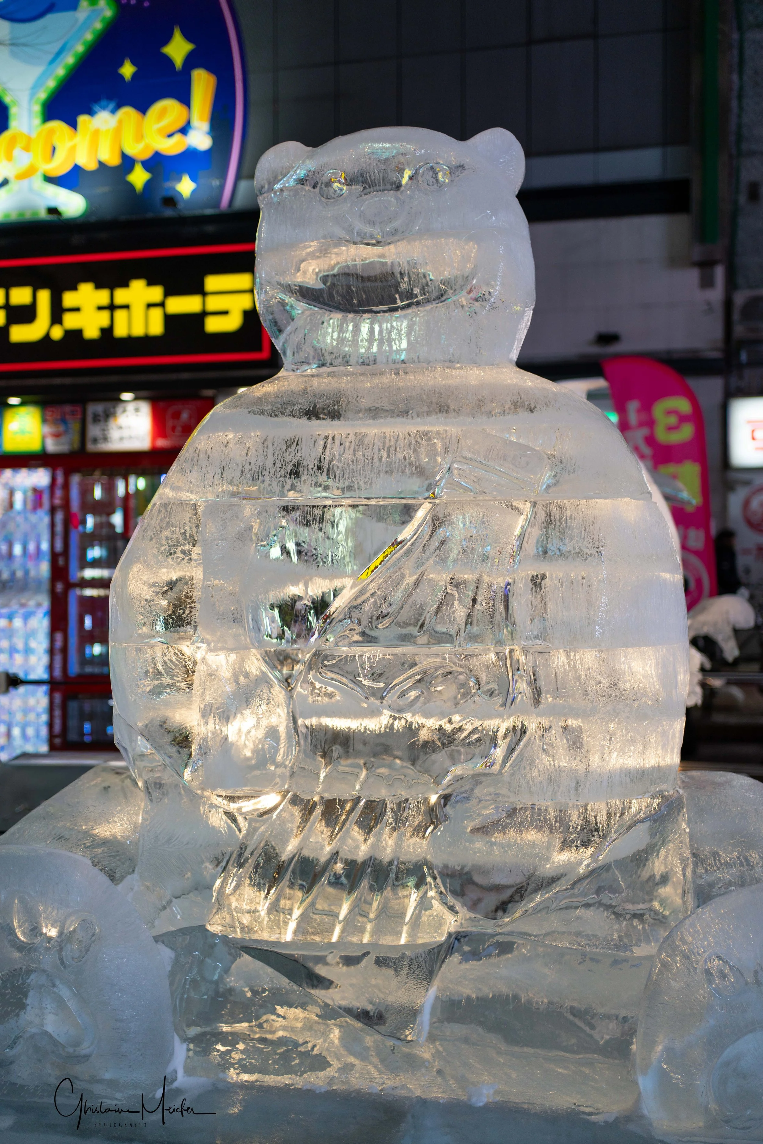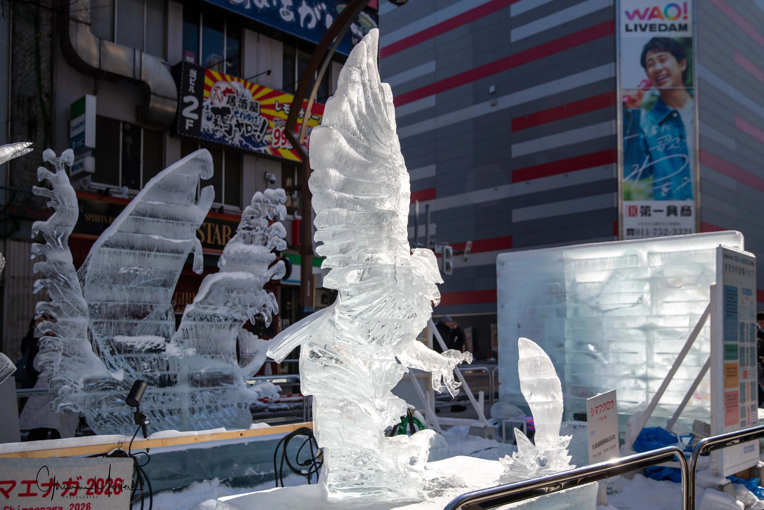 Sur le site de Susukino, des sculptures de glace sont réalisées avec la plus grande minutie. Elles jalonnent la rue commerçante et offre aux visiteurs un véritable musée en plein air sous la lumière des néons des boutiques et l’effervescence de la rue.