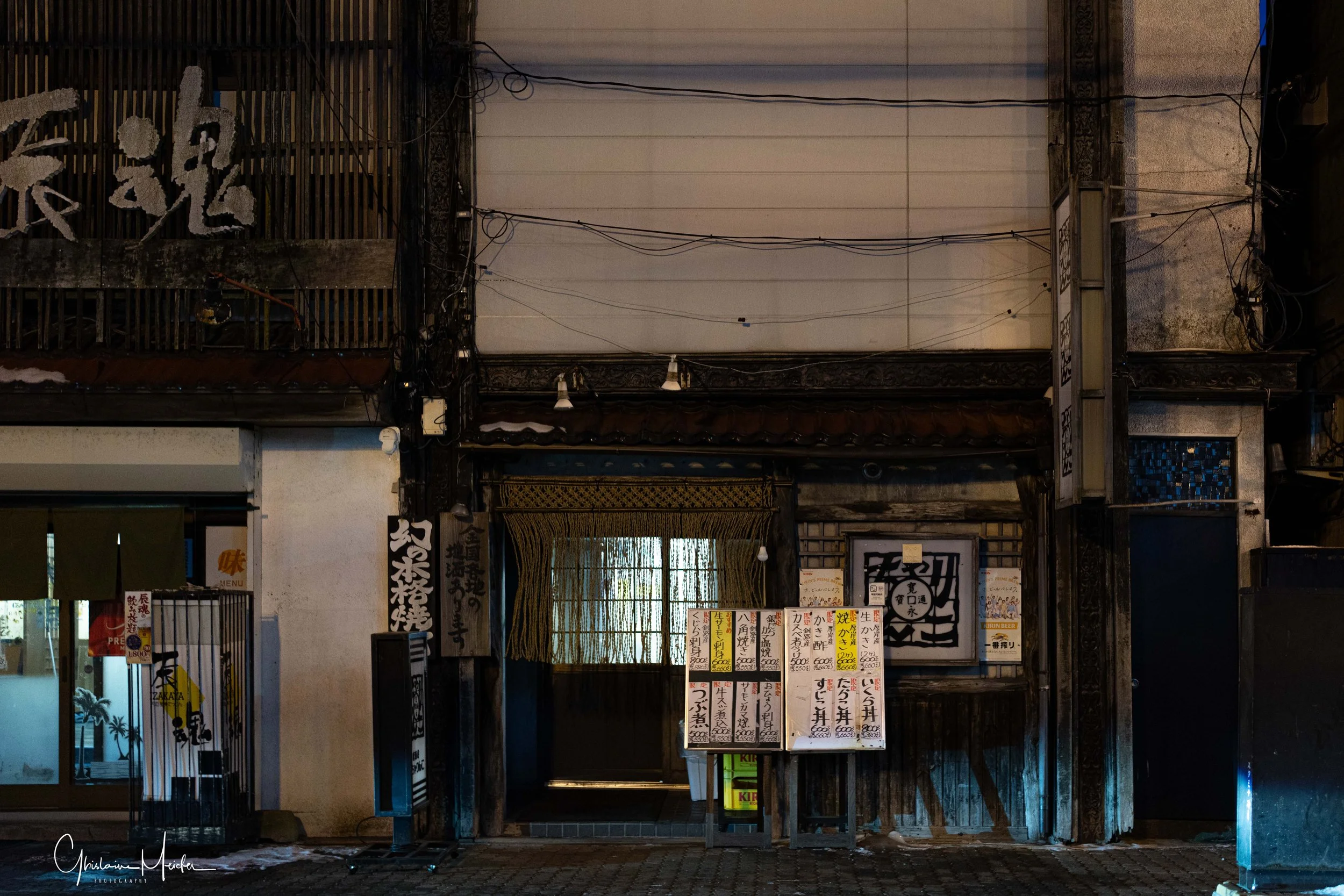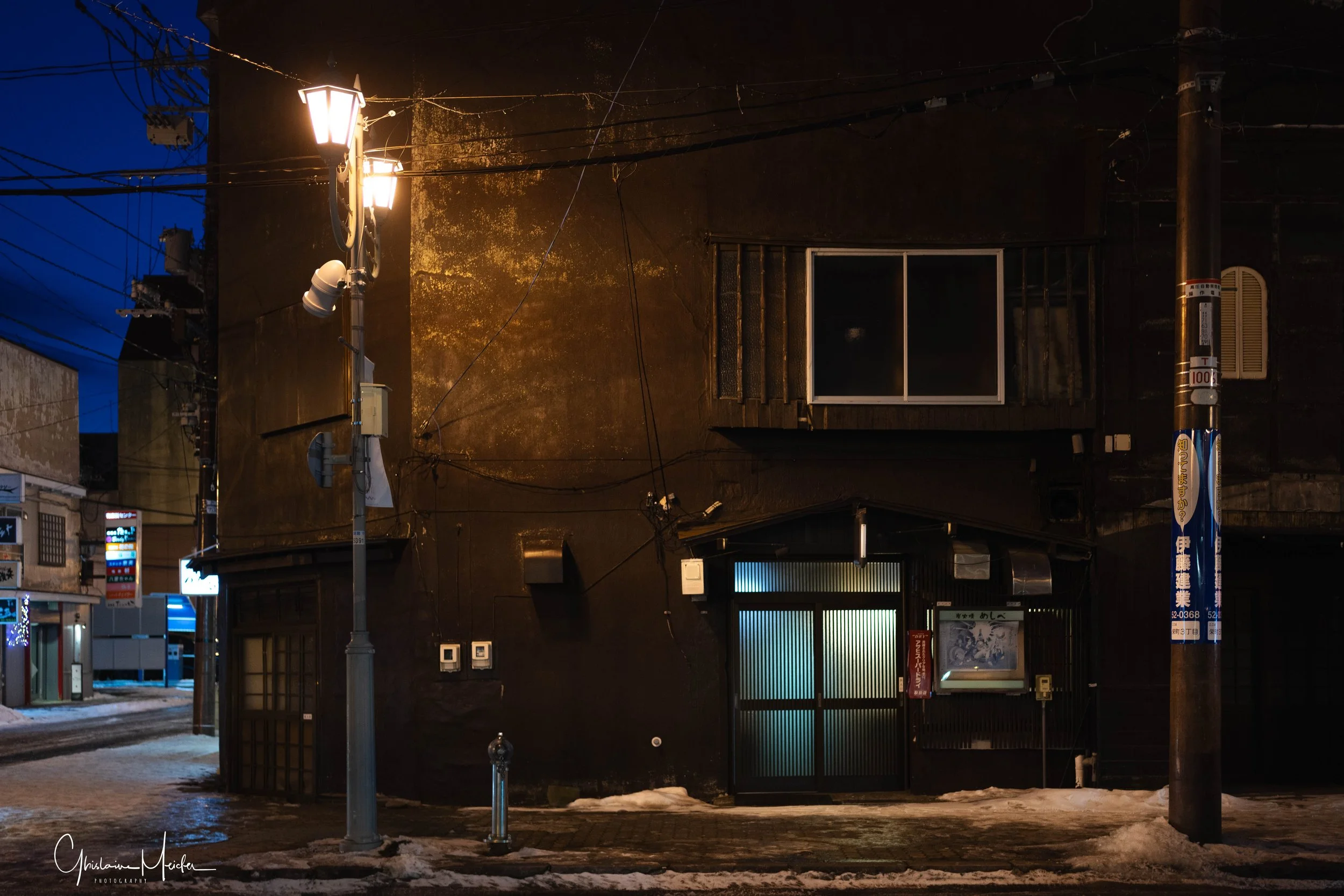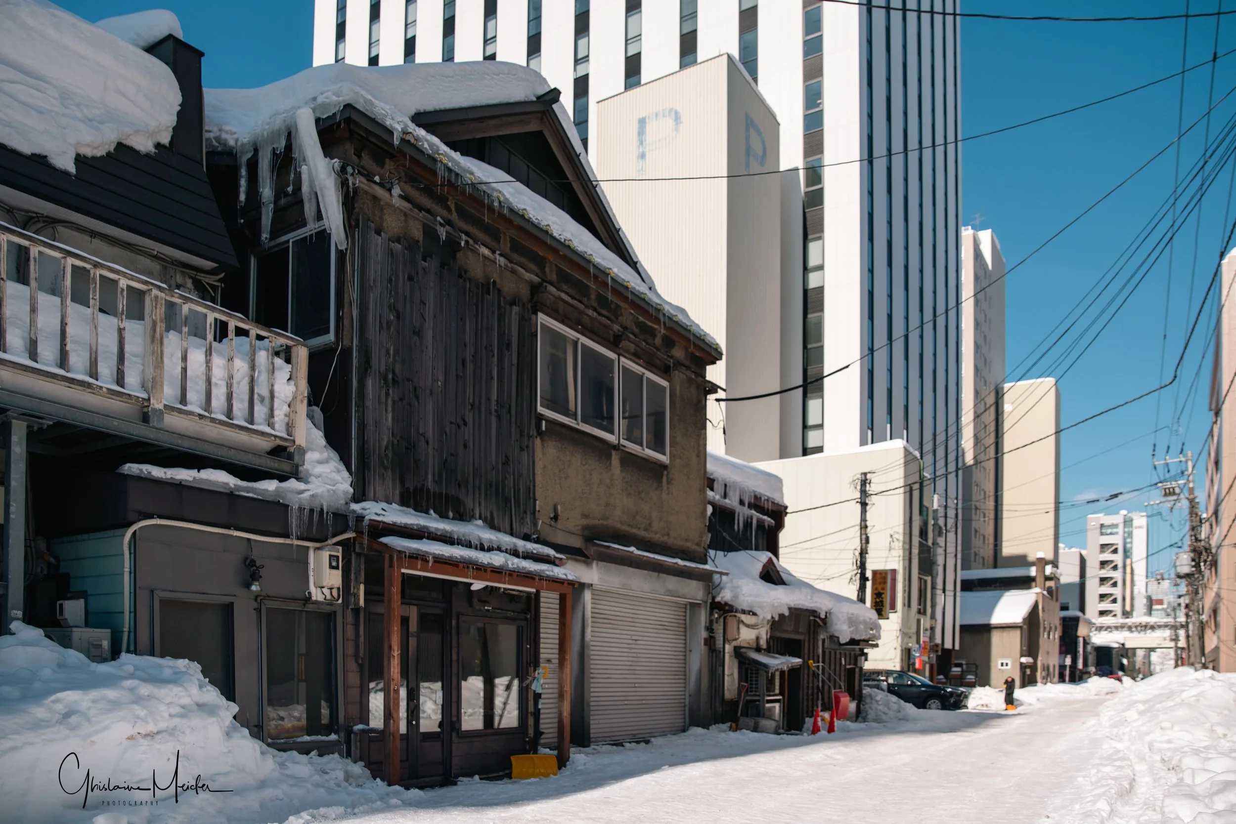 L’architecture rigoureuse de la ville et les températures glaciales, nous donnent l’impression d’être en Russie plutôt qu’au Japon. Heureusement, il persiste un vieux quartier, le quartier Suehirosha, fidèle à l’image que l’on se fait du Japon, avec ses ruelles faiblement éclairées, encombrées de fils électriques, ses restaurants reconnaissables grâce aux petits rideaux accrochés à l’entrée en guise d’enseigne (on les appelle des noren), les fenêtres éclairées, les nombreux distributeurs de boissons dans des endroits improbables, des parkings éclairés uniquement par le distributeur…