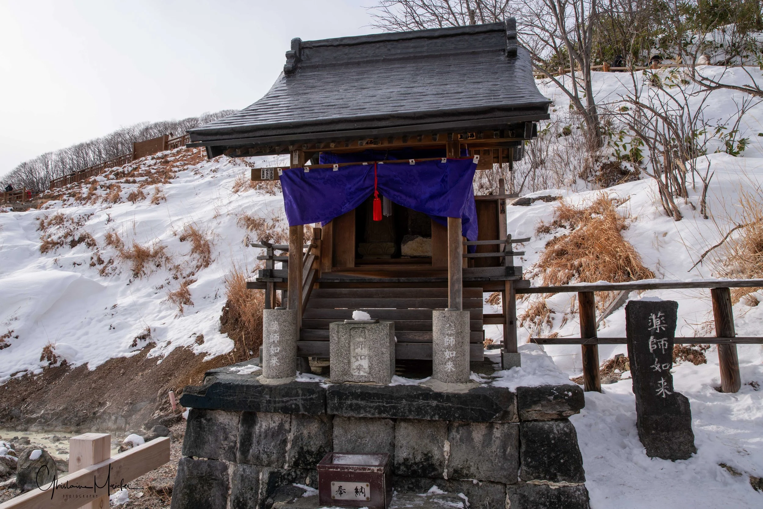 Avec son paysage lunaire aux odeurs de souffre, la vallée de l’enfer porte bien son nom. C’est un lieu incontournable, mais la majorité des sentiers sont fermés à cause de neige, ce qui nous empêche d’explorer le lieu. Nous profitons malgré tout de l’odeur caractéristique et nous bravons les démons Oni, protecteurs de la montagne, jalonnant le site et rappelant aux visiteurs qu’ici, on respecte avant tout la force des éléments.