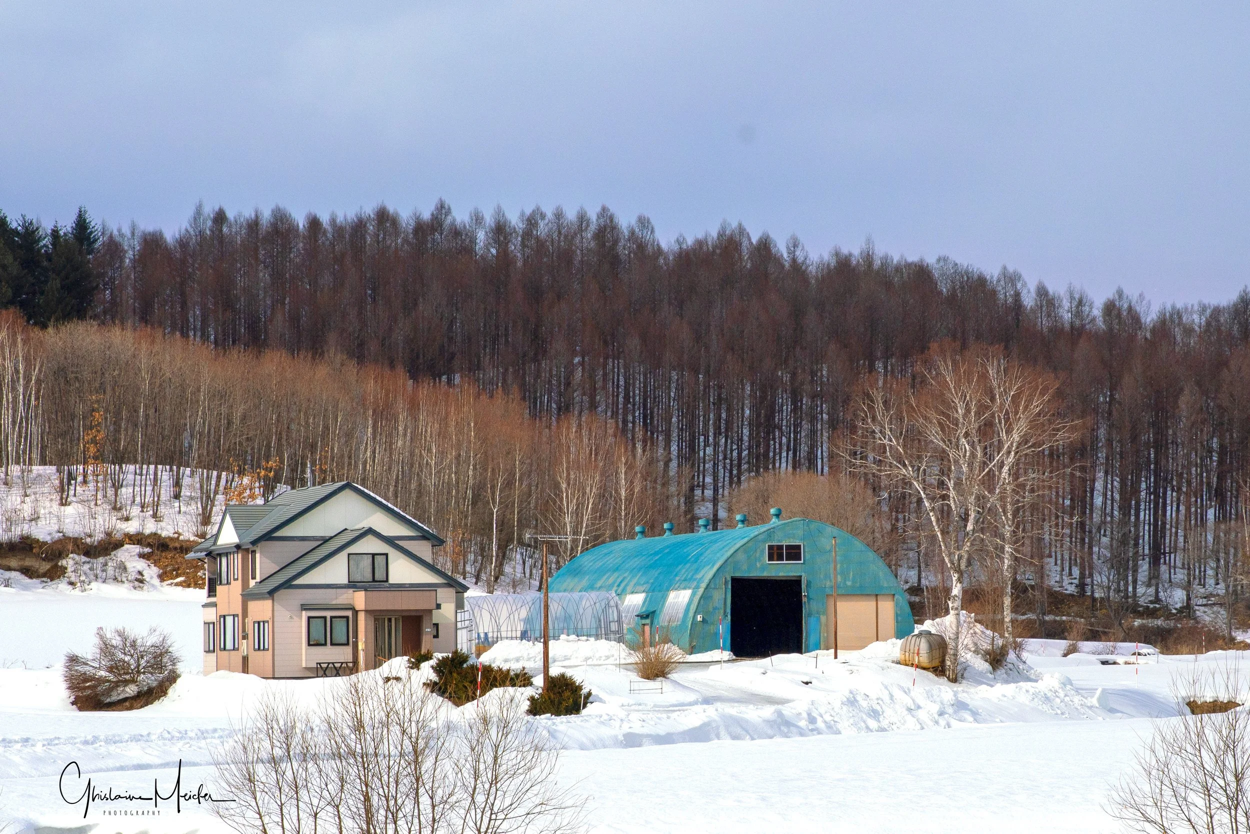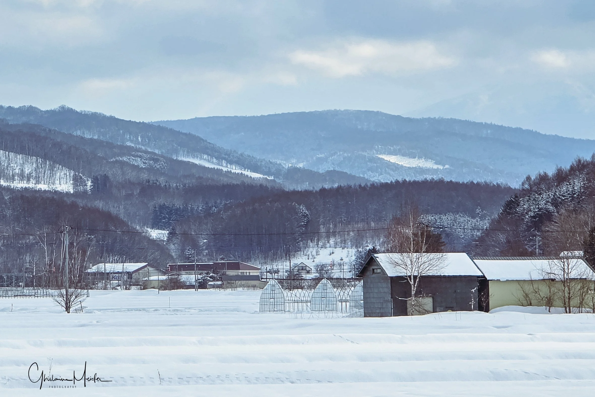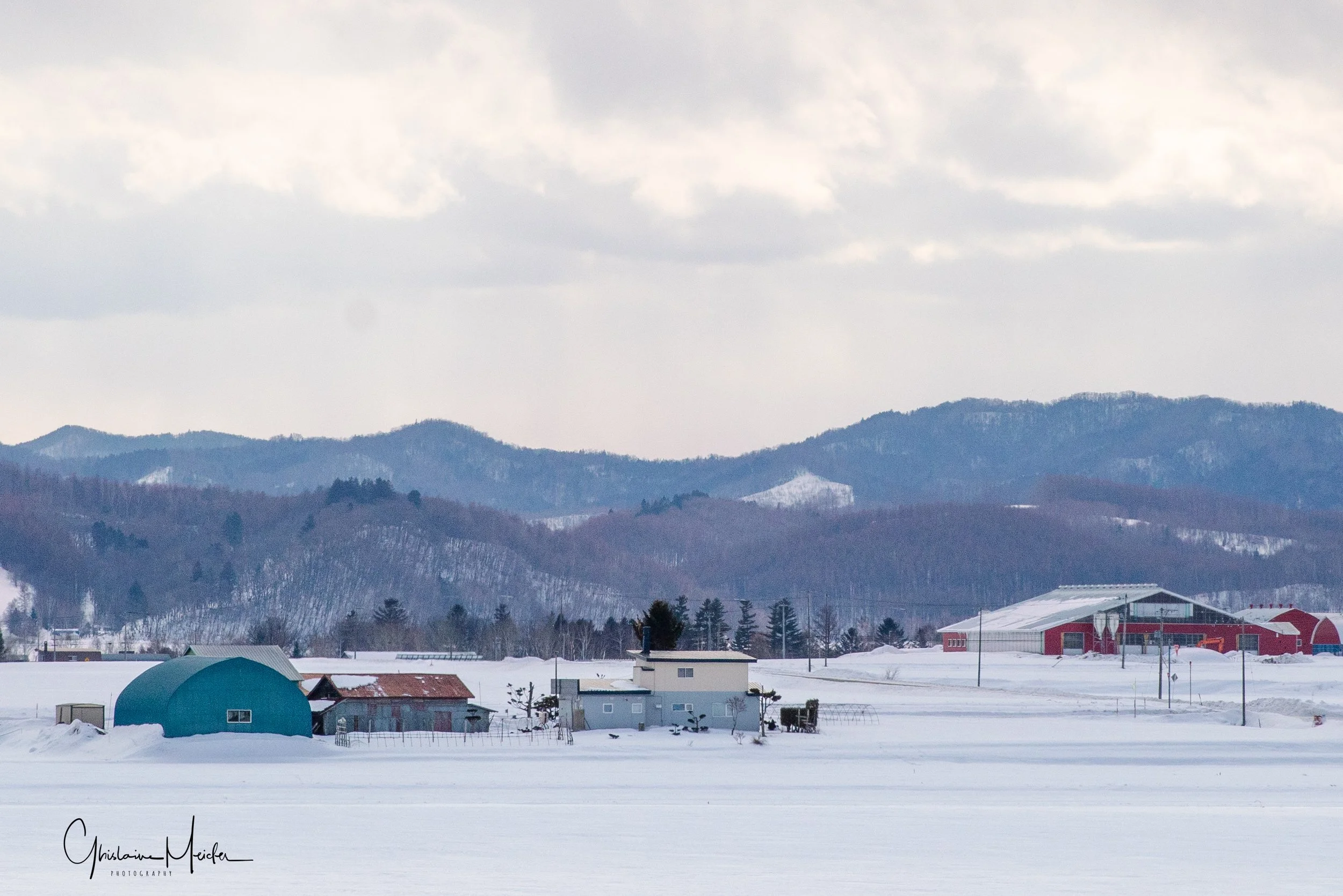 En s’éloignant de la côte, on arrive dans une région très agricole, comme le prouvent ces immenses étendues de neige recouvrant les champs de culture, et ces nombreuses fermes aux toits colorés. Contraste entre les zones surpeuplées du Sud du Japon, et ces zones agricoles où la densité ne dépasse pas les 37 habitants au Km2.