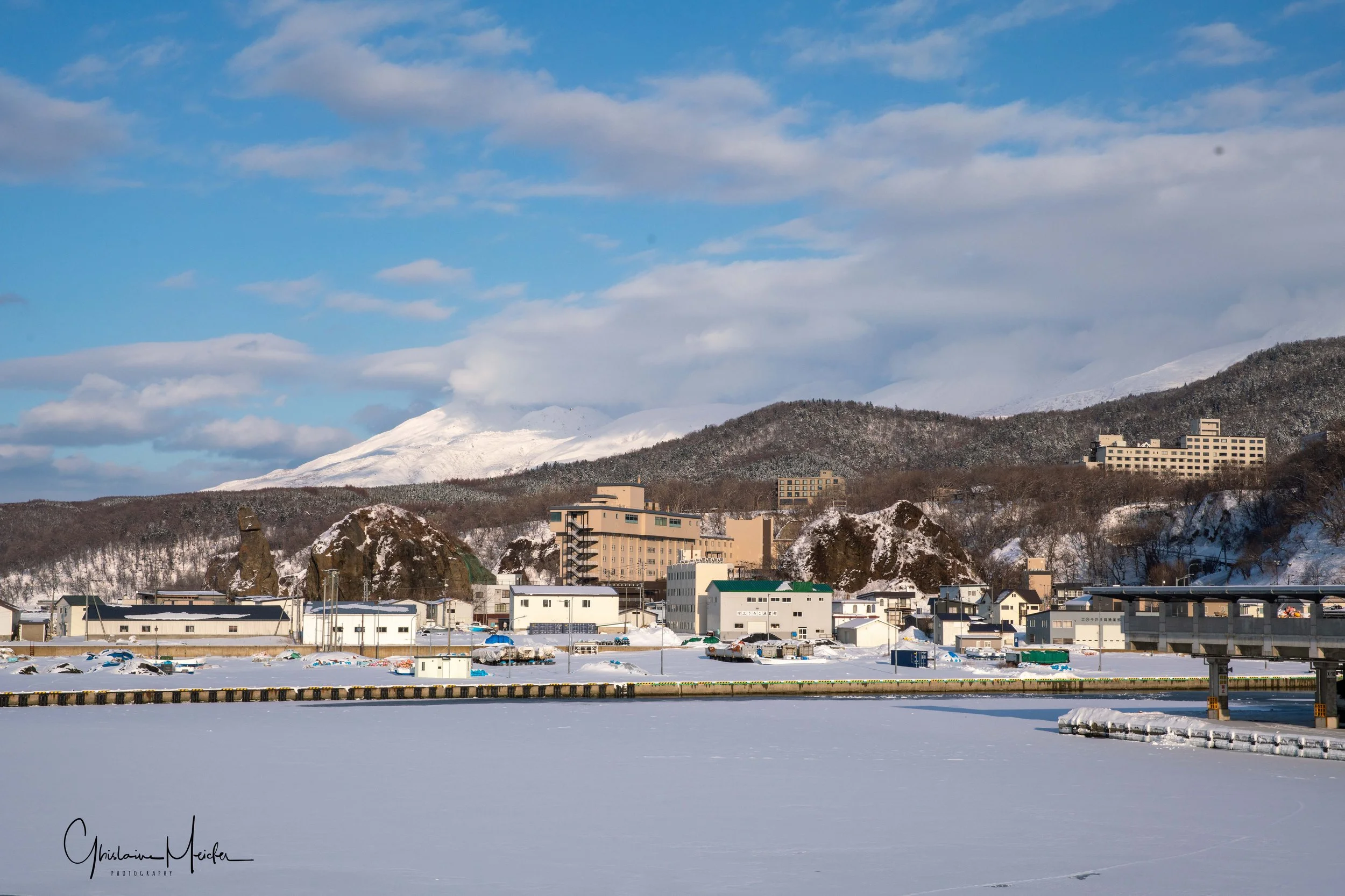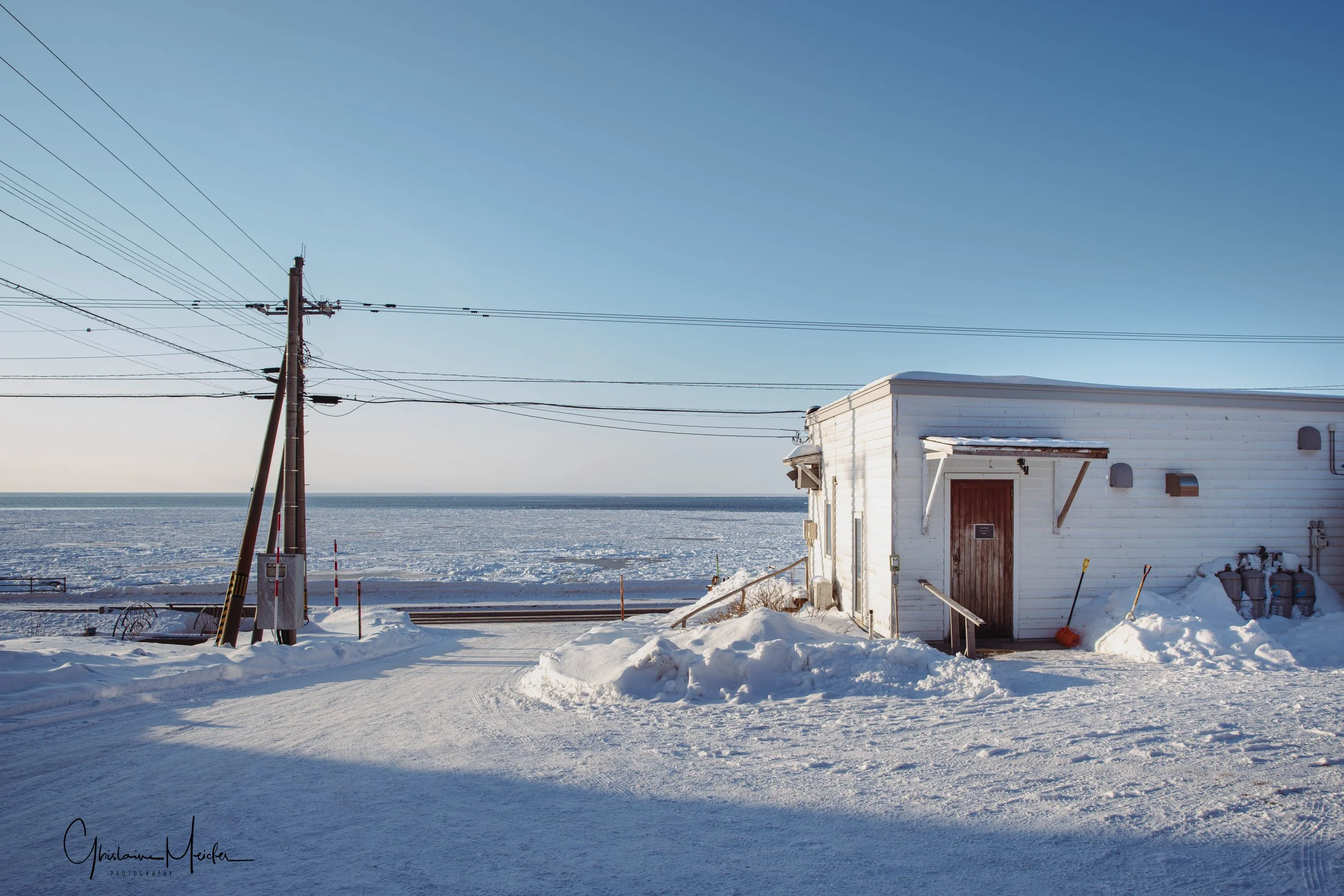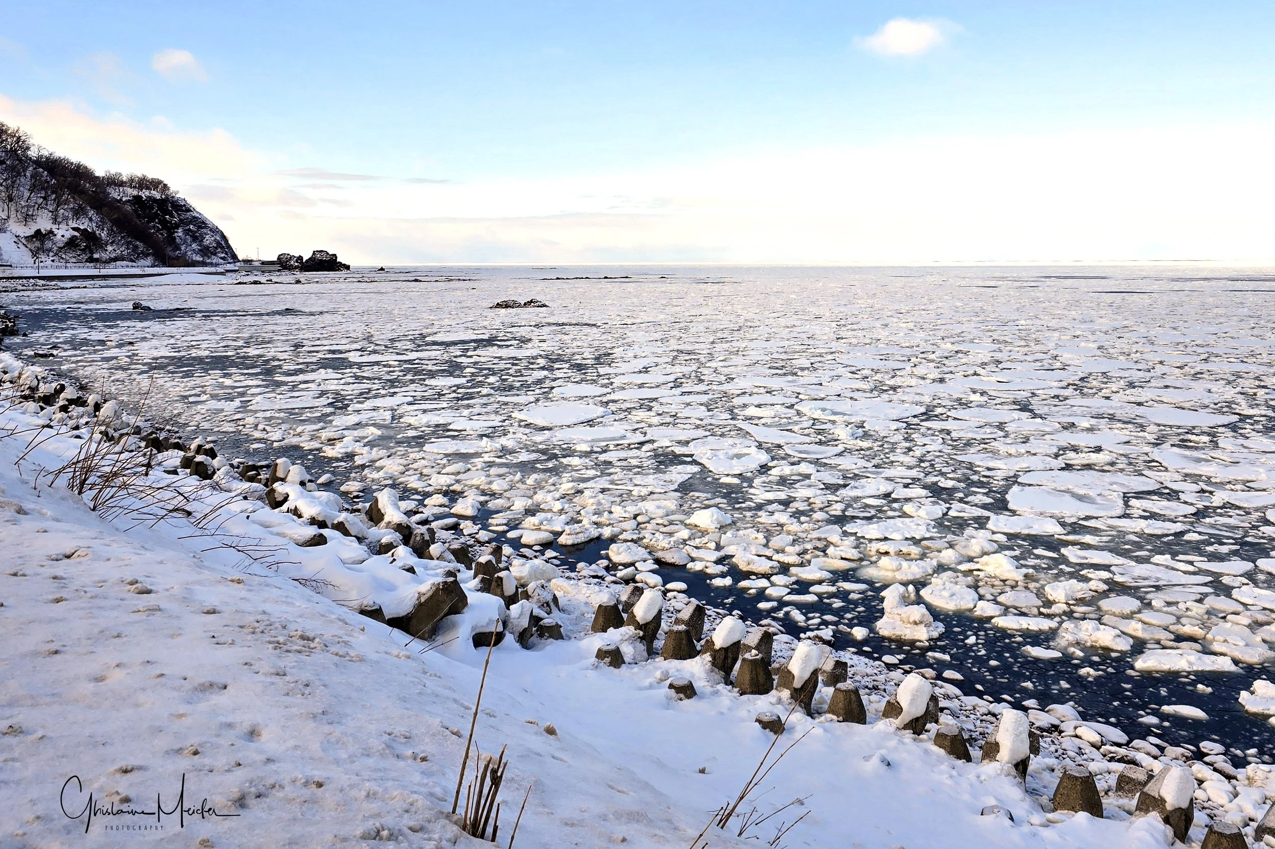 Petit détour pour nous rendre sur la côte, près de l’embouchure de la rivière Tokachi, qui se transforme en hiver en une galerie scintillante d’œuvres d’art naturel, connues sous le nom de bijoux de glace. Ces formations de glace sont crées lorsque la glace, formée dans la rivière, se jette dans l’Océan Pacifique. Malheureusement, les températures n’étant pas suffisamment basses, il n’y a plus aucun blocs de glace sur la plage; juste un petit survivant que nous avons quand même pris en photo