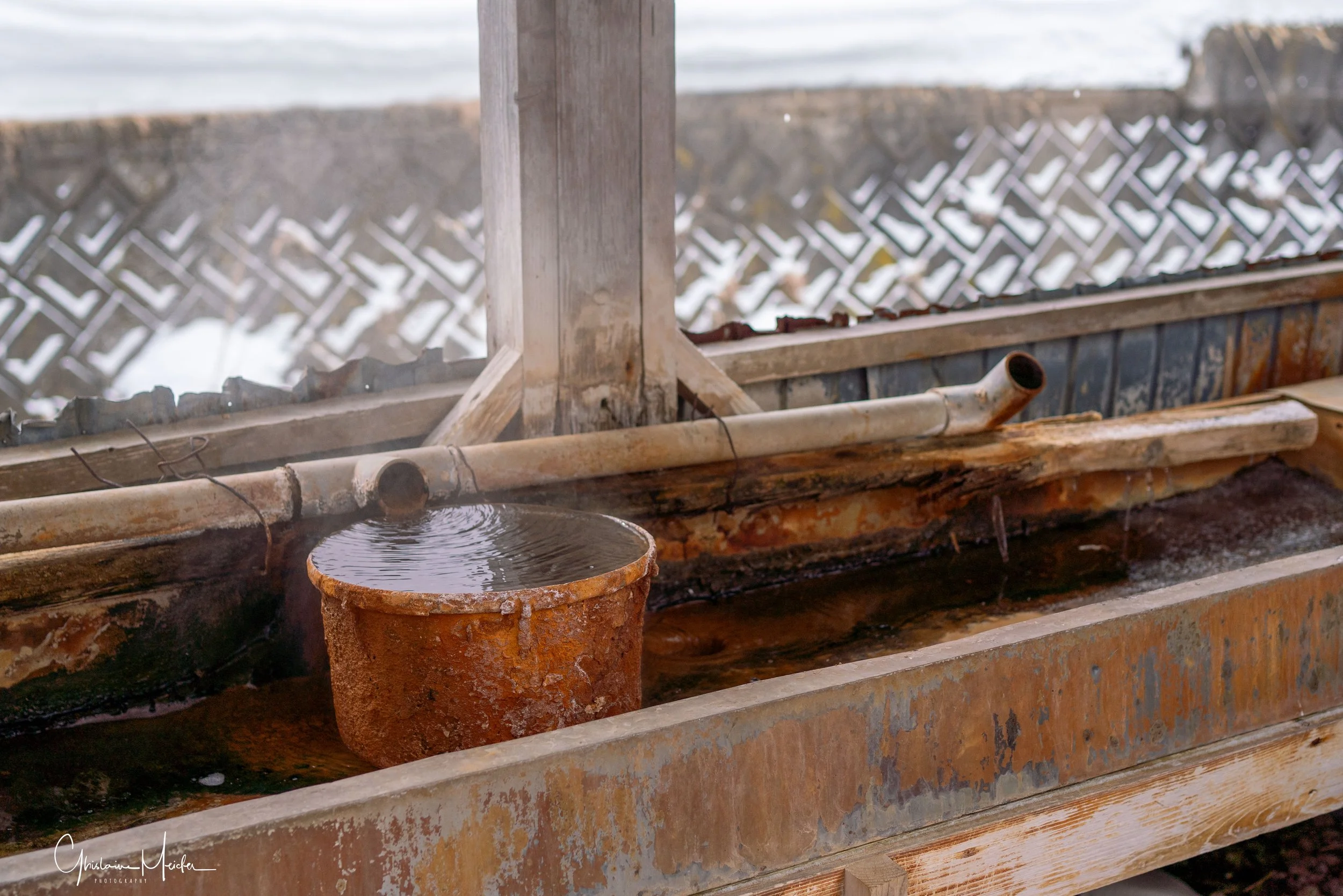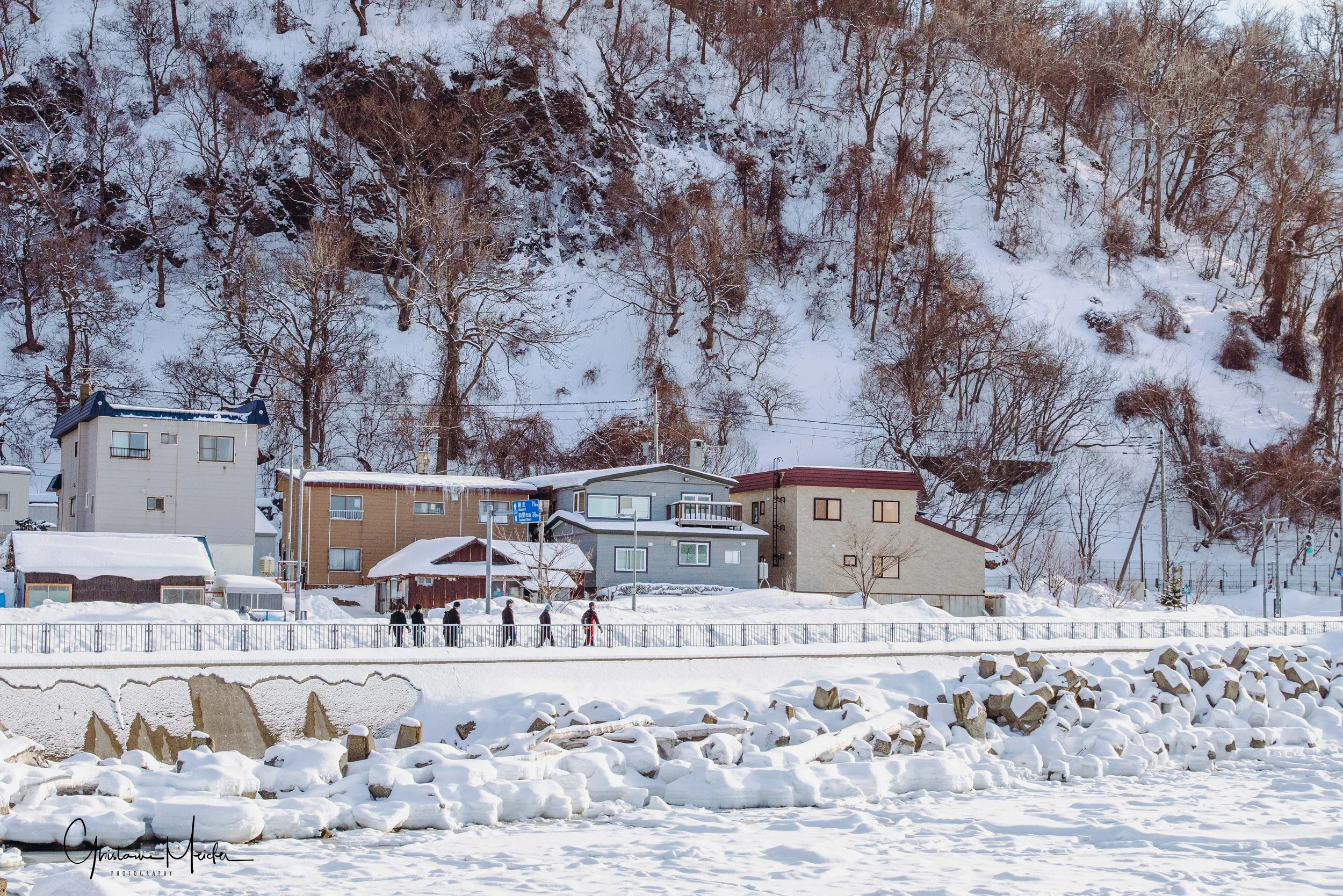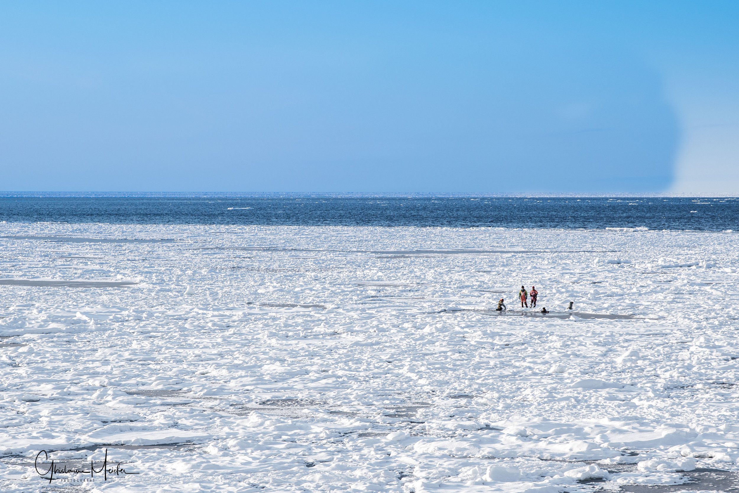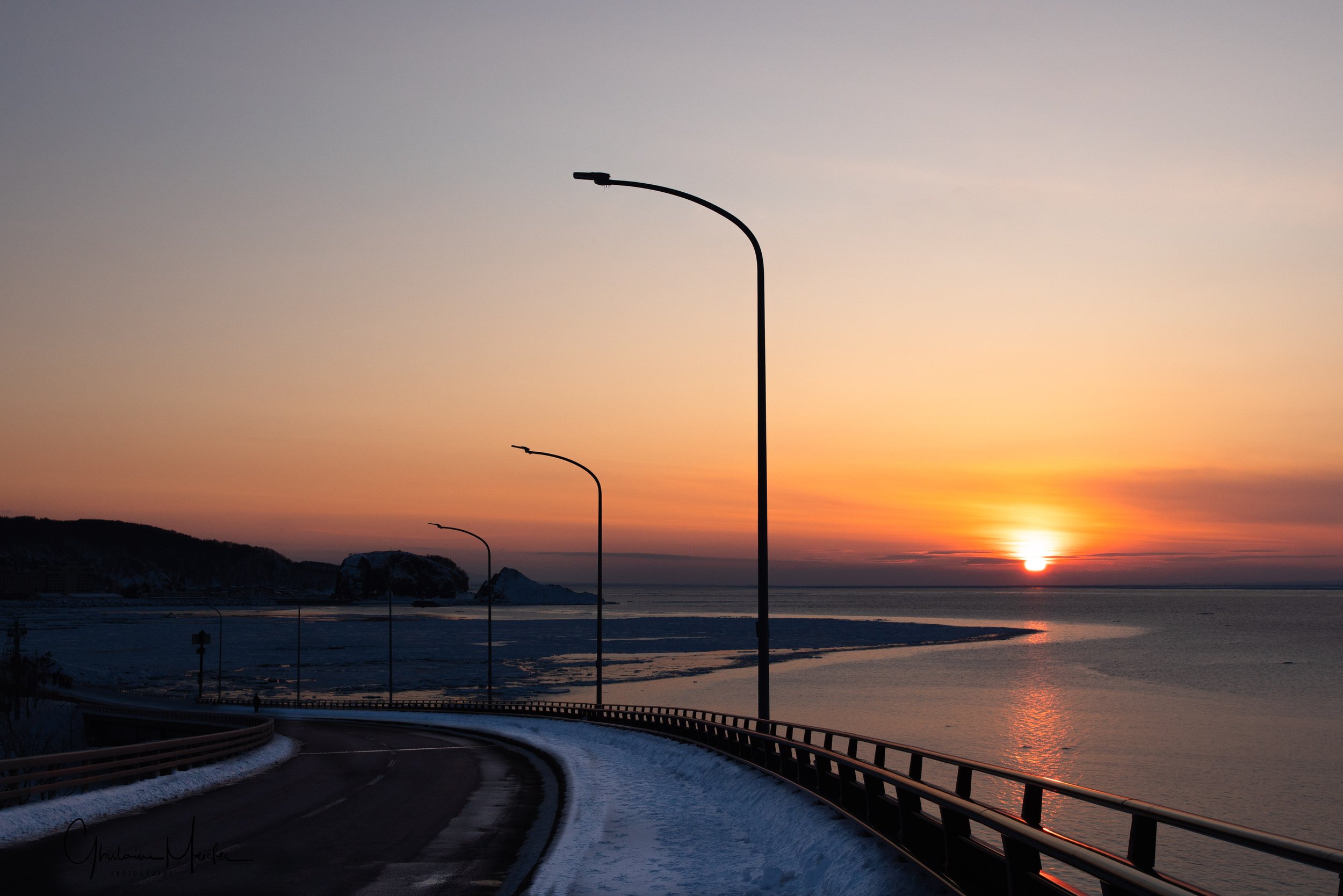 Petit détour pour nous rendre sur la côte, près de l’embouchure de la rivière Tokachi, qui se transforme en hiver en une galerie scintillante d’œuvres d’art naturel, connues sous le nom de bijoux de glace. Ces formations de glace sont crées lorsque la glace, formée dans la rivière, se jette dans l’Océan Pacifique. Malheureusement, les températures n’étant pas suffisamment basses, il n’y a plus aucun blocs de glace sur la plage; juste un petit survivant que nous avons quand même pris en photo