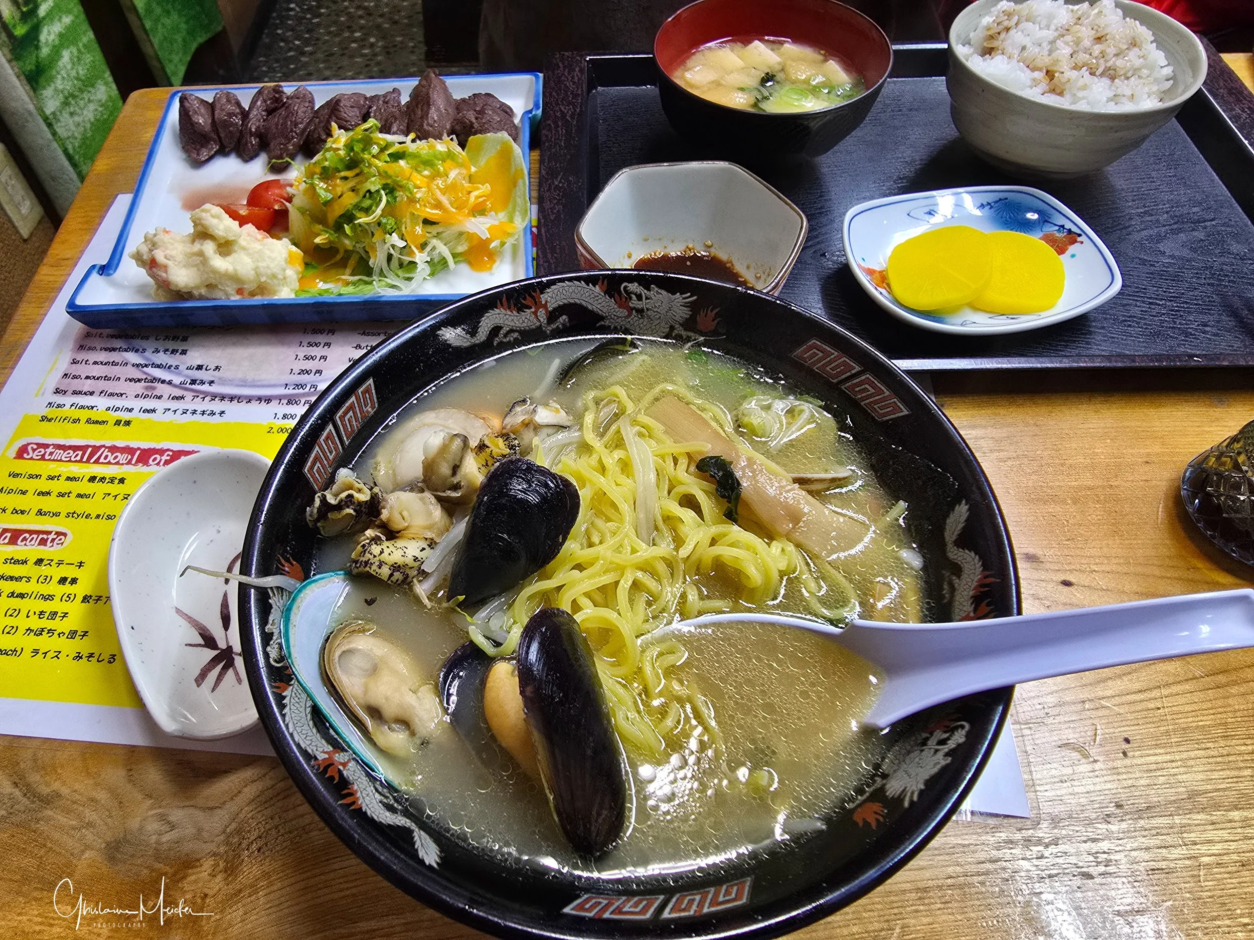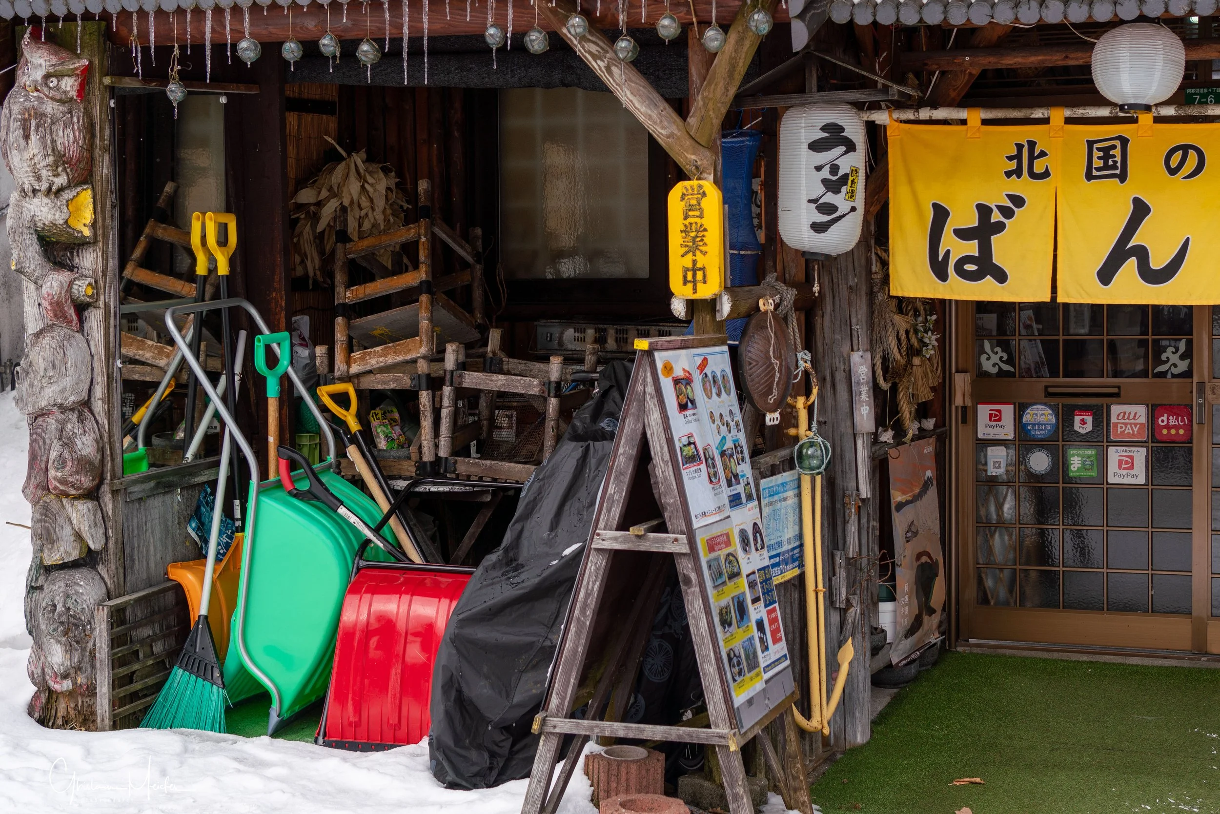 Déjeuner avec un excellent ramen aux fruits de mer dans un petit restaurant tenu par un aïnou qui semble un artiste connu de la communauté, au vu des nombreuses affiches qui placardent les murs (j’ai oublié de faire une photo mais on les voit sur la vidéo))