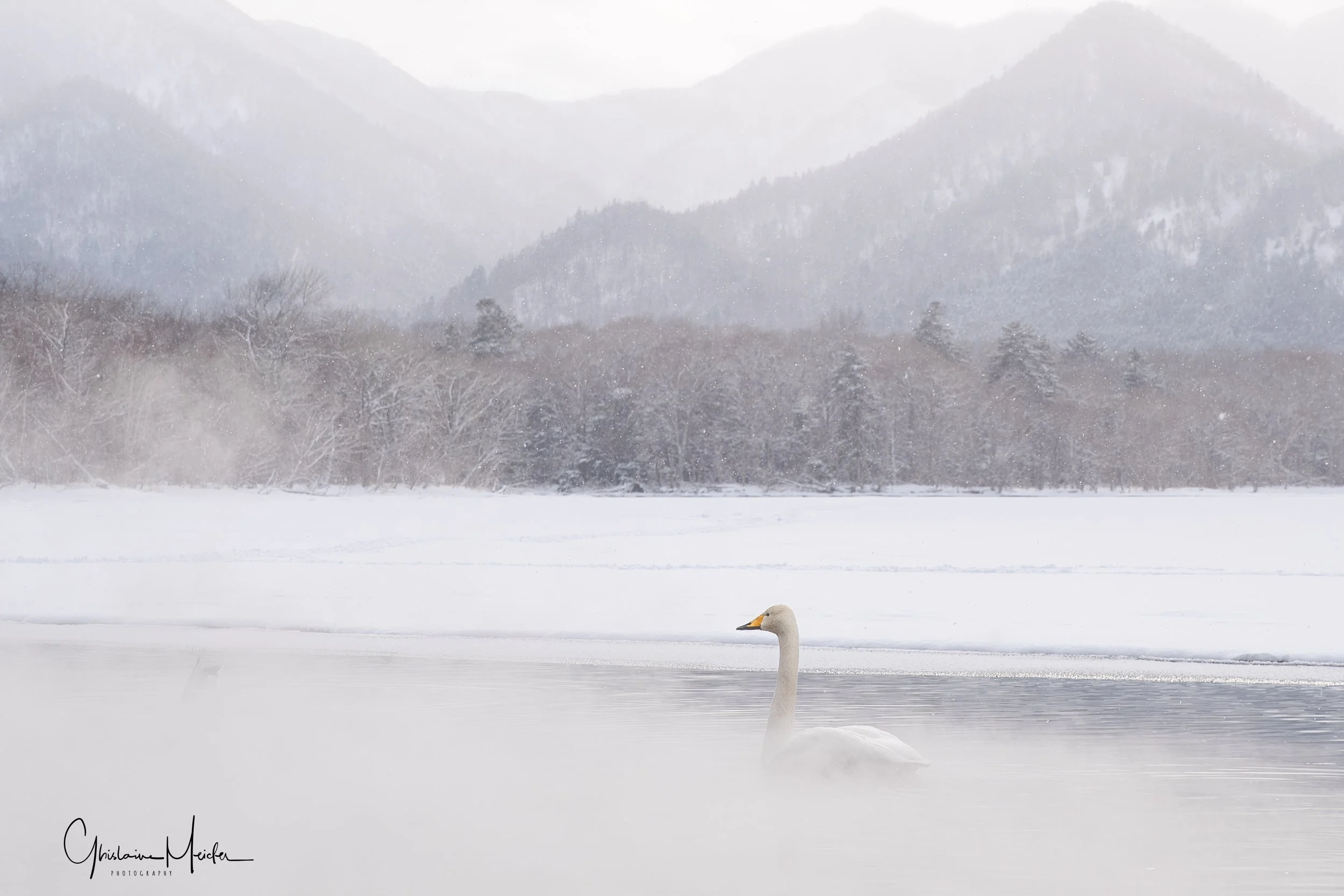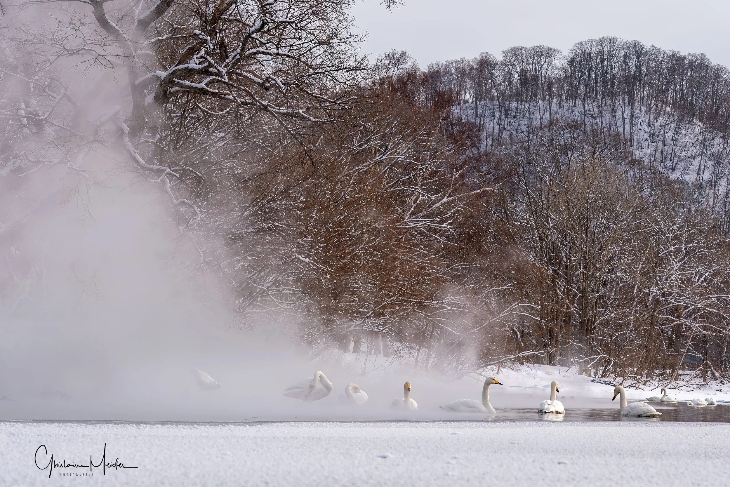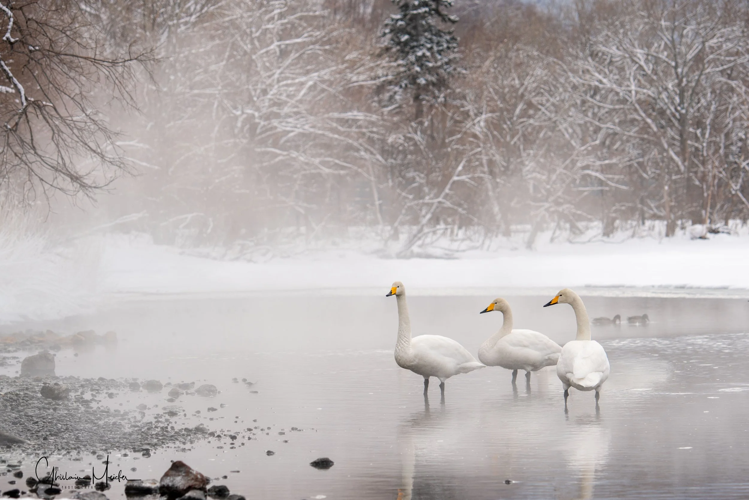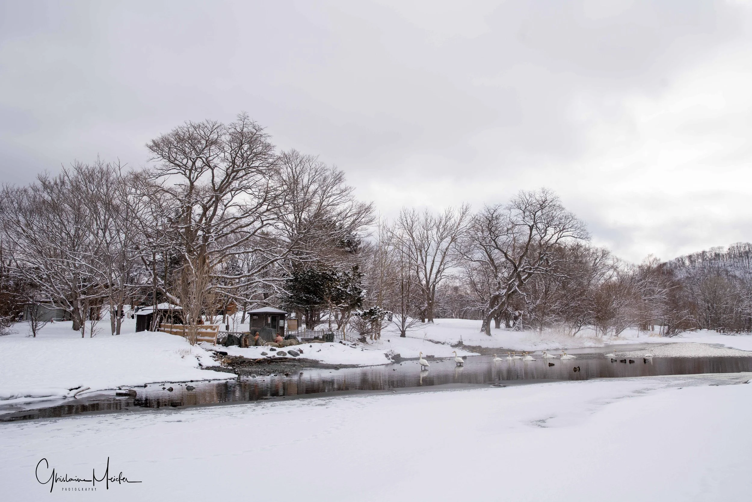 Ensuite nous nous rendons vers un autre lac dans les environs pour aller observer les cygnes chanteurs, également très gracieux et d’une grande douceur. iIs profitent des sources d’eau chaude durant l’hiver, sous les yeux des habitants venant profiter de l’ onsen situé juste à coté. Le cygne chanteur doit son nom à ses nombreuses vocalisations, il est en effet assez bruyant et émet régulièrement des sons et ce n’est qu’en hiver que le cygne chanteur peut être observé à Hokkaido.