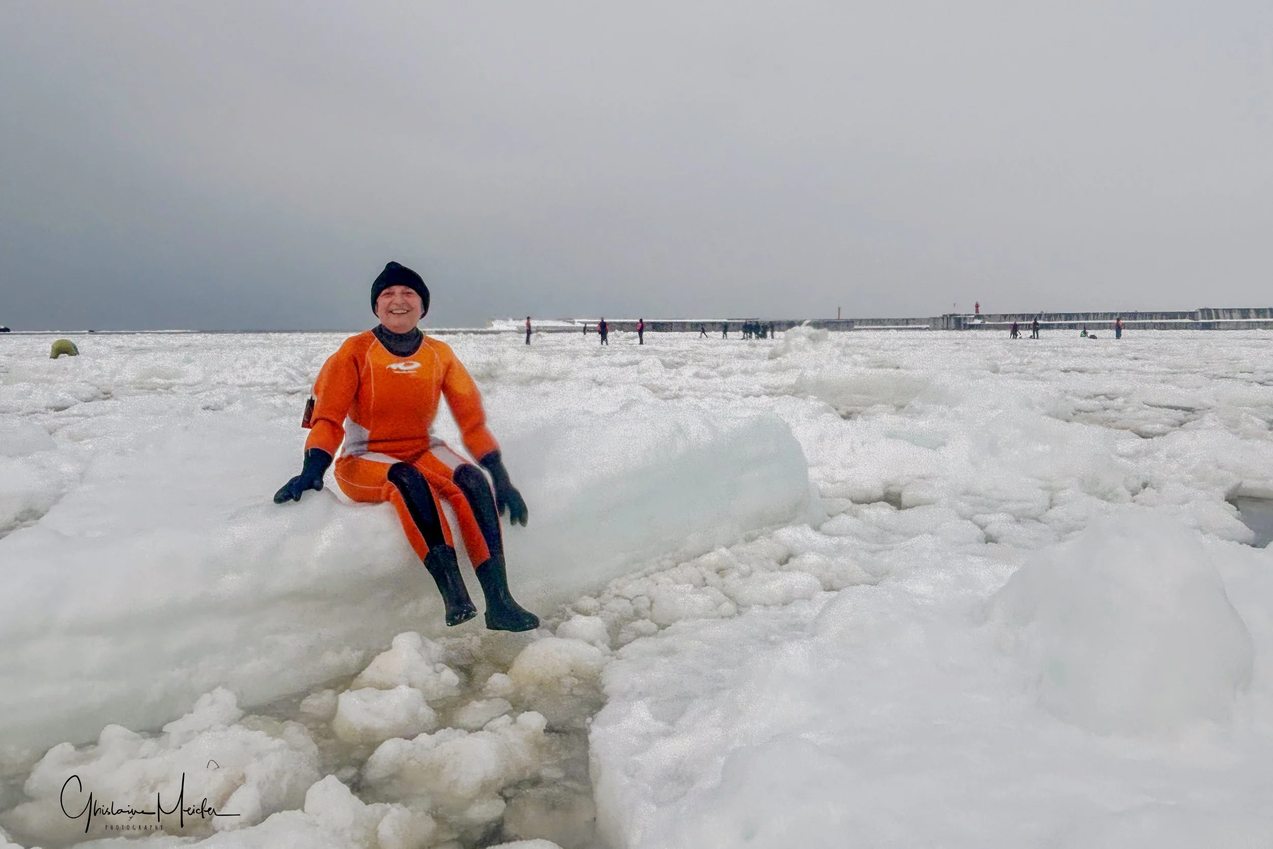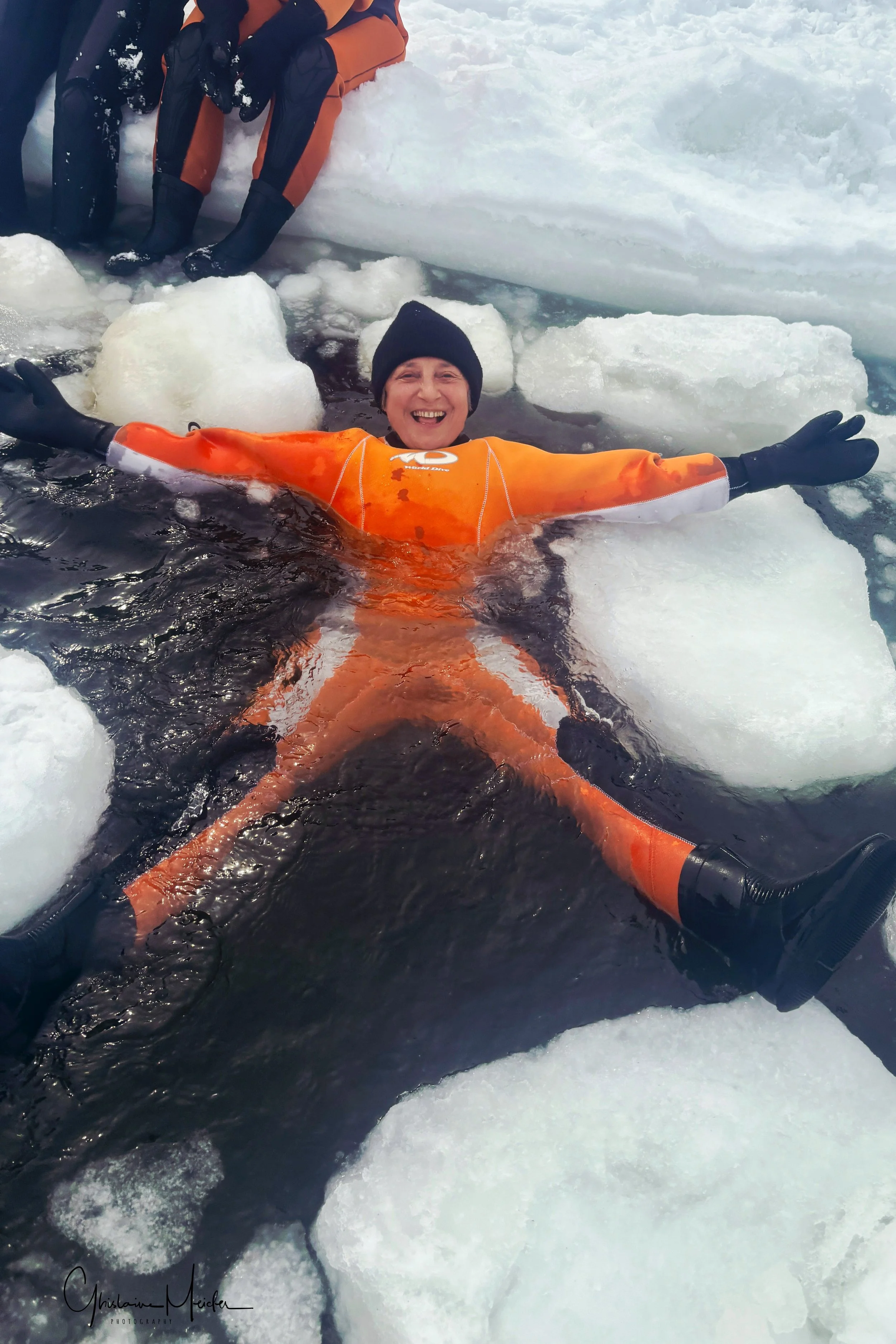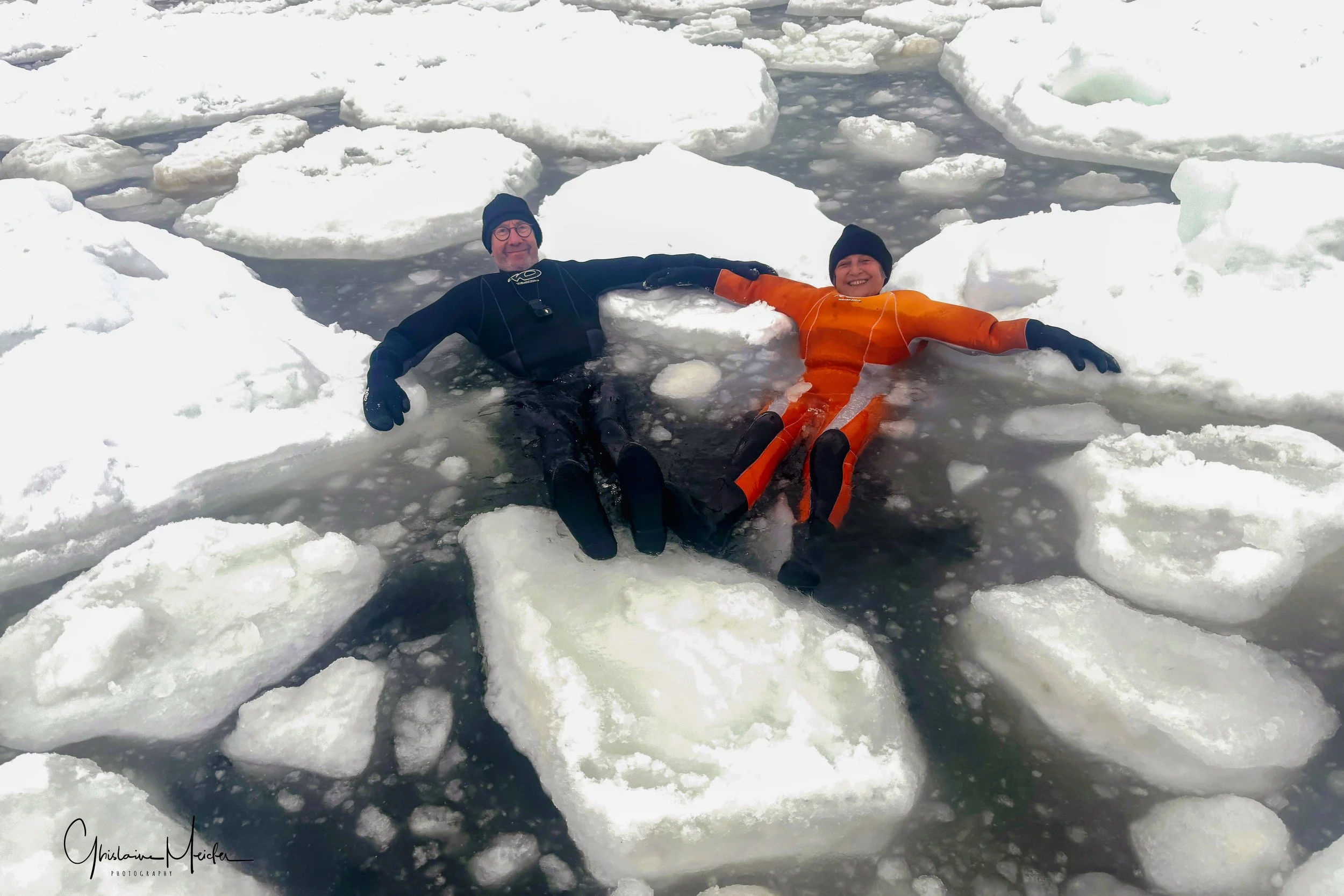Nous allons cependant pouvoir marcher sur la banquise avec des combinaisons étanches et sèches (l’eau est à -3 degrés) mais vu les conditions de glace, les blocs se sont détachés les uns des autres et sont devenus très instables. Nous allons pouvoir tester les équilibres ! De nombreuses chutes sont à déplorer dans l’eau et il faut veiller à ne pas se faire piéger par les blocs qui bougent et se rapprochent les uns des autres, risquant alors de nous emprisonner.