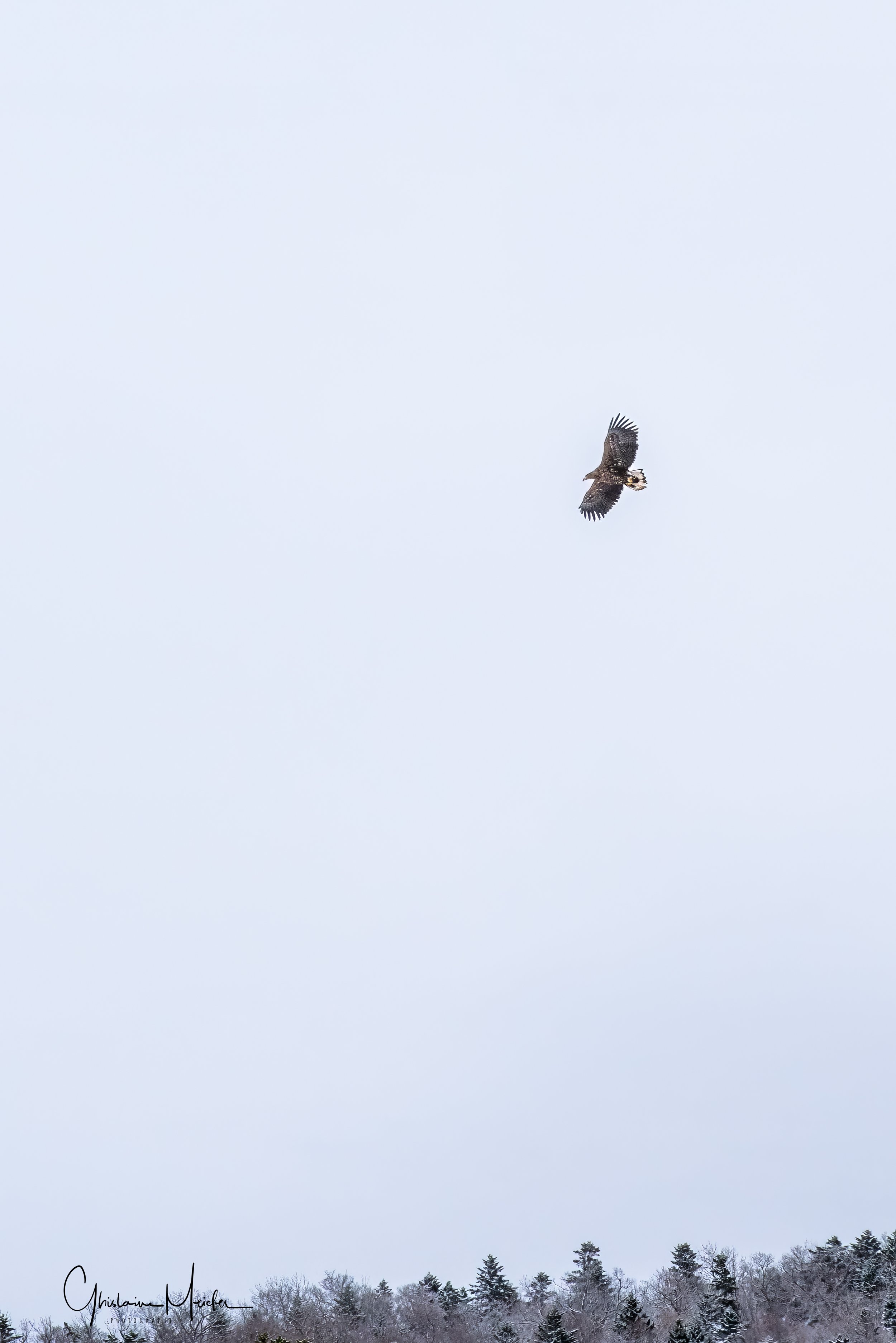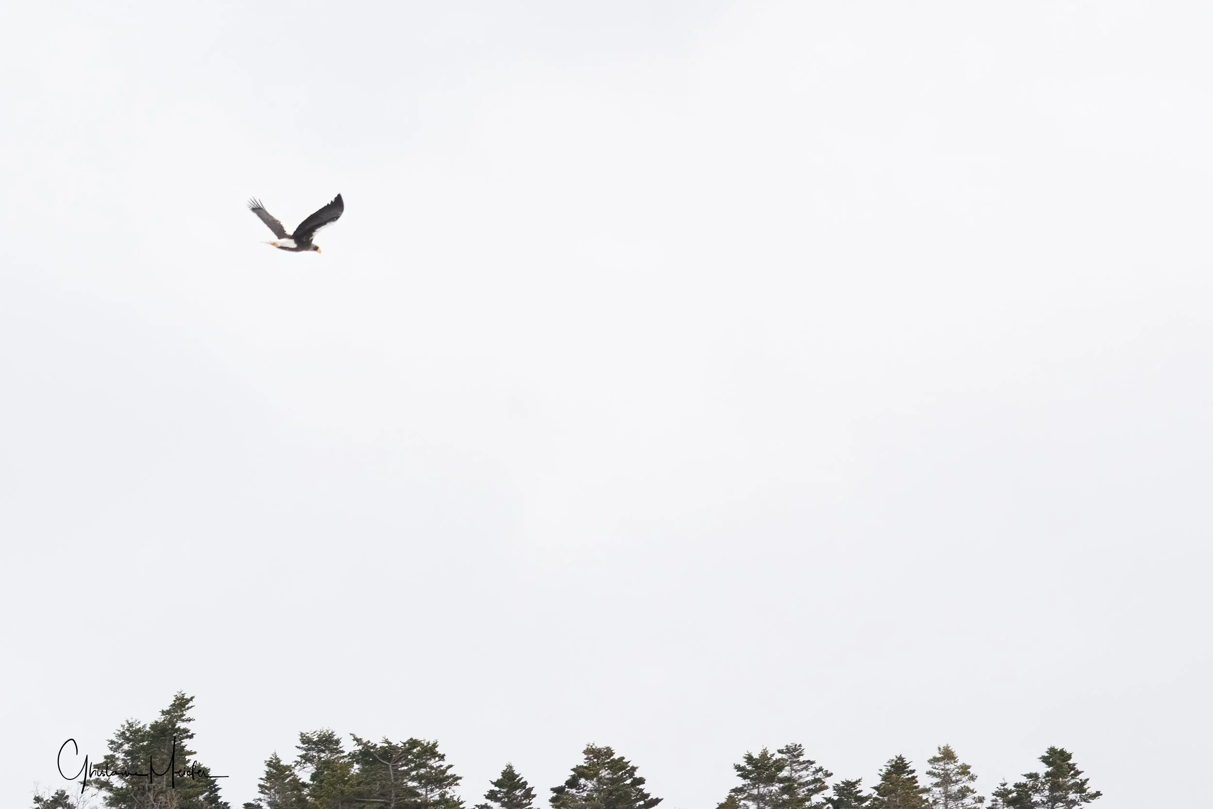 Alors que nous cherchons désespérément les aigles dans les arbres, au dessus de nos têtes, j’octroie une pause pour na nuque et me retourne vers la banquise pour photographier les marcheurs. Arrivée à la maison en regardant mes photos, je découvre qu’il y avait sur la glace un aigle, je ne l’avais pas vu. Quel dommage, il était tout près, facilement photographiable avec le 500mm!!