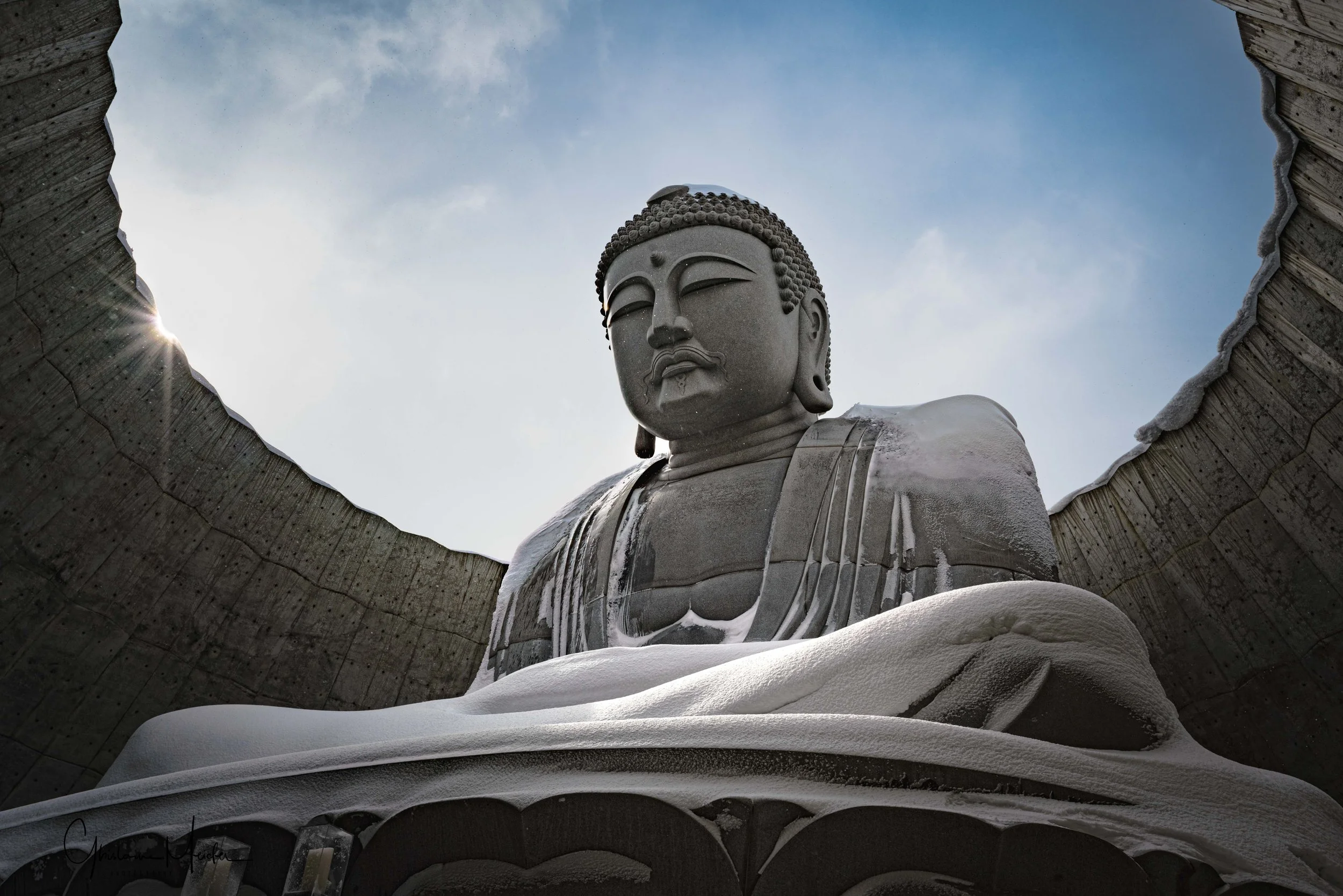 Le Bouddha, de 13 mètres de haut et de plus de 1500 tonnes, est entouré d’une colline de champs de lavandes, évidemment recouverte de neige, en ce moment. Toutefois, cette colline a une ouverture à son sommet, laissant dépasser le haut de la tête du Bouddha.